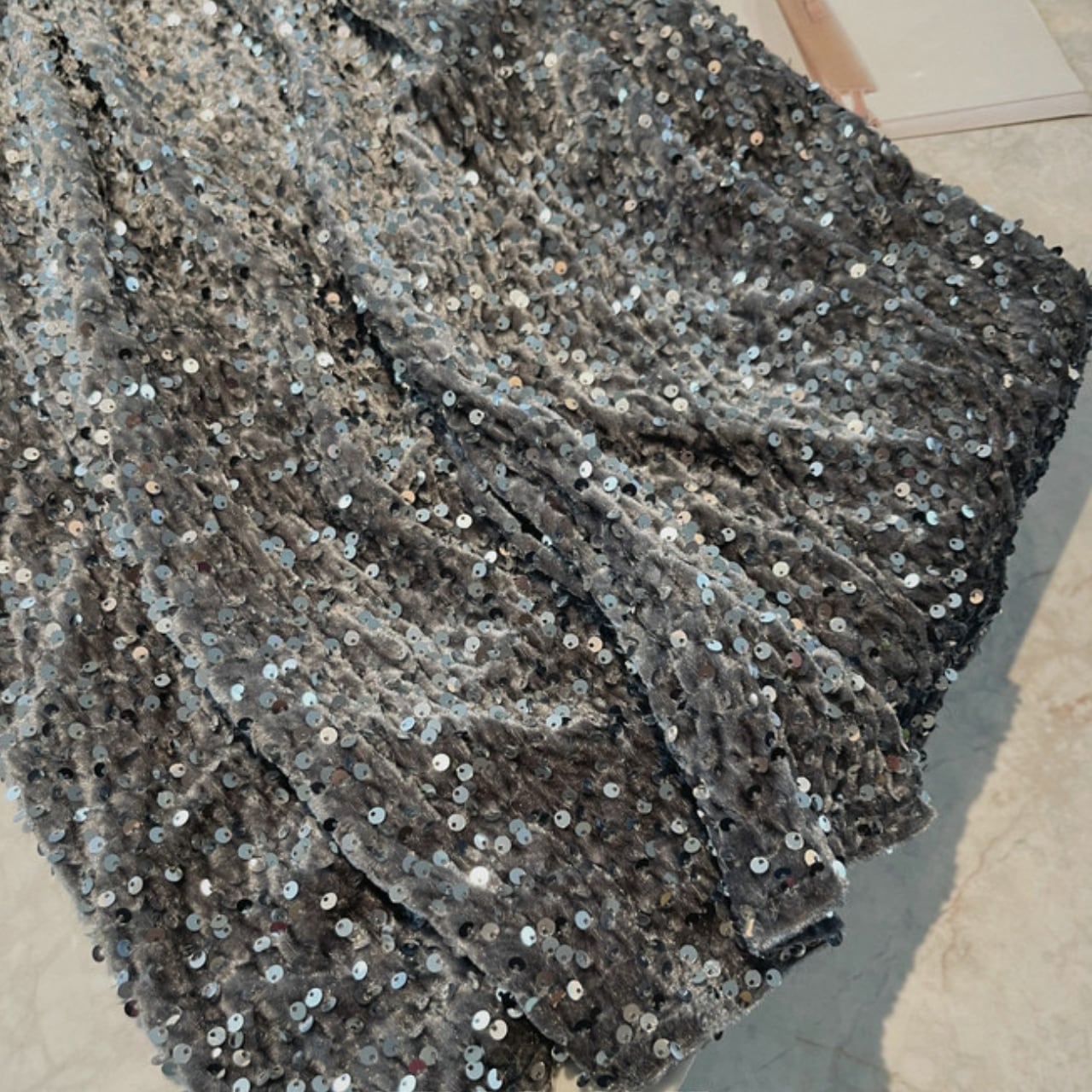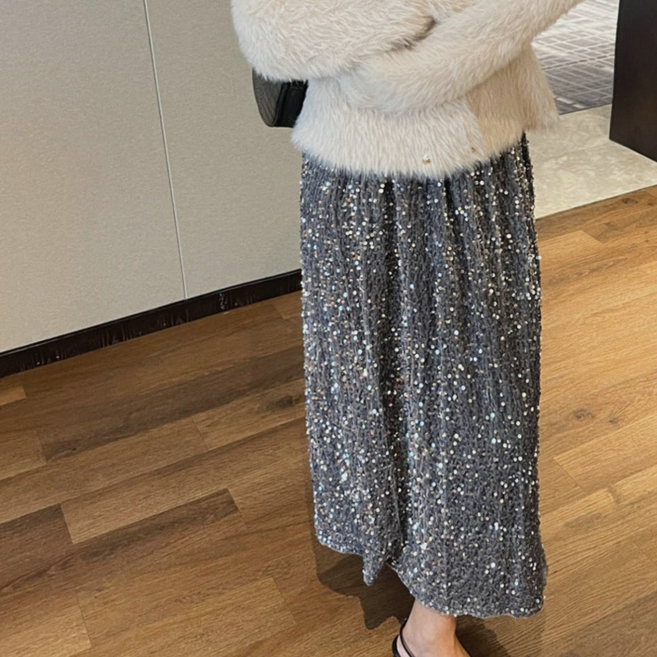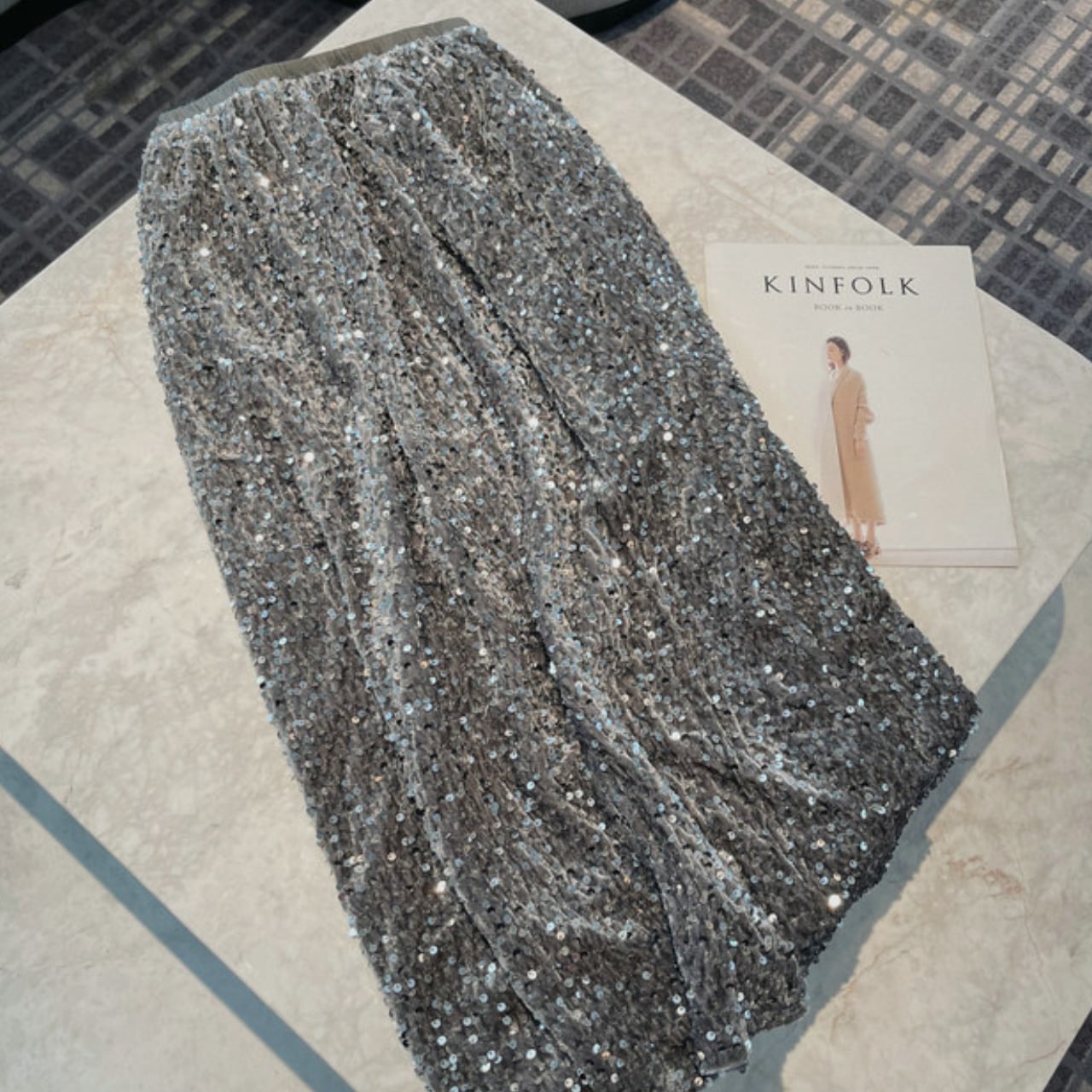 びっしりと敷き詰められたシルバースパンコールが、光を受けて美しく輝くロングスカート。