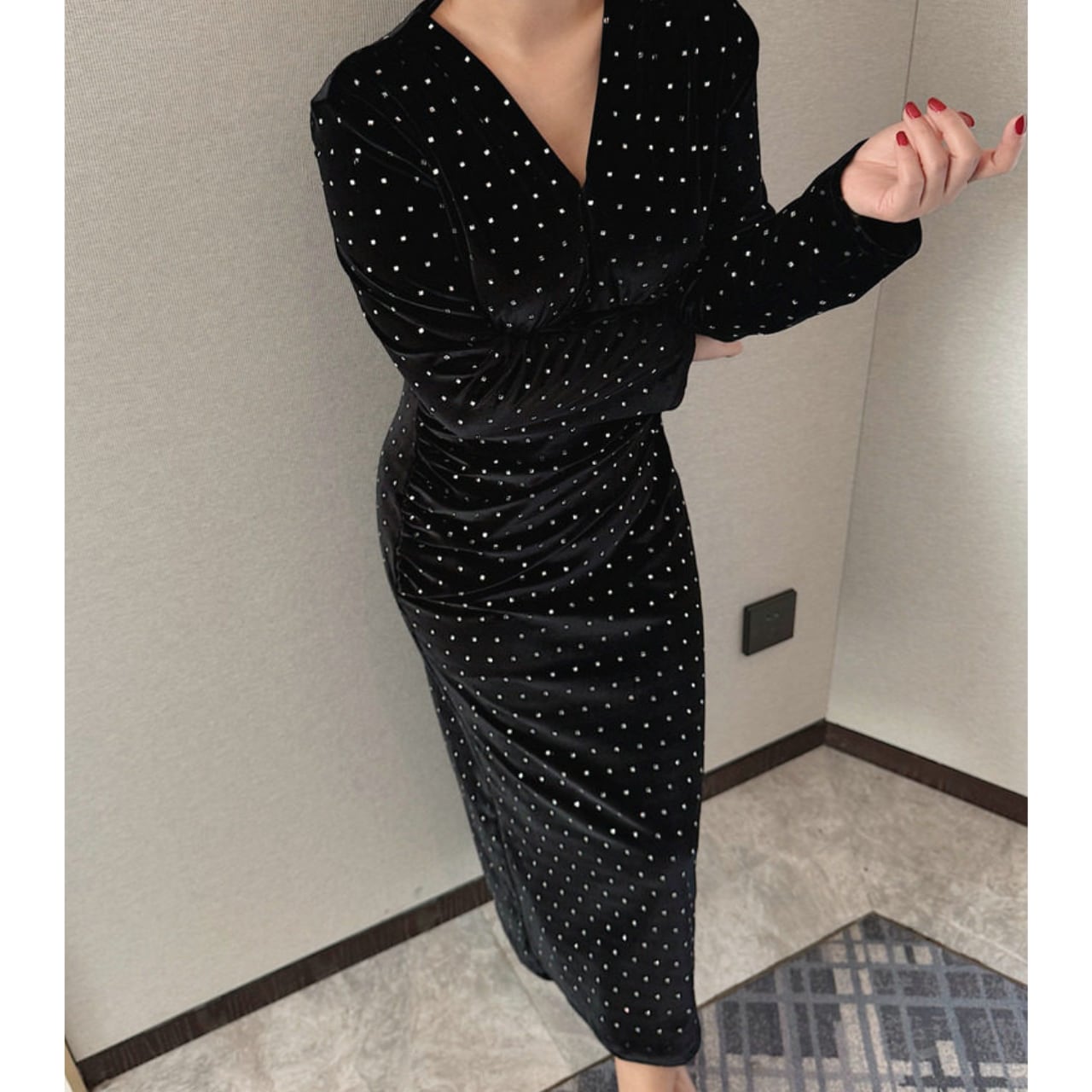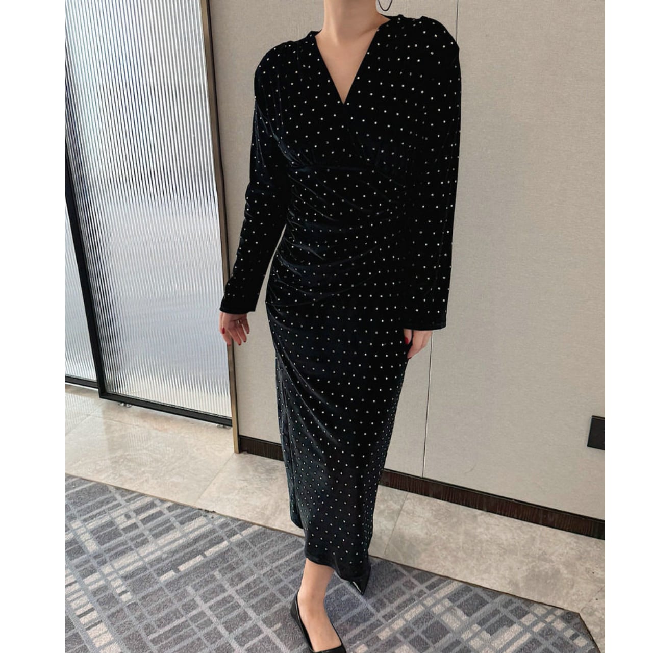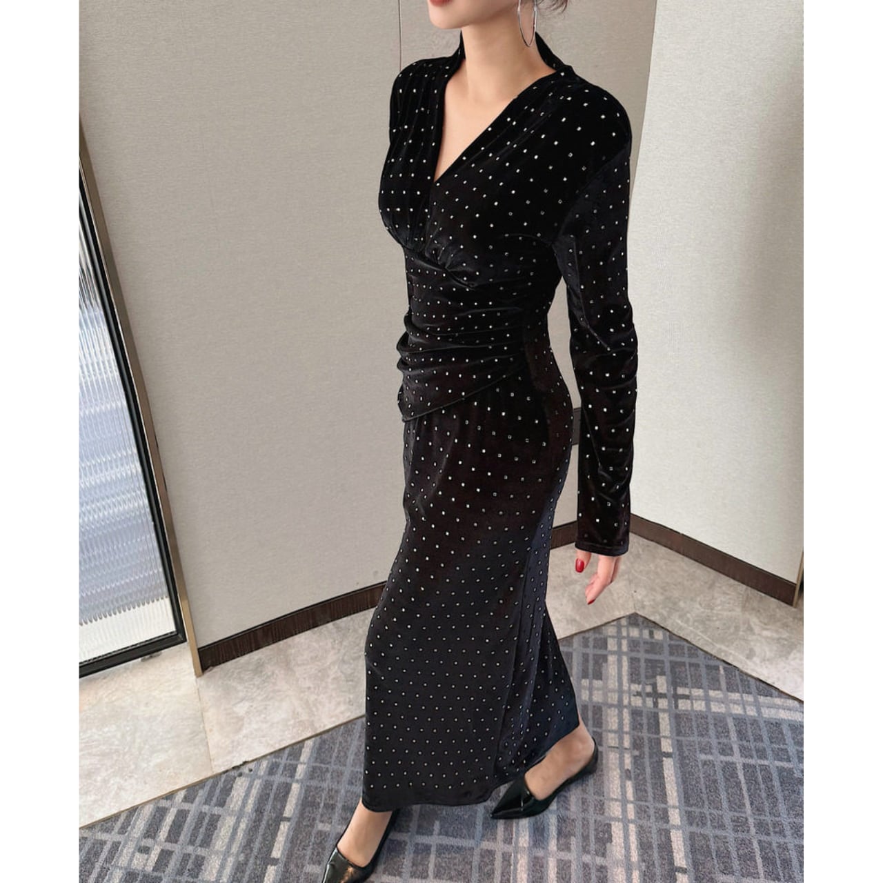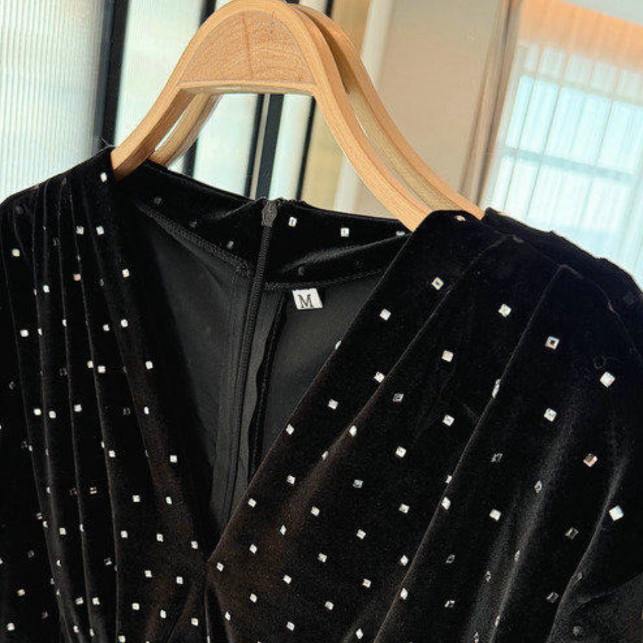 上質なベルベット素材に散りばめられた繊細なラインストーンが、まるで夜空の星のように煌めく特別な一着。