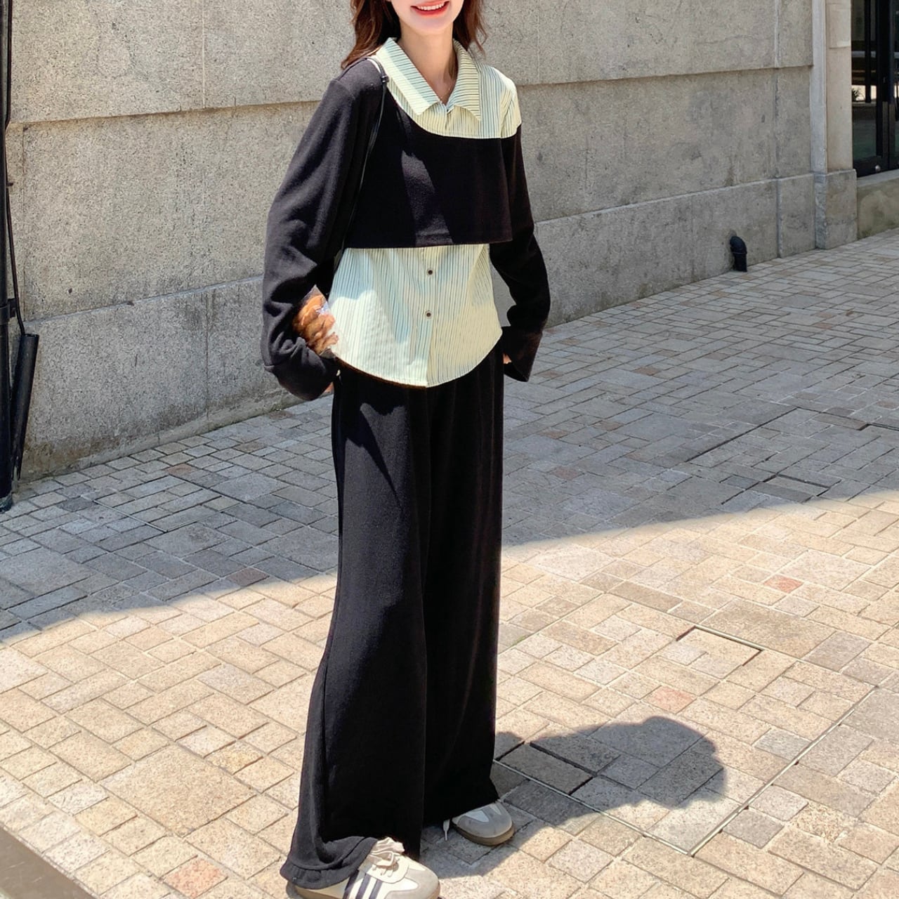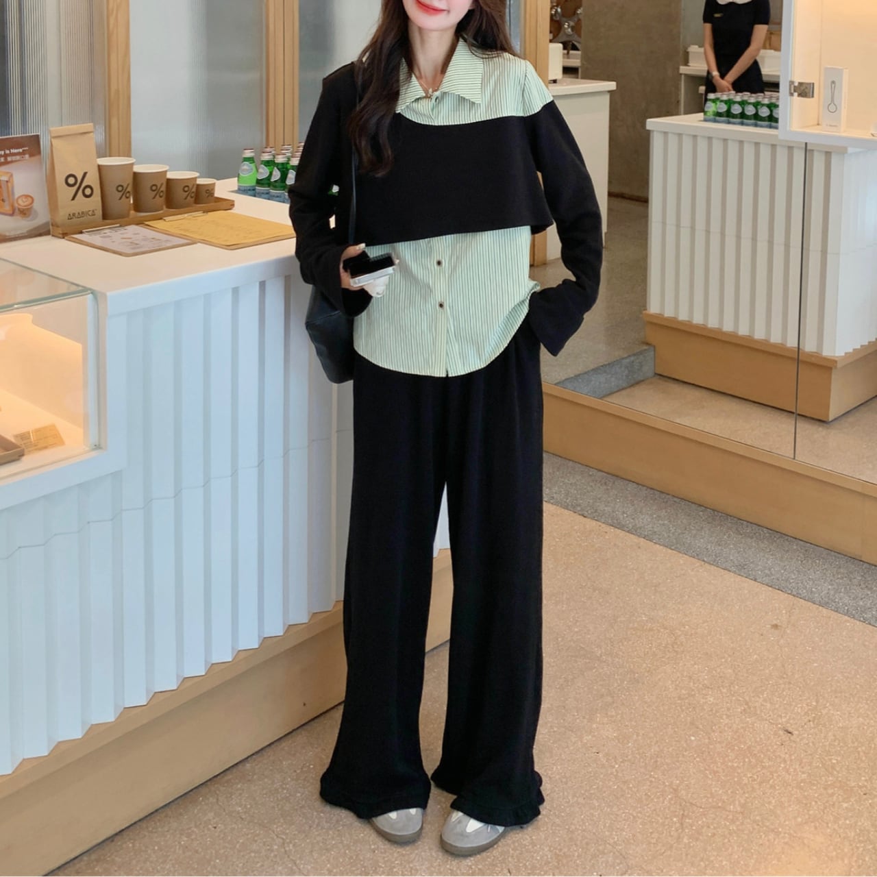ゆったりとした身幅とワイドパンツの組み合わせで、体型カバーも抜群のセットアイテムです。