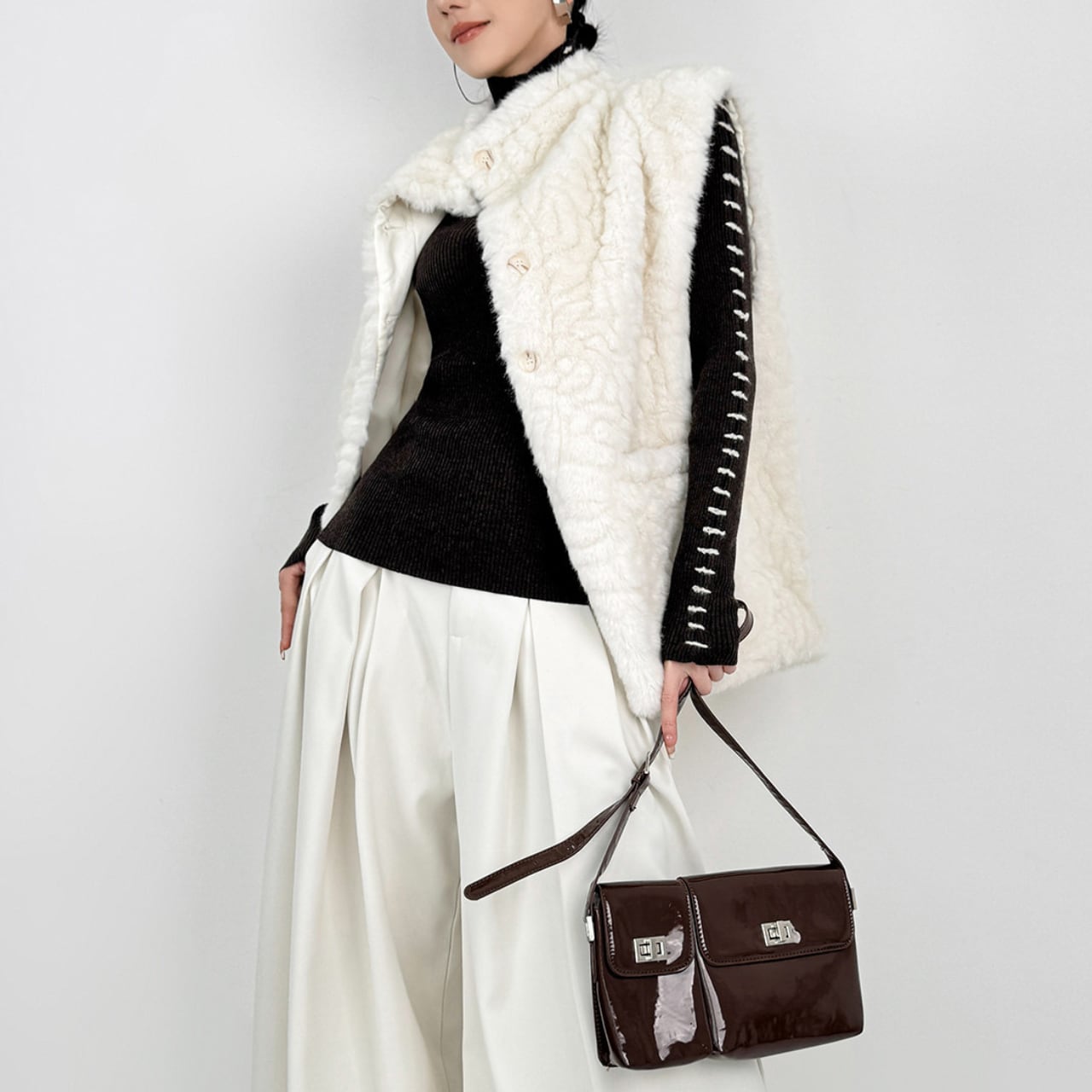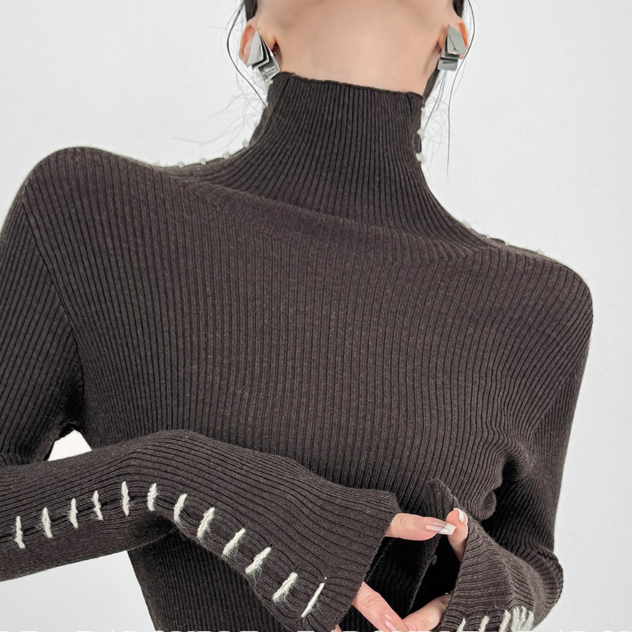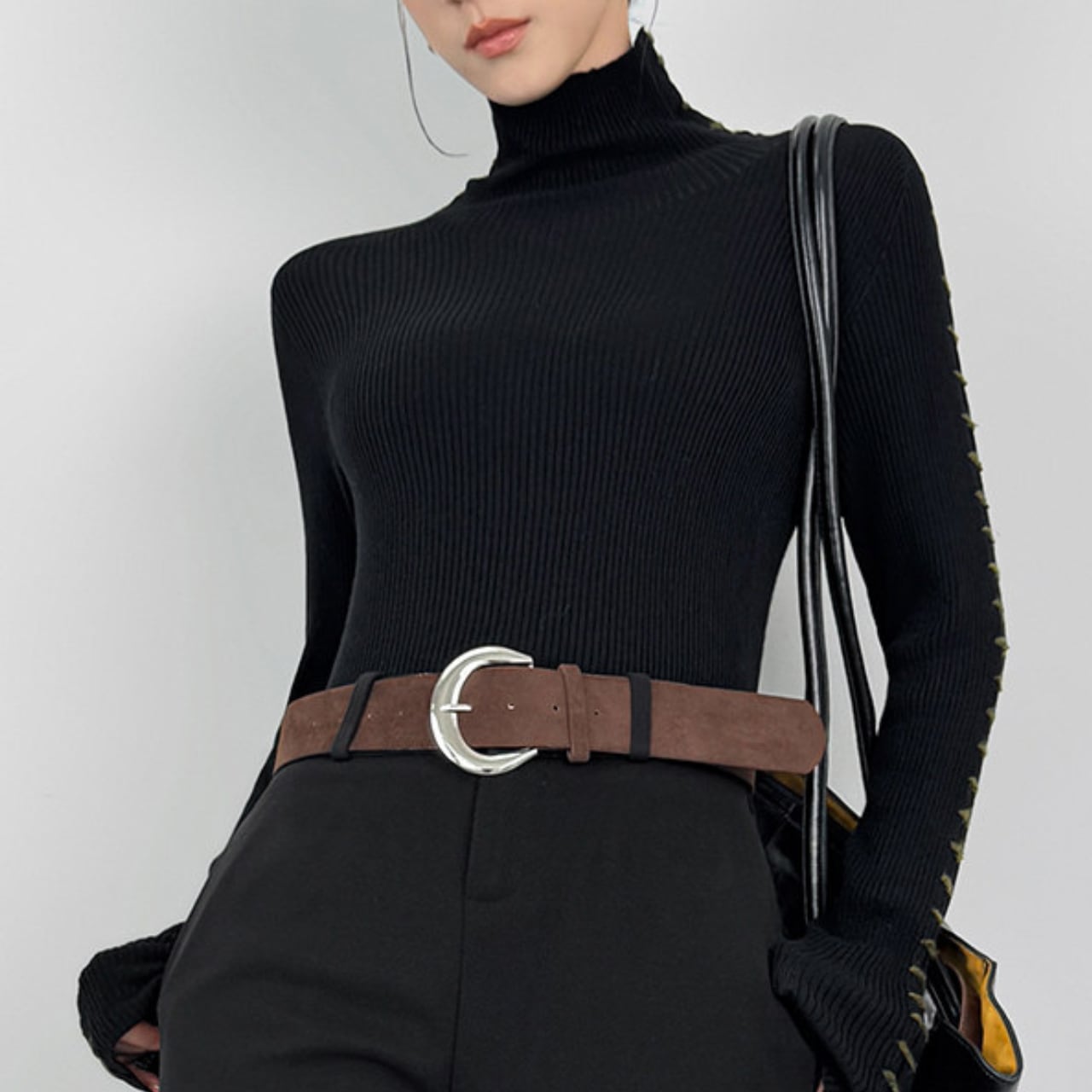 タートルネックで首元をきちんと見せつつ、トレンド感も演出します。