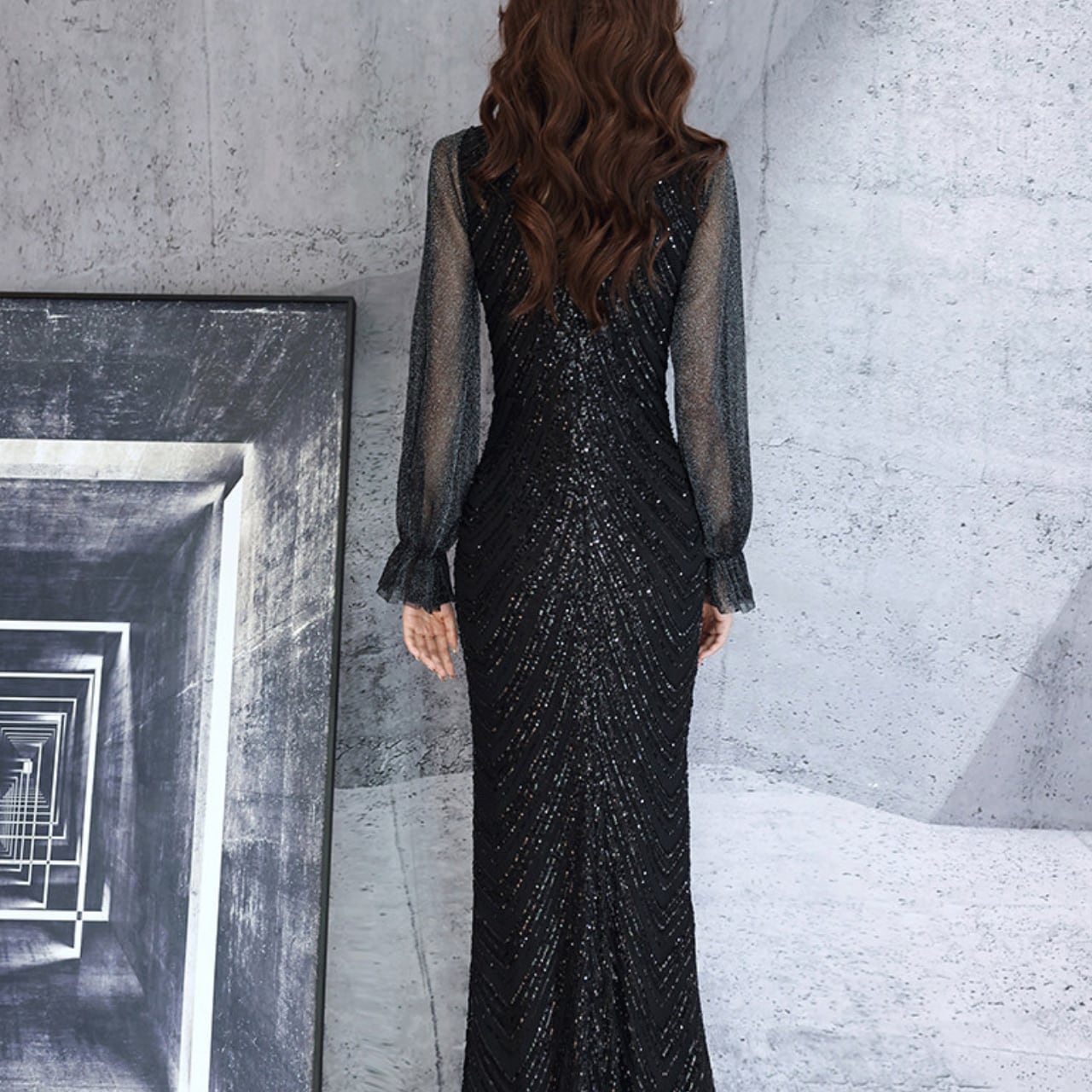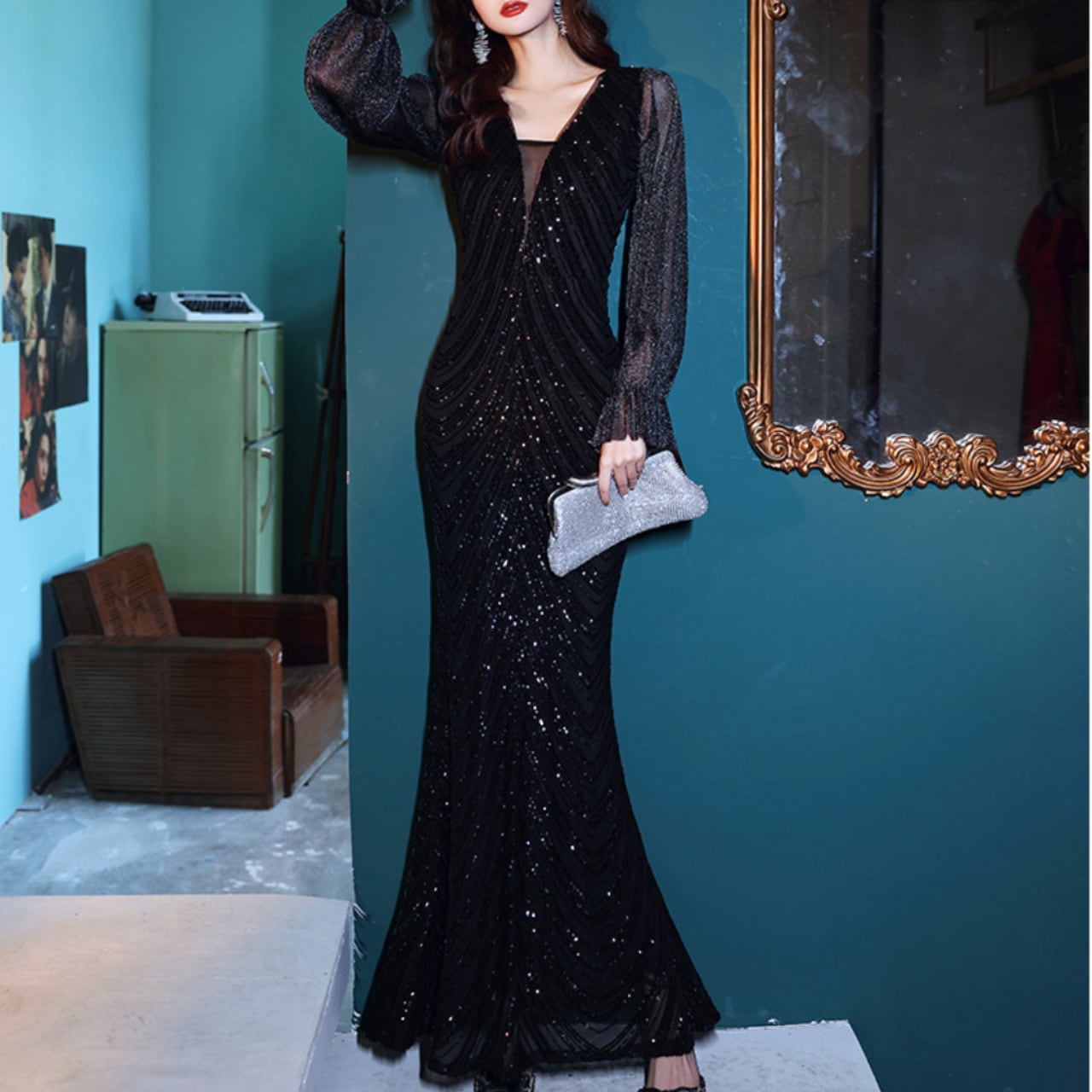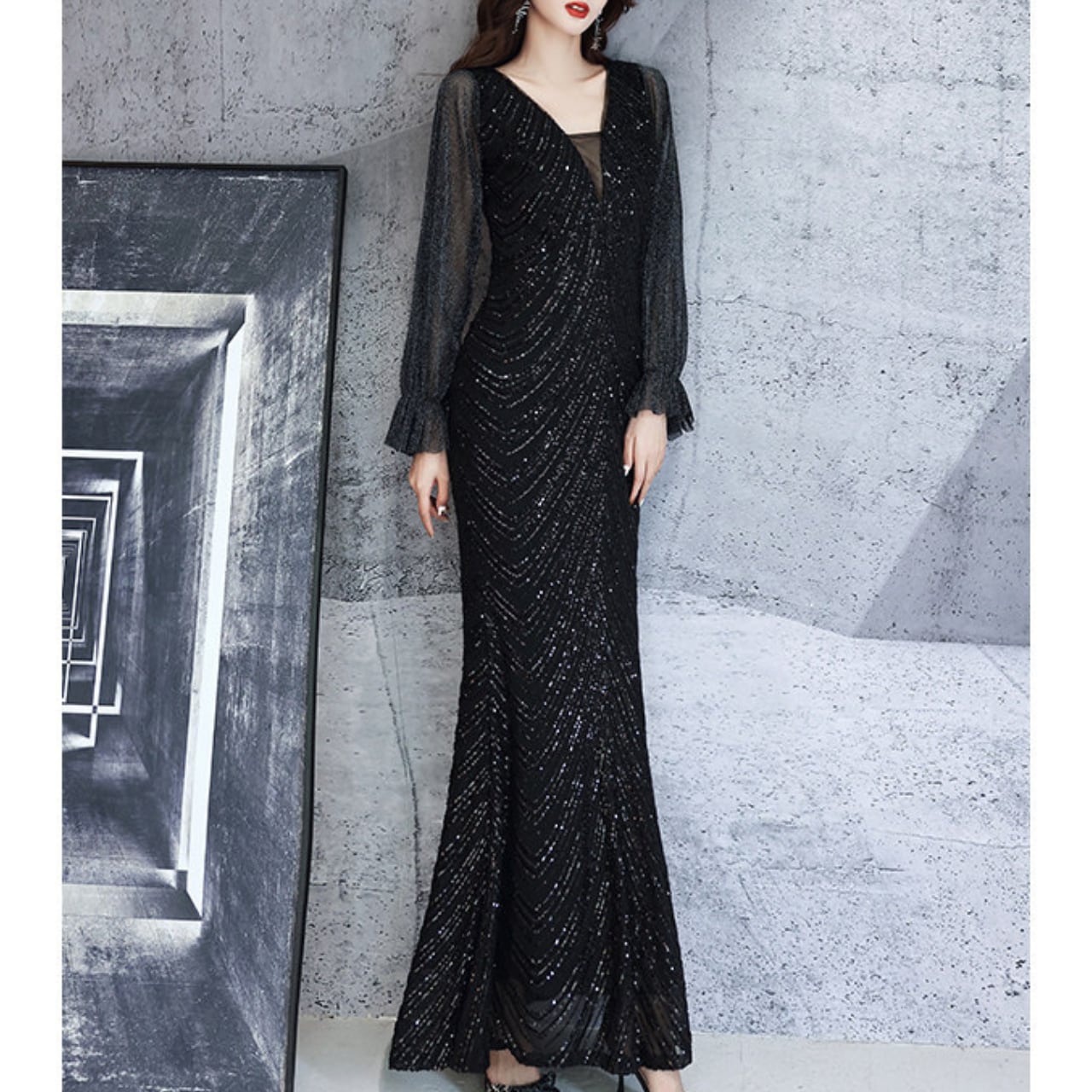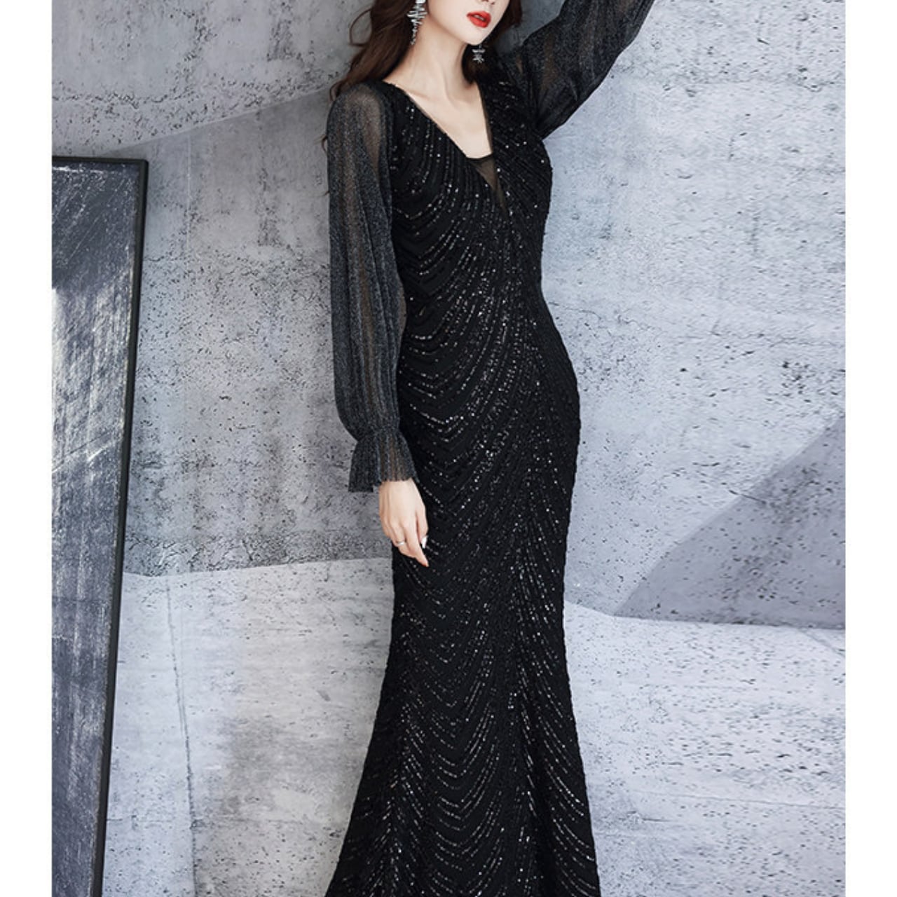 漆黒のブラックに無数のグリッターを散りばめた、一度袖を通せば忘れられないロングドレス。深いVネックラインとボディラインに沿うシルエットが、大人の色気を演出します。
