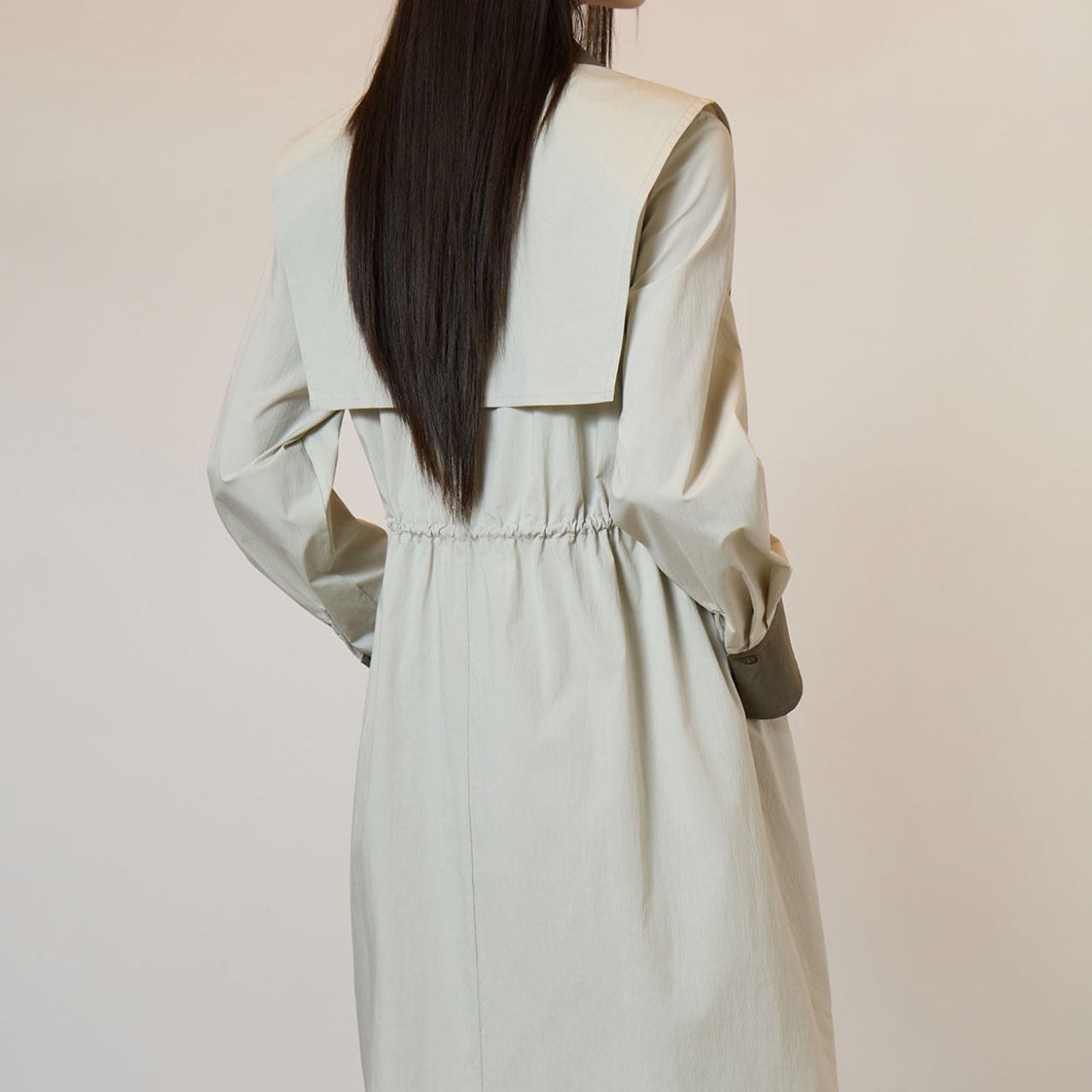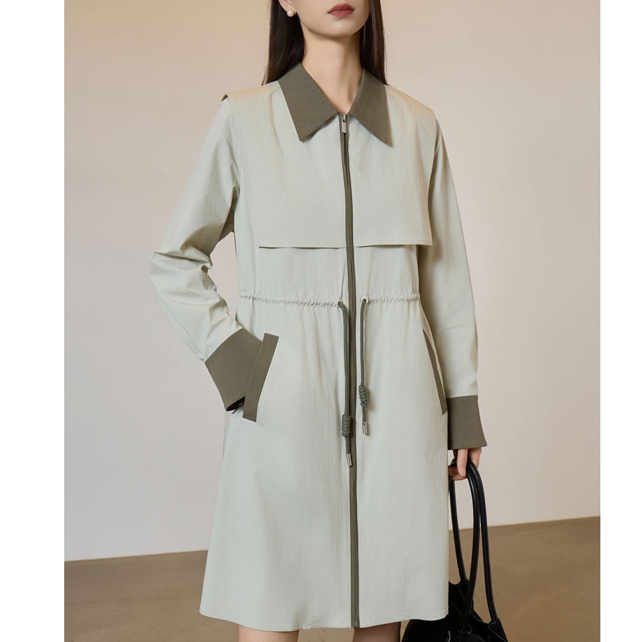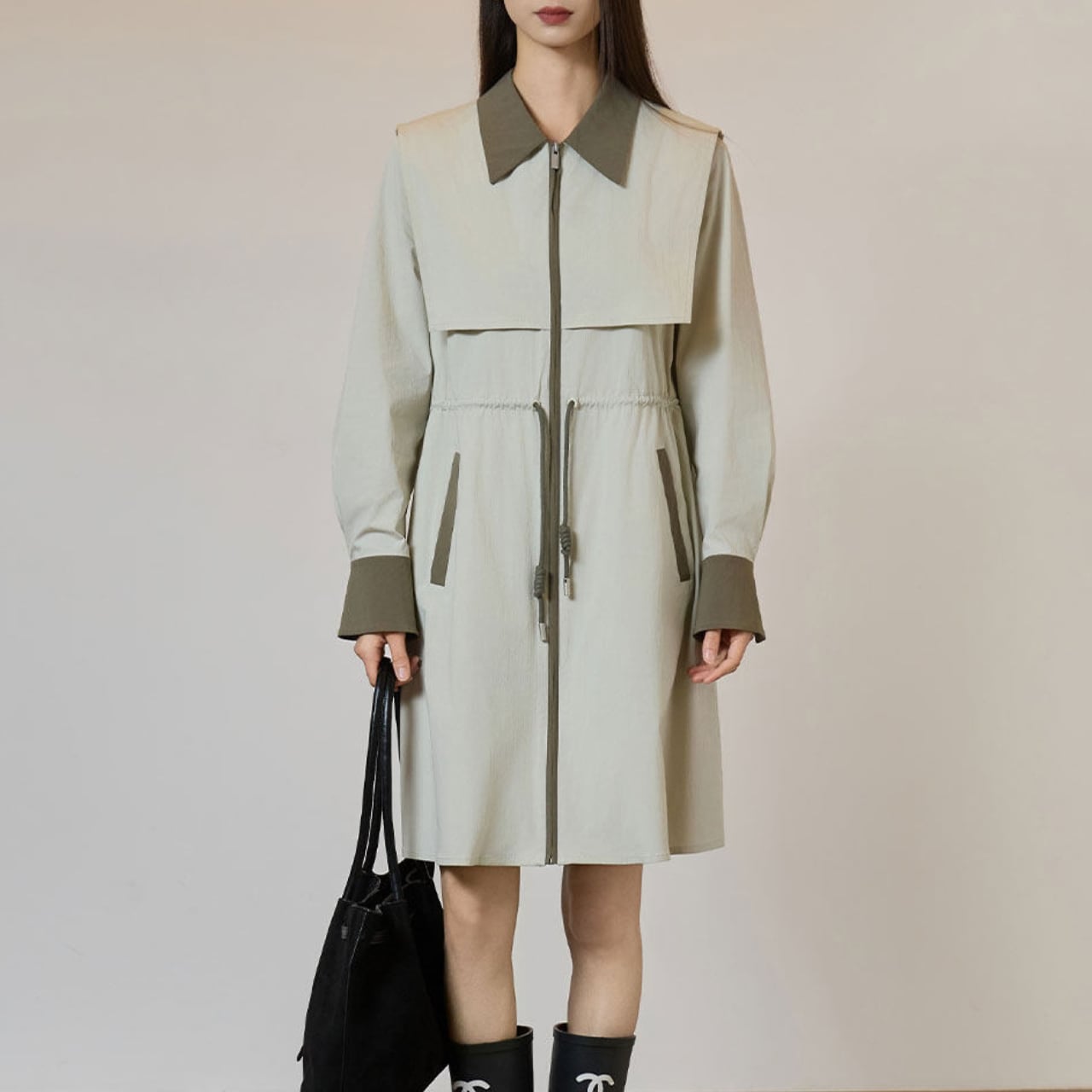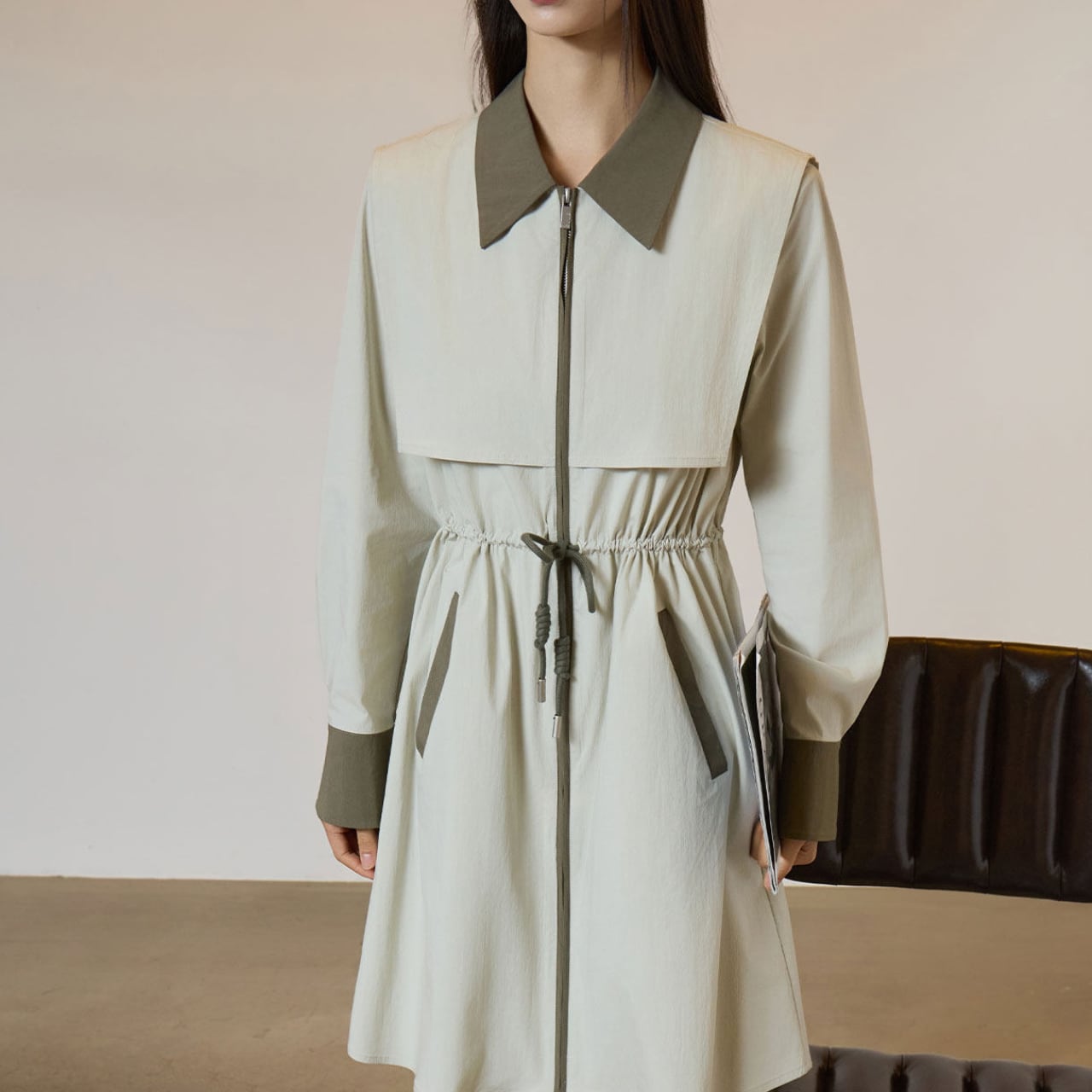 ベージュとカーキグリーンの配色が目を引く、洗練されたシャツワンピース。