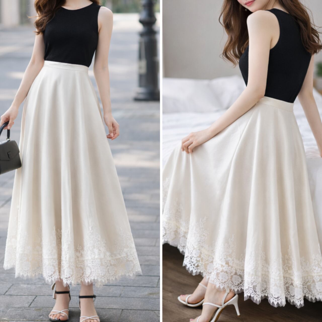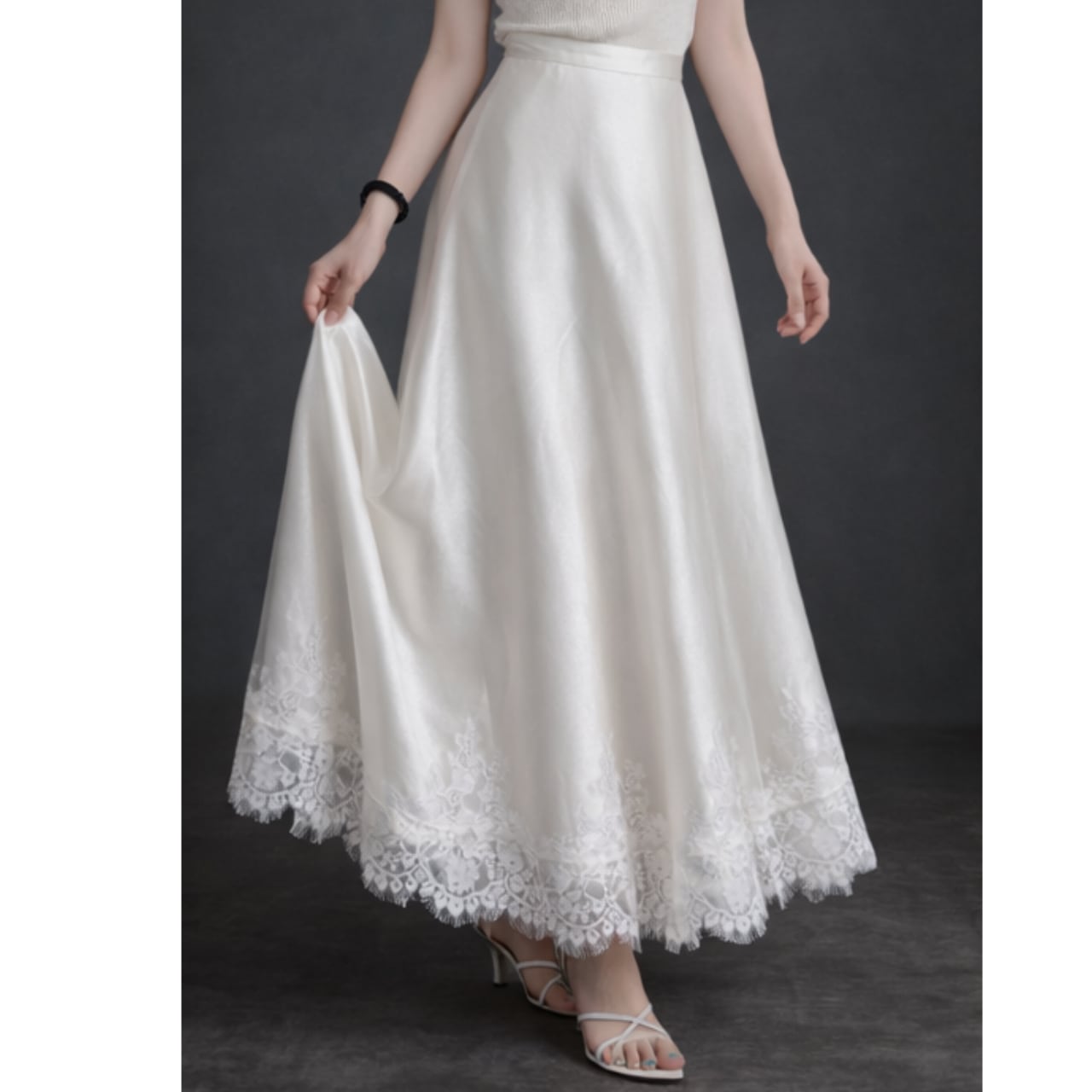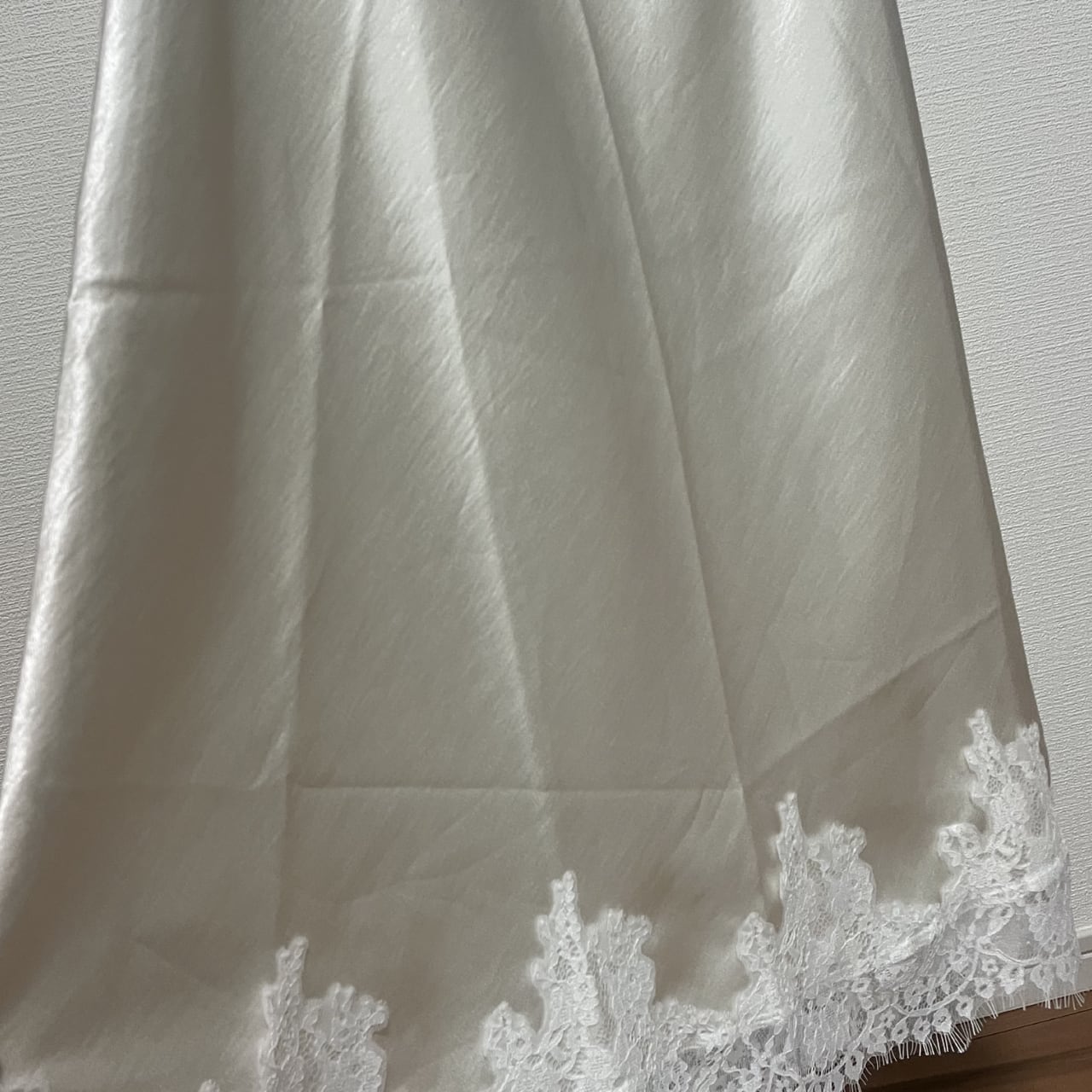 フロント部分はなめらかなサテン素材で品よくまとめ、裾に繊細なレースをパッチワーク状にあしらうことで、歩くたびに揺れる軽やかさと透け感を演出します。