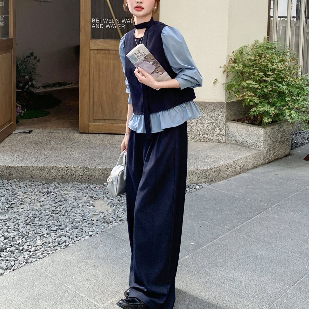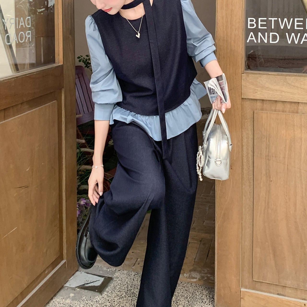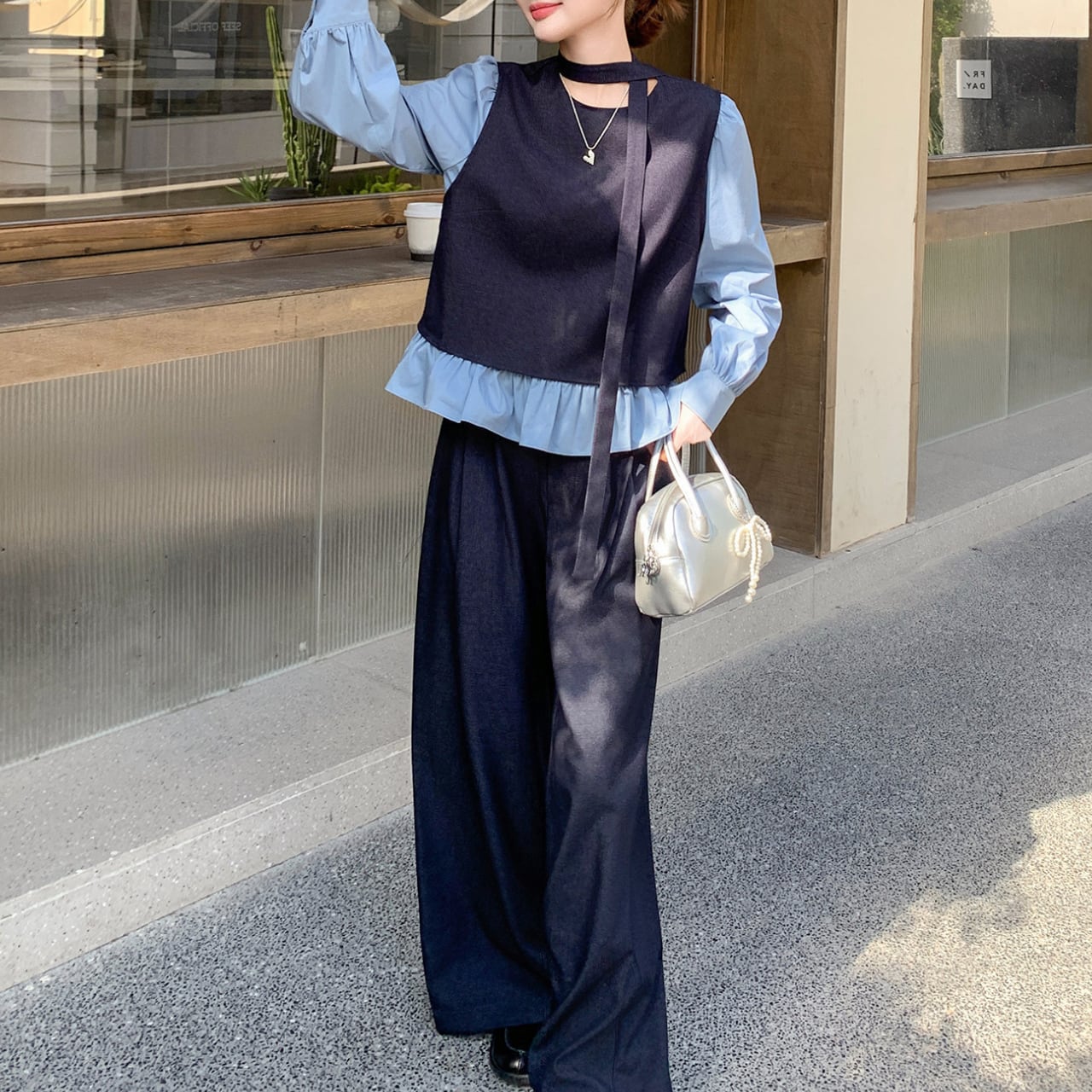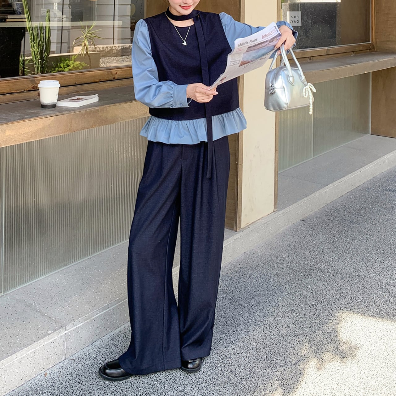 ネイビーベストとブルーシャツが絶妙に融合した、レイヤードトップス。