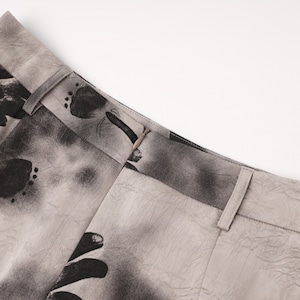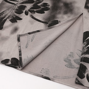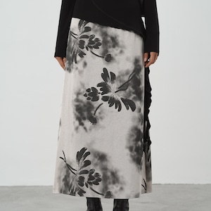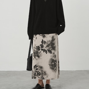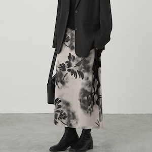 花びらの輪郭がにじむように描かれ、グレーと黒の濃淡が奥行きのある表情を生み出します。主張しすぎない柄だからこそ、シンプルなトップスと合わせるだけで、洗練されたスタイリングが完成します。