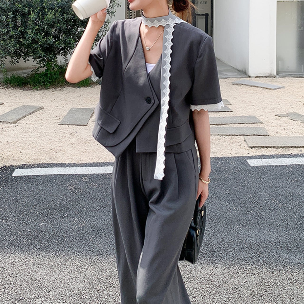 レイヤー感のあるデザインのジャケットとリラックス感のあるワイドレッグパンツのセットです。