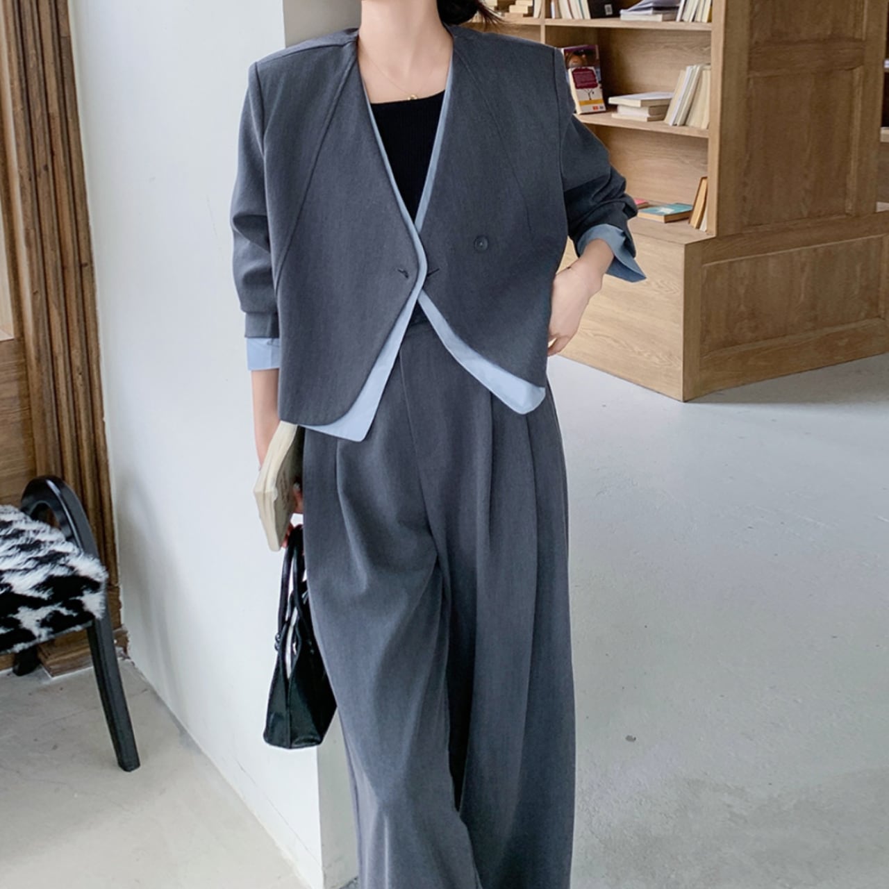 ジャケットはさりげなく覗くブルーのレイヤードデザイン。