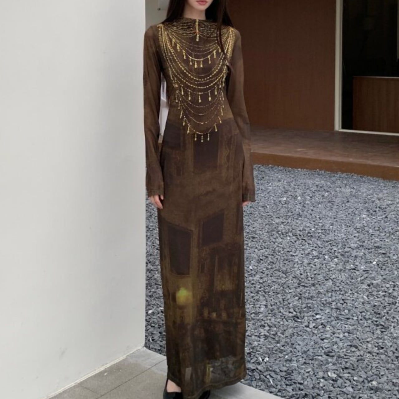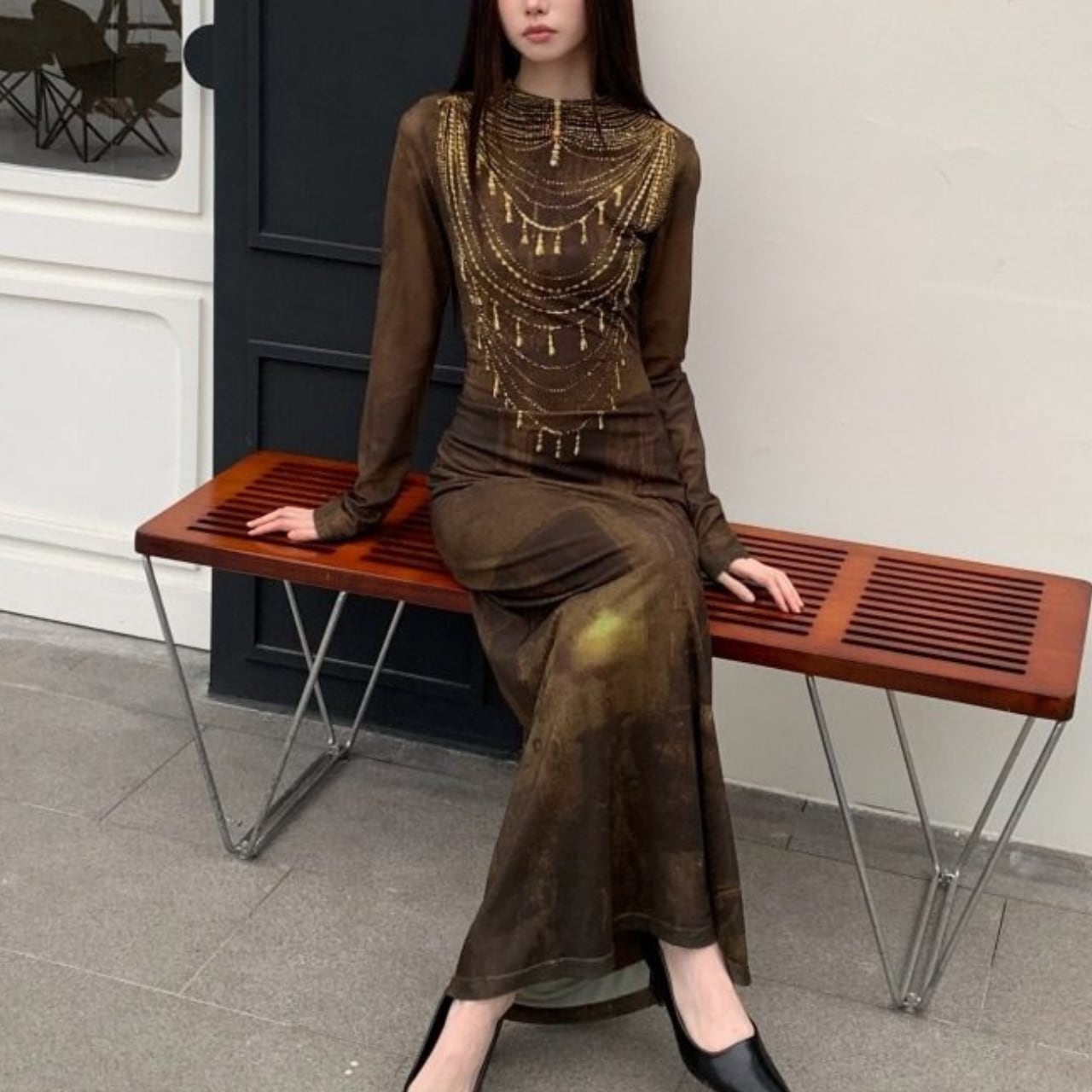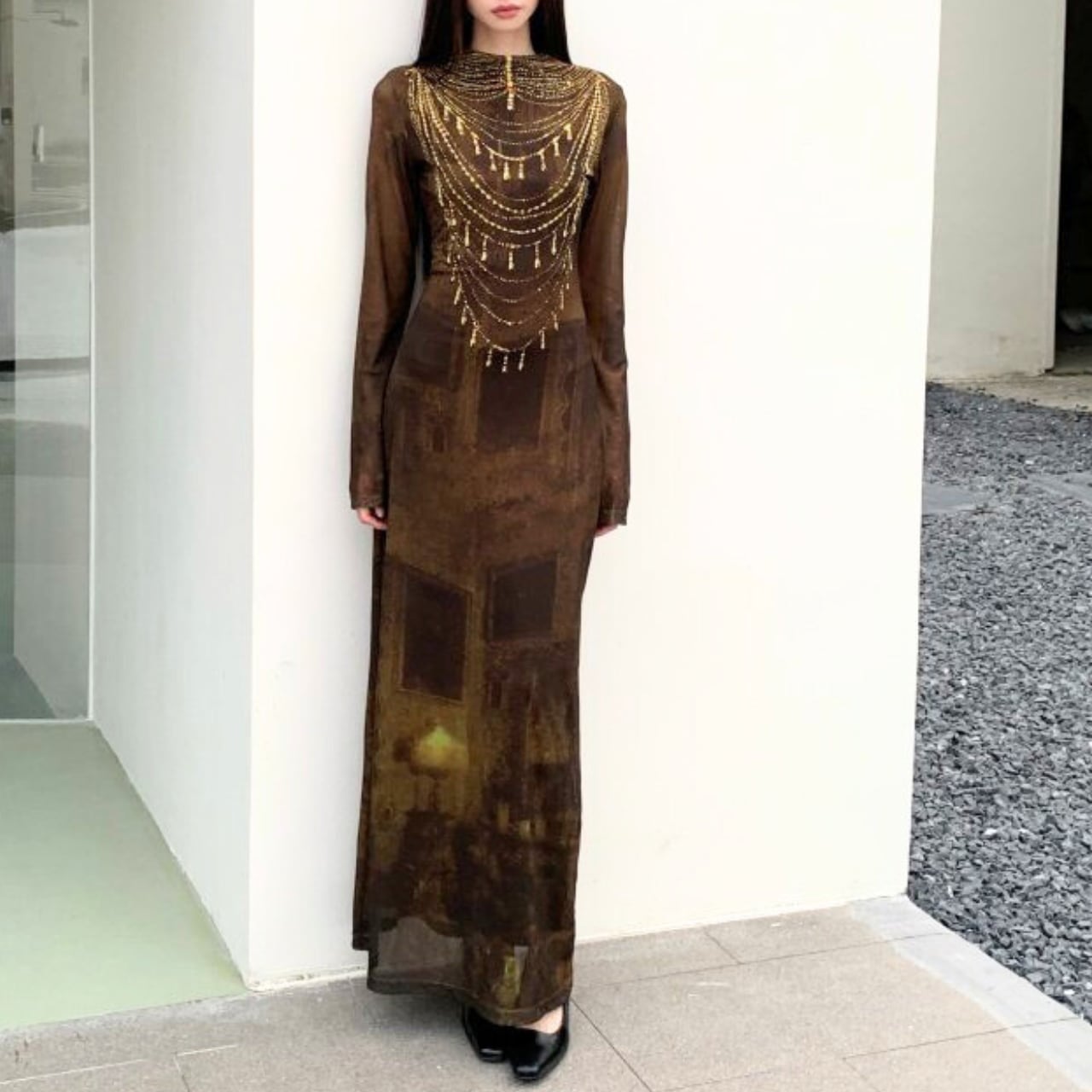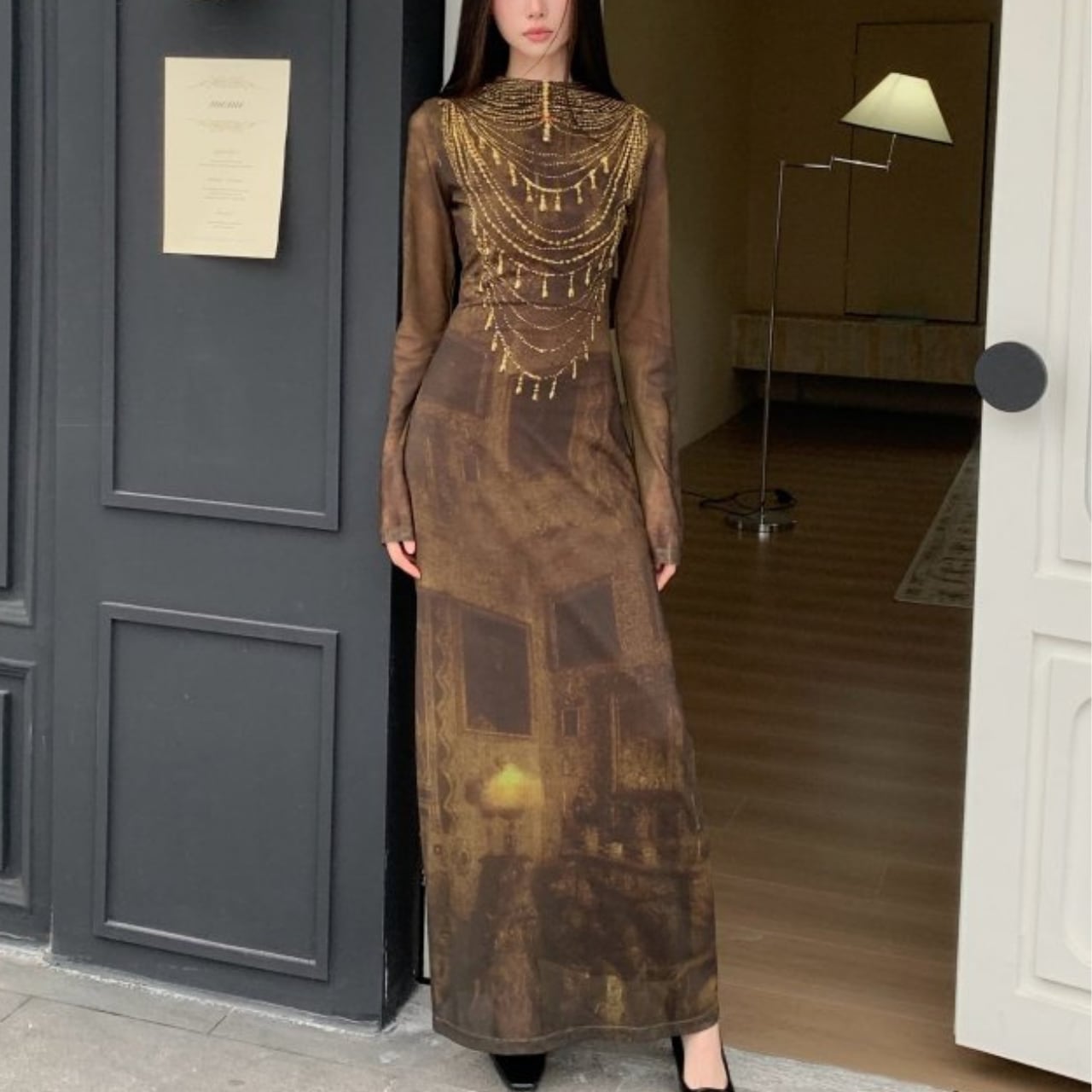 繊細なゴールドのネックレスプリントが胸元から優雅に流れ落ちる、唯一無二のデザインワンピース。