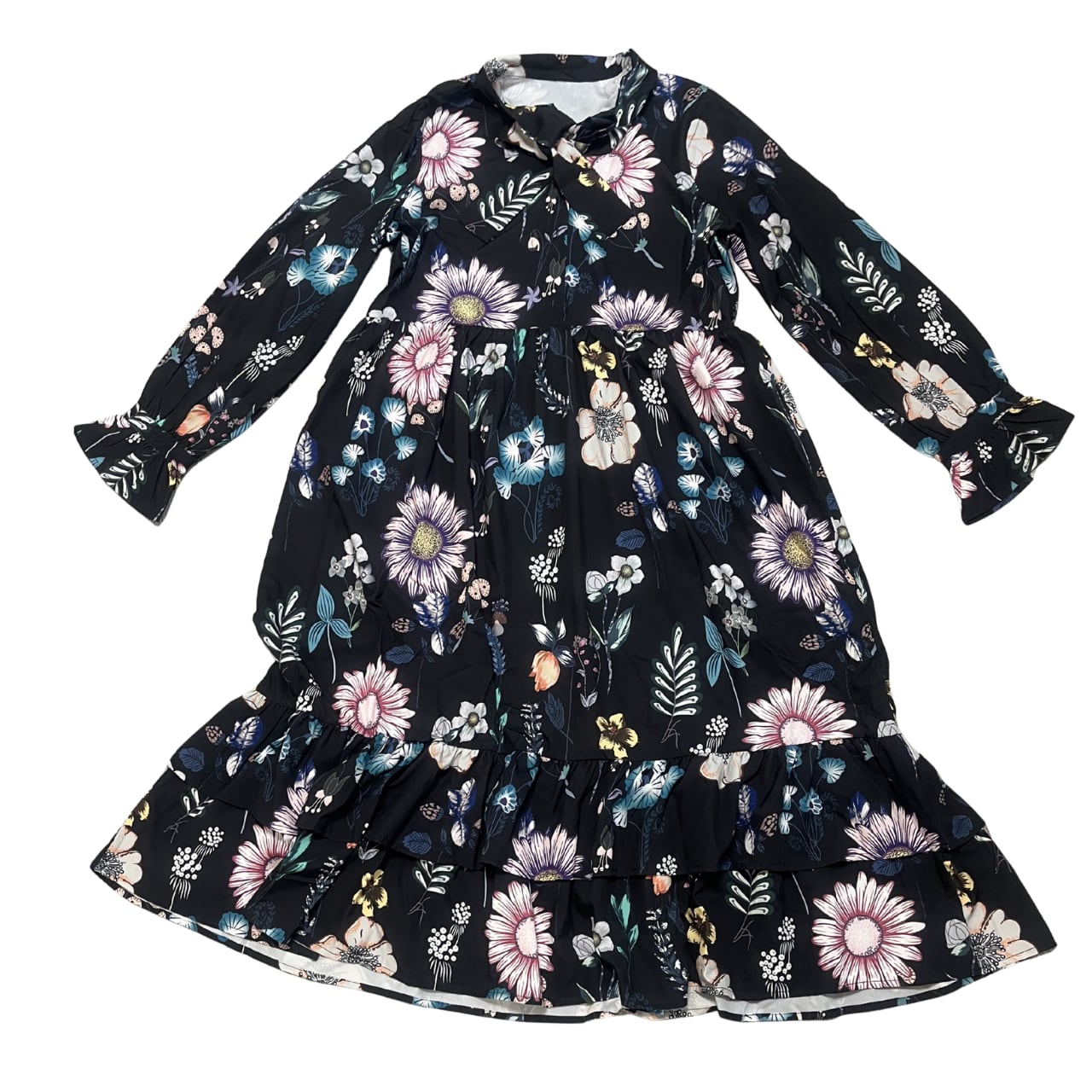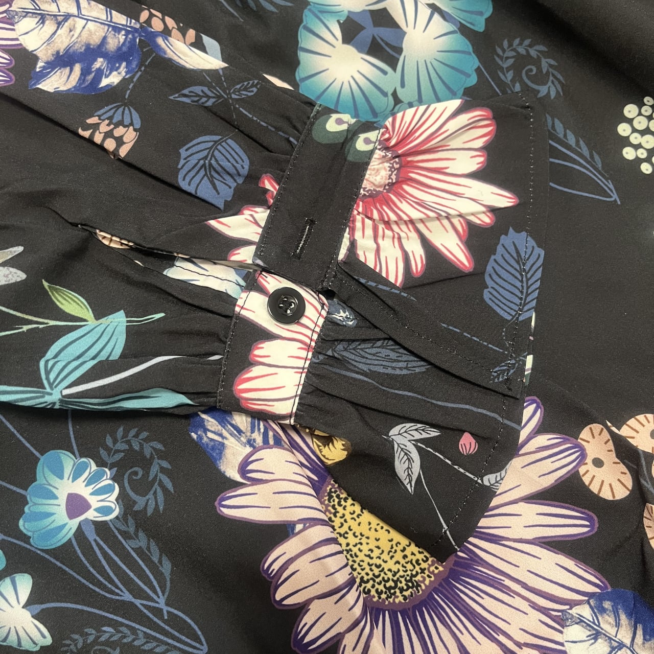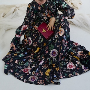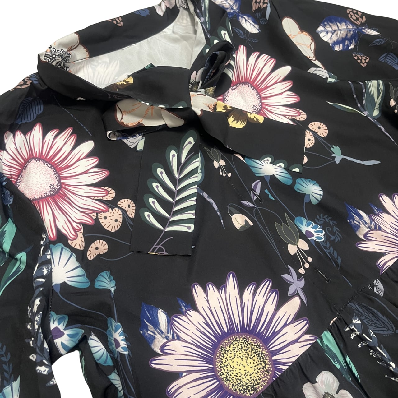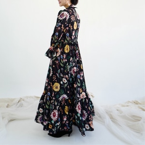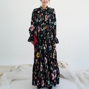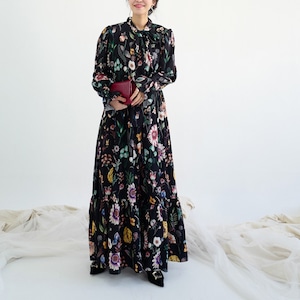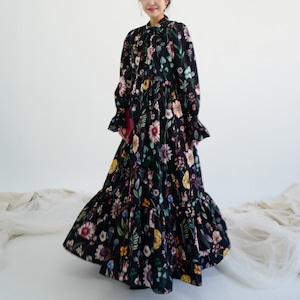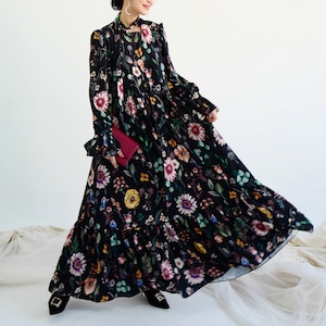 黒地に色とりどりの花々が咲き誇る、まるで秘密の花園のようなマキシワンピース。