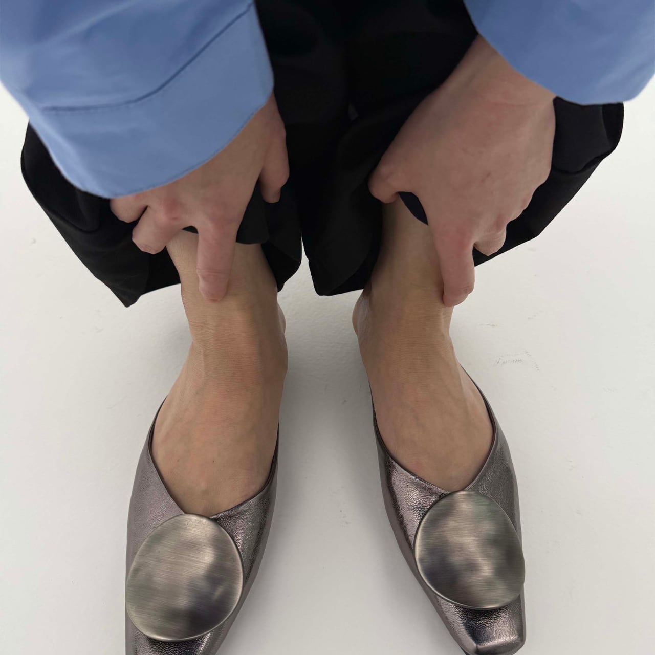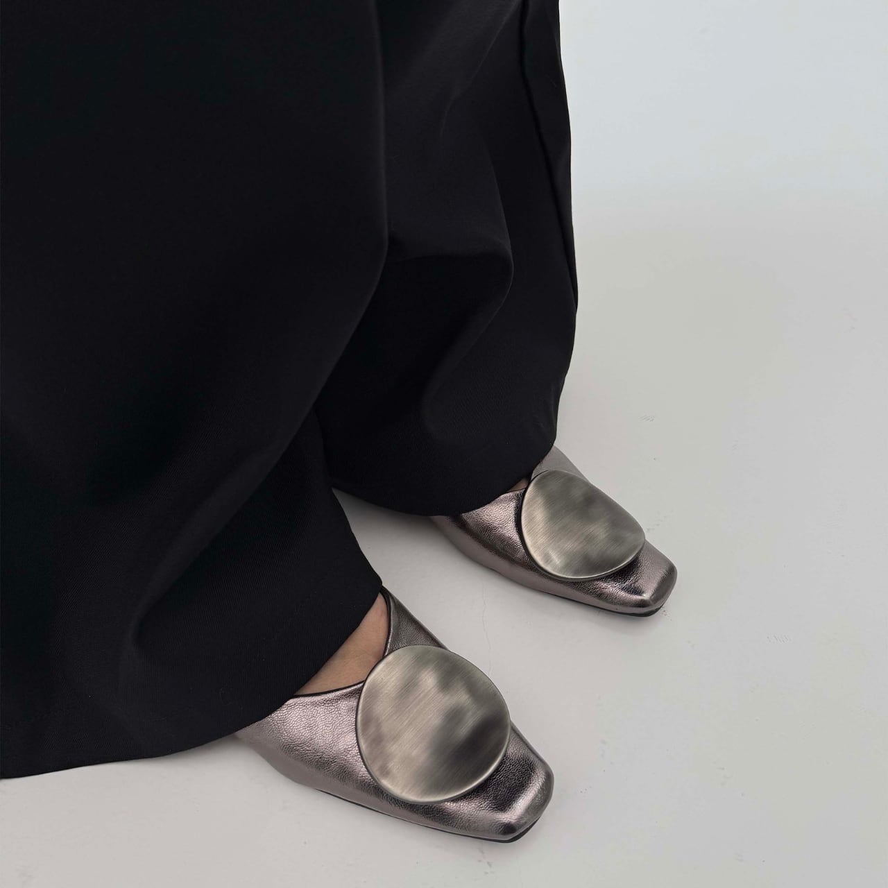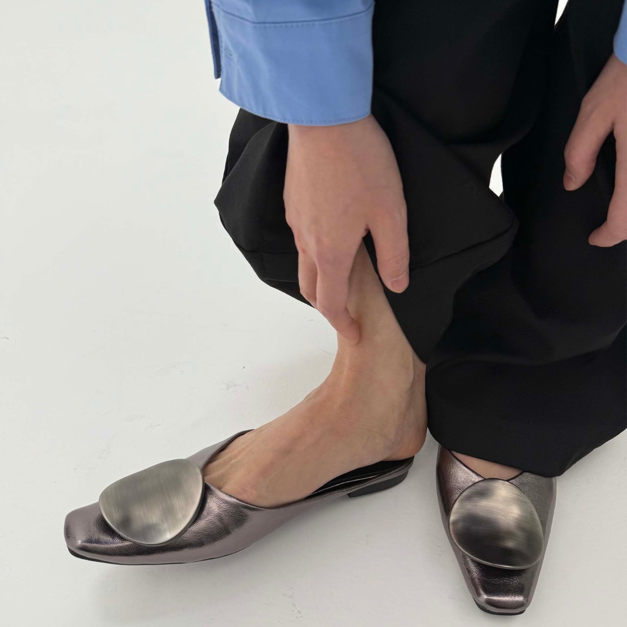 スクエアトゥの洗練されたフォルムと、未来的なメタル素材の組み合わせが、コーディネートに即座にモードな空気感をプラス。