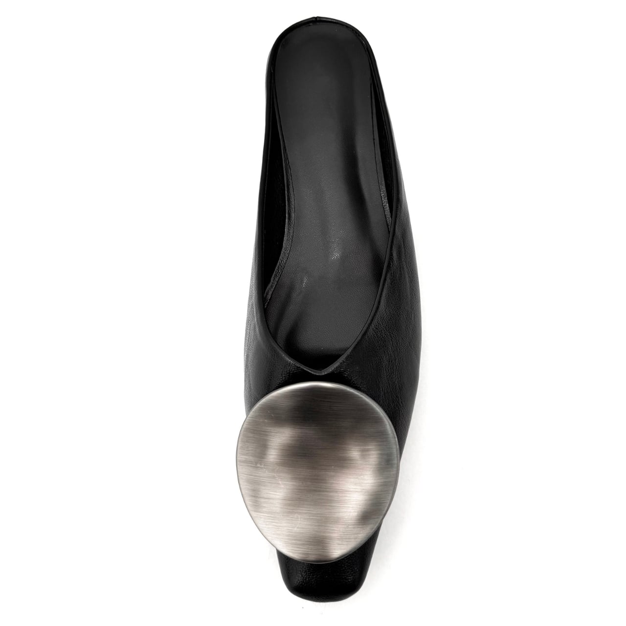 一目で記憶に残る、大胆なメタルキャップが特徴的なスクエアトゥパンプス。