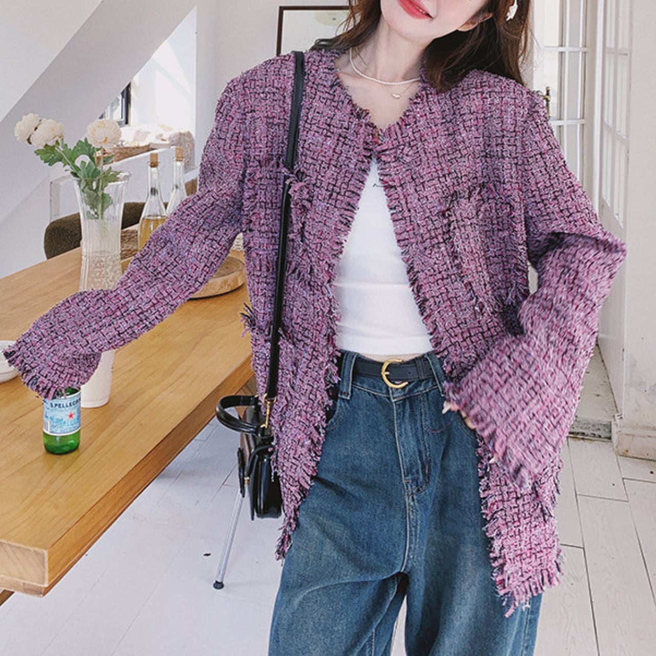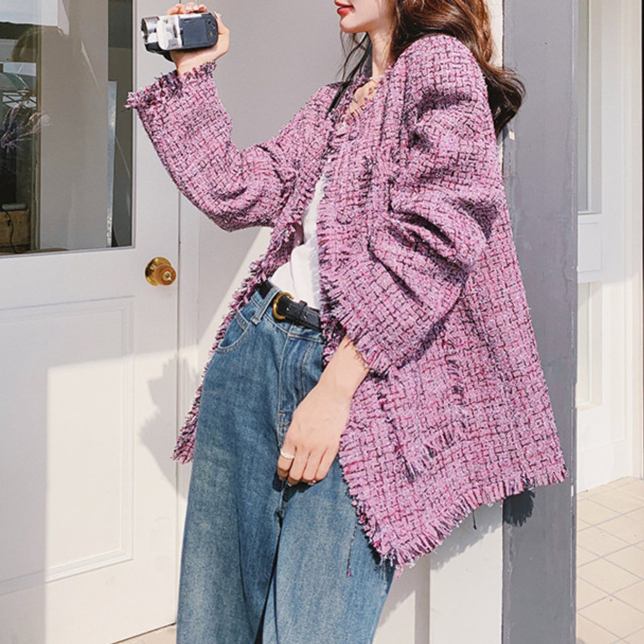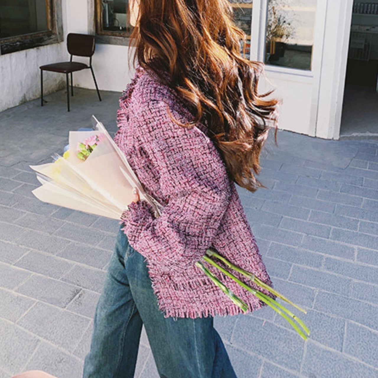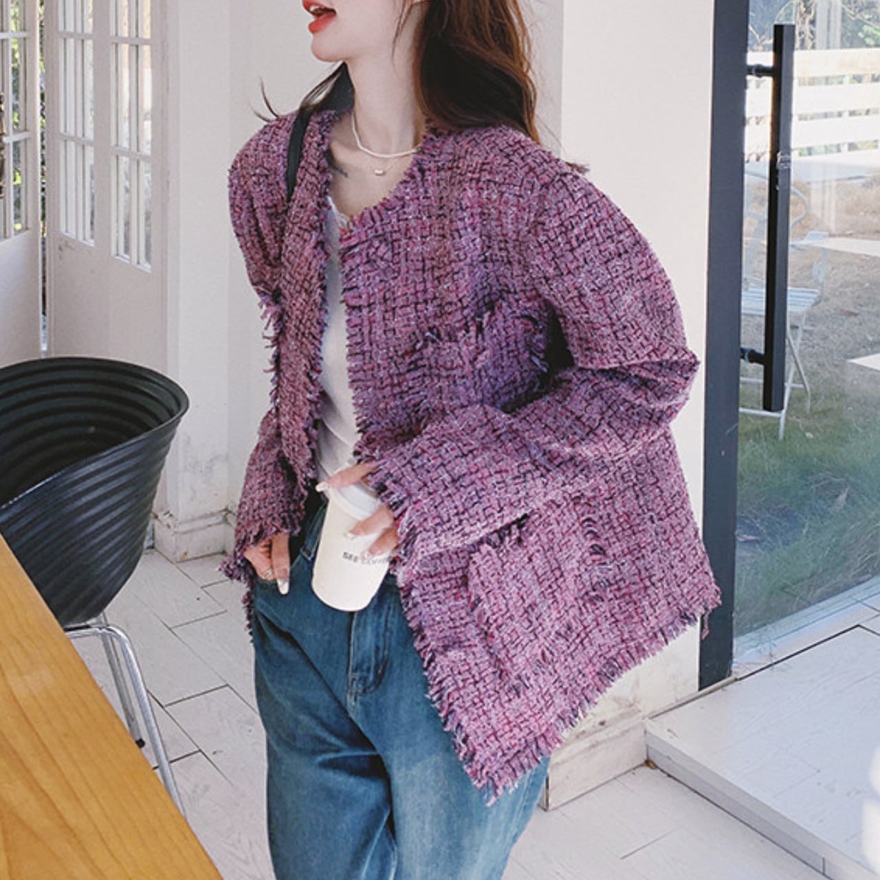 柔らかなパープルが織りなす、上品なツイード生地が魅力の一着。