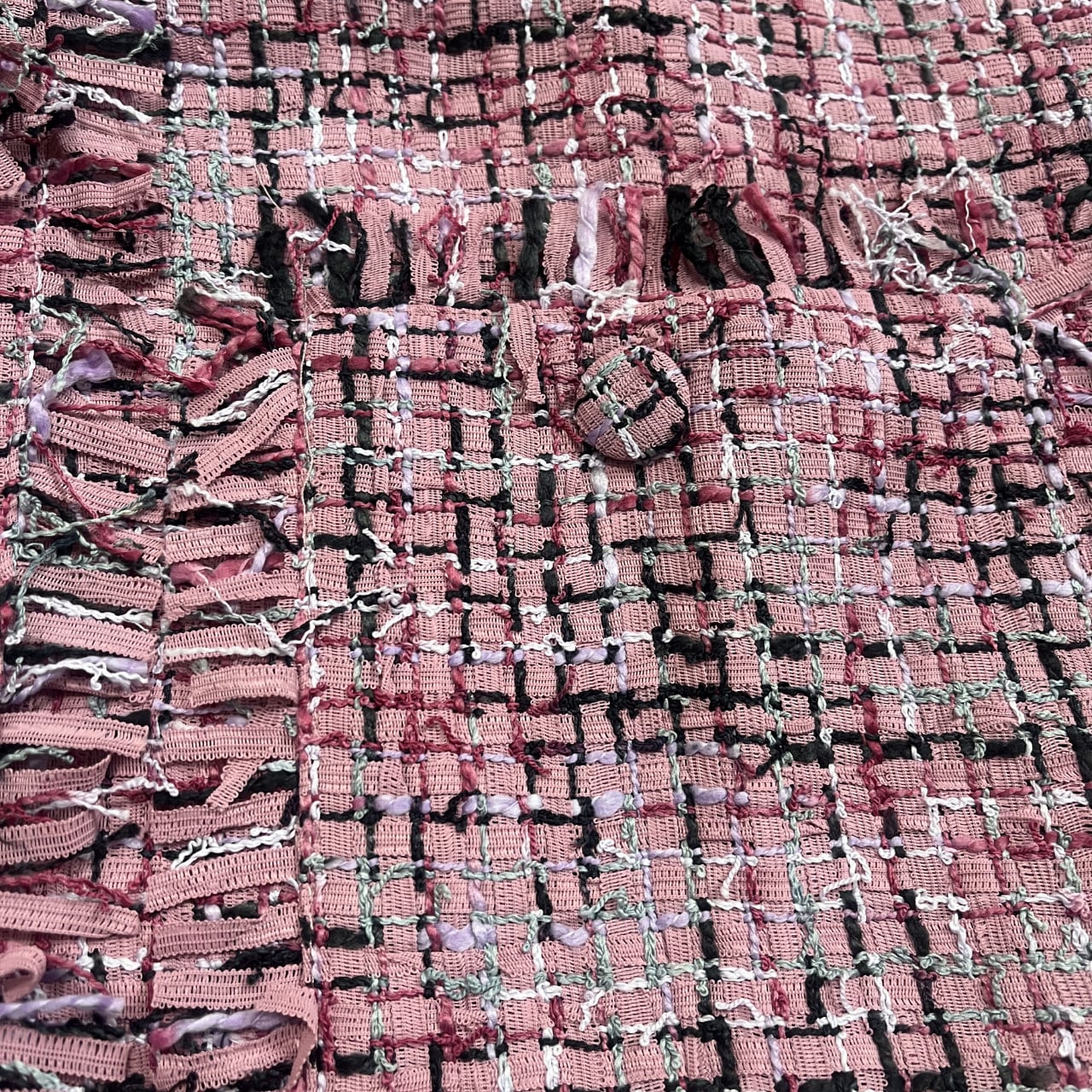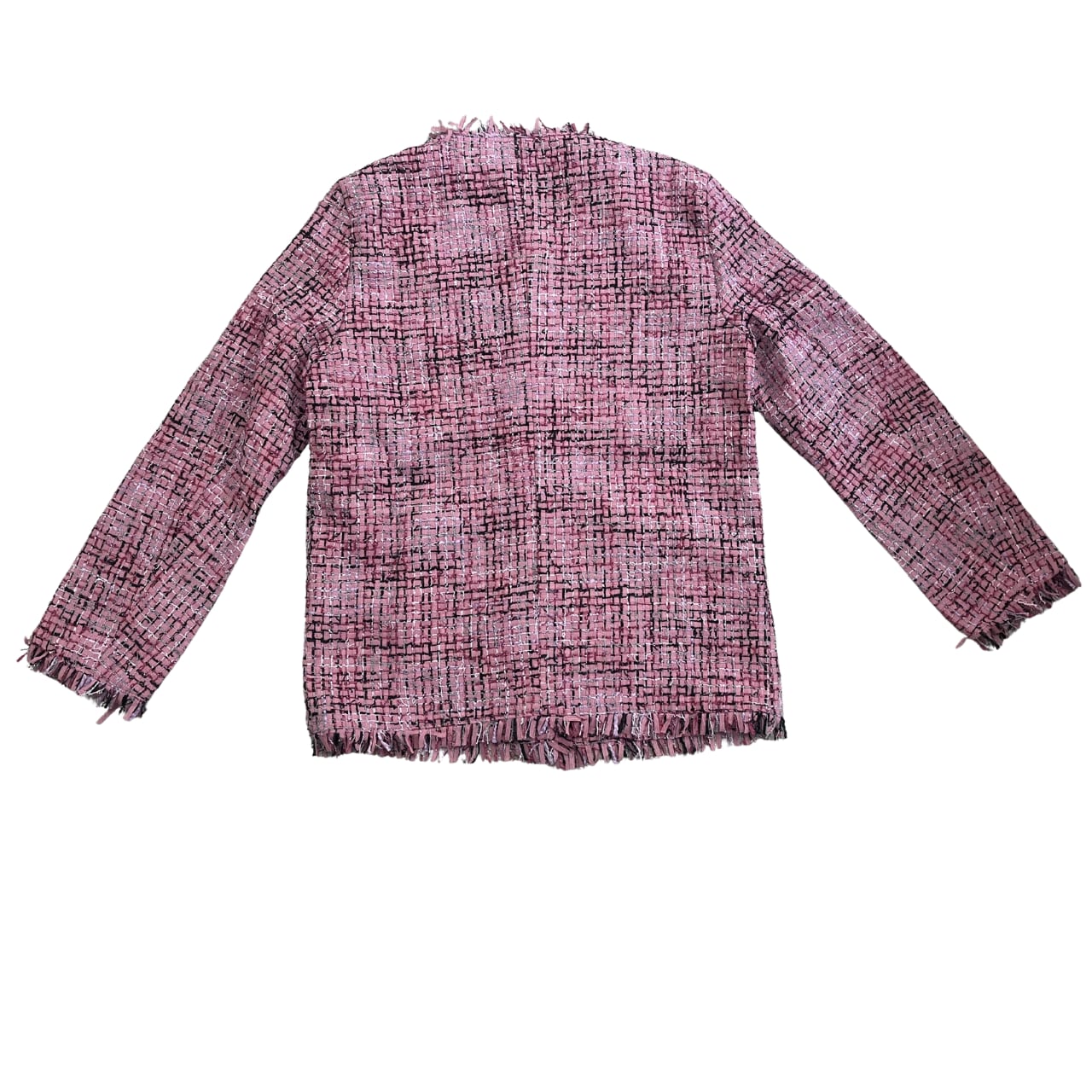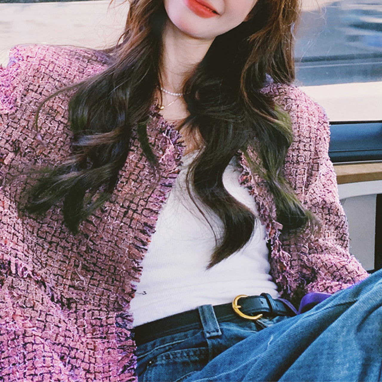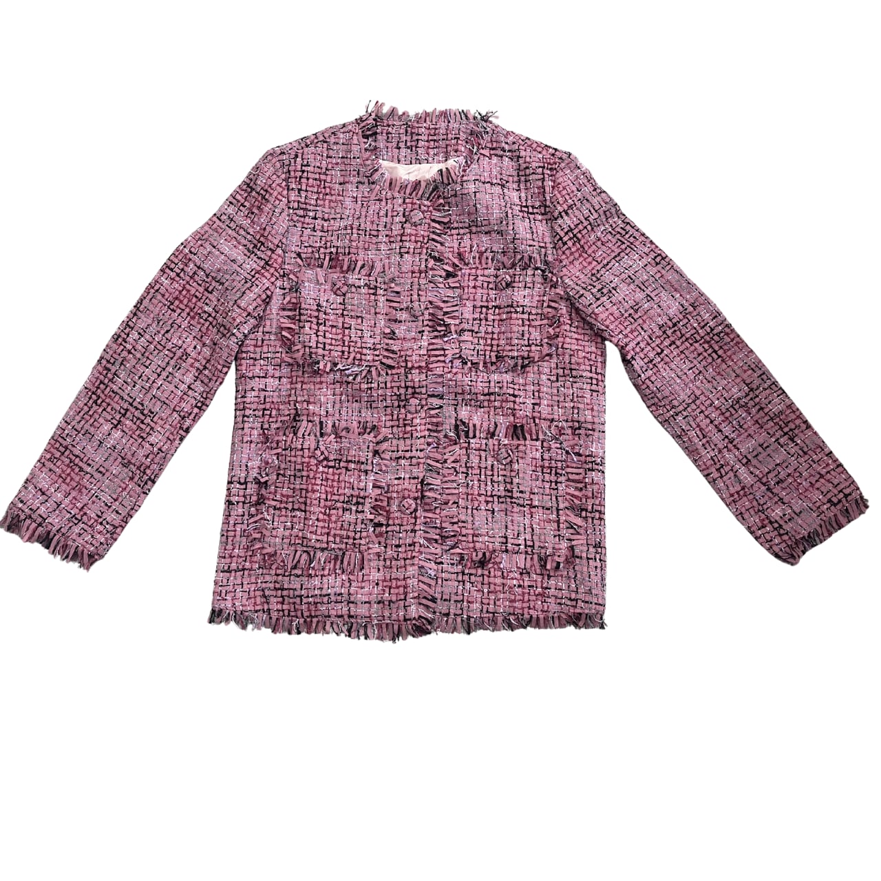 柔らかなパープルが織りなす、上品なツイード生地が魅力の一着。