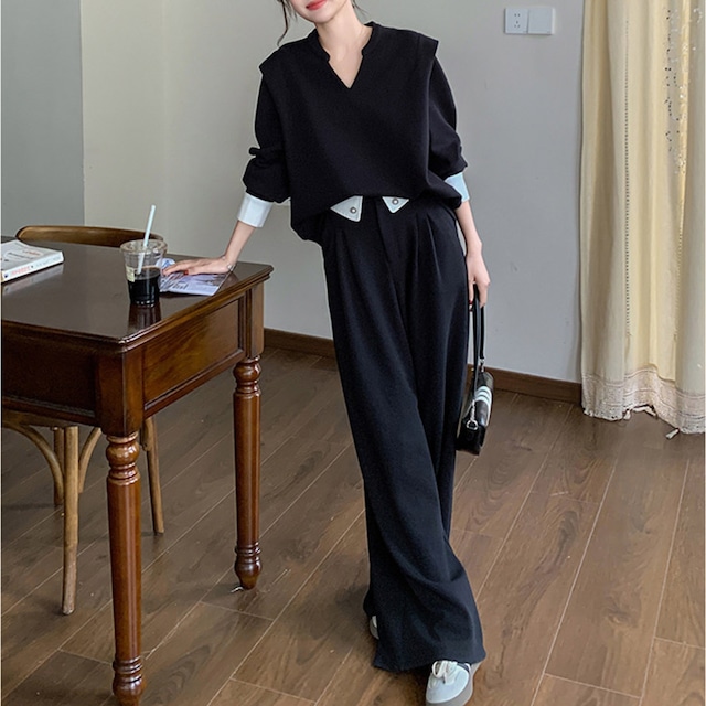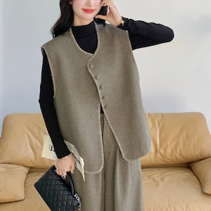 ステッチワークが際立つVネックベストと、落ち感のあるワイドレッグパンツの洗練されたセットアイテム。