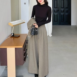 ワイドレッグパンツは腰回りをすっきり見せながら、裾に向かって優雅に広がるAラインシルエット。脚のラインを拾わず、エレガントな縦ラインを強調します。