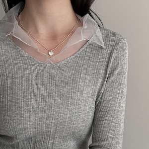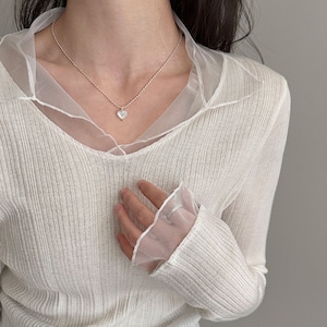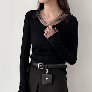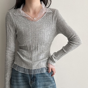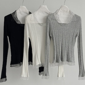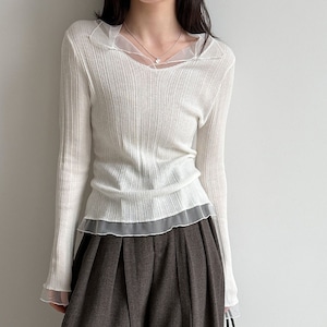 リブニットシャツの上にシアーなメッシュ生地を重ねた、他にはないデザイン。