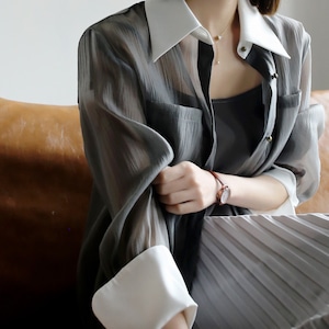 繊細なシアー素材と洗練されたカラーブロッキングが融合した、今季注目のセットアイテム。