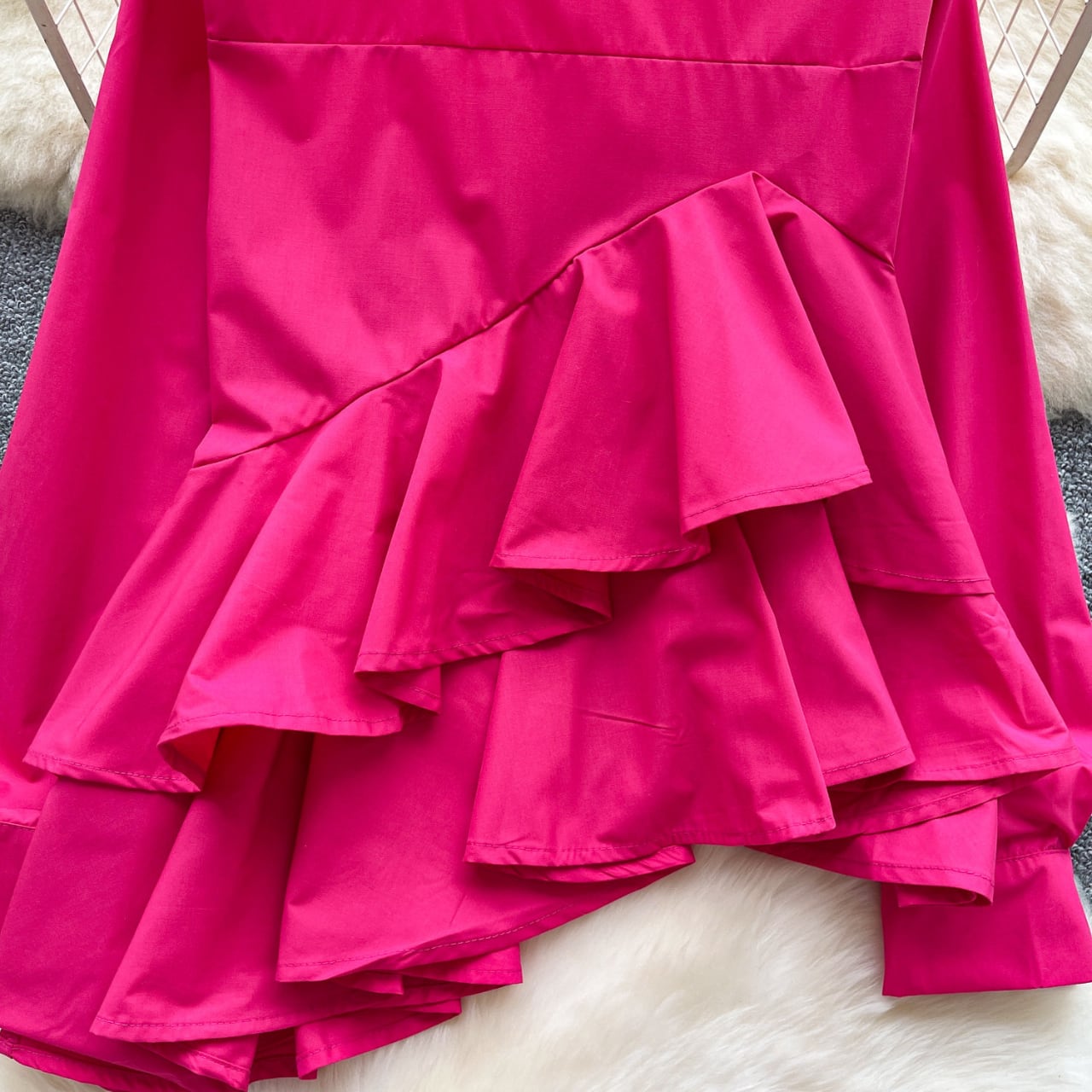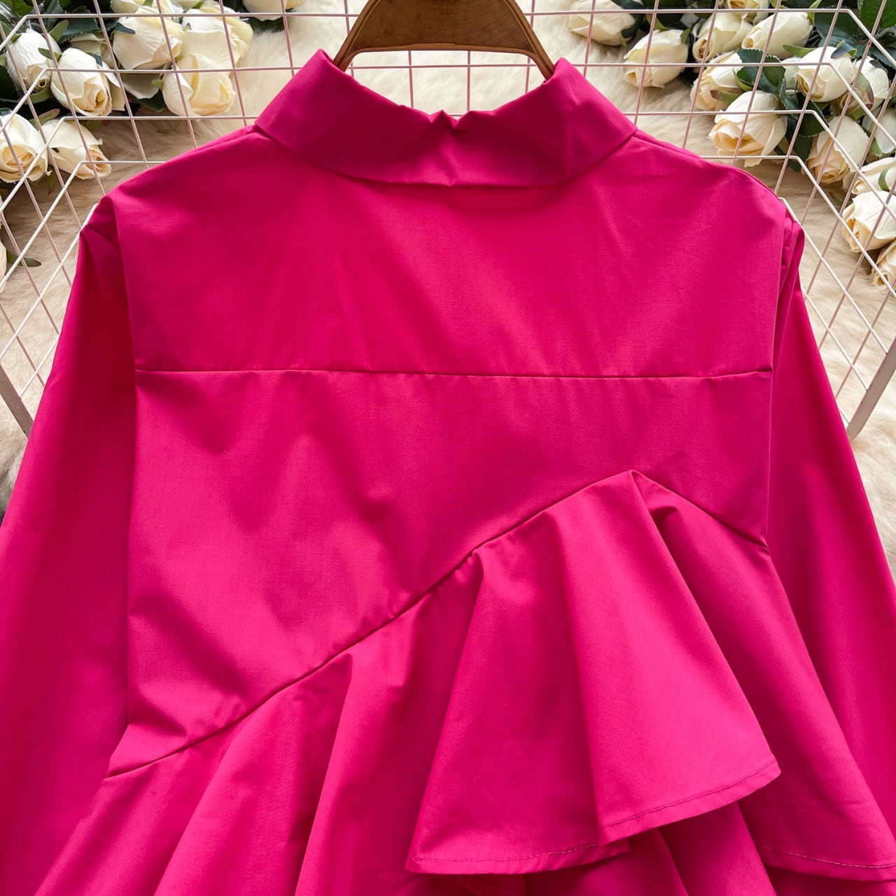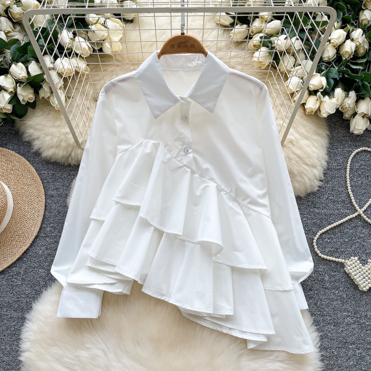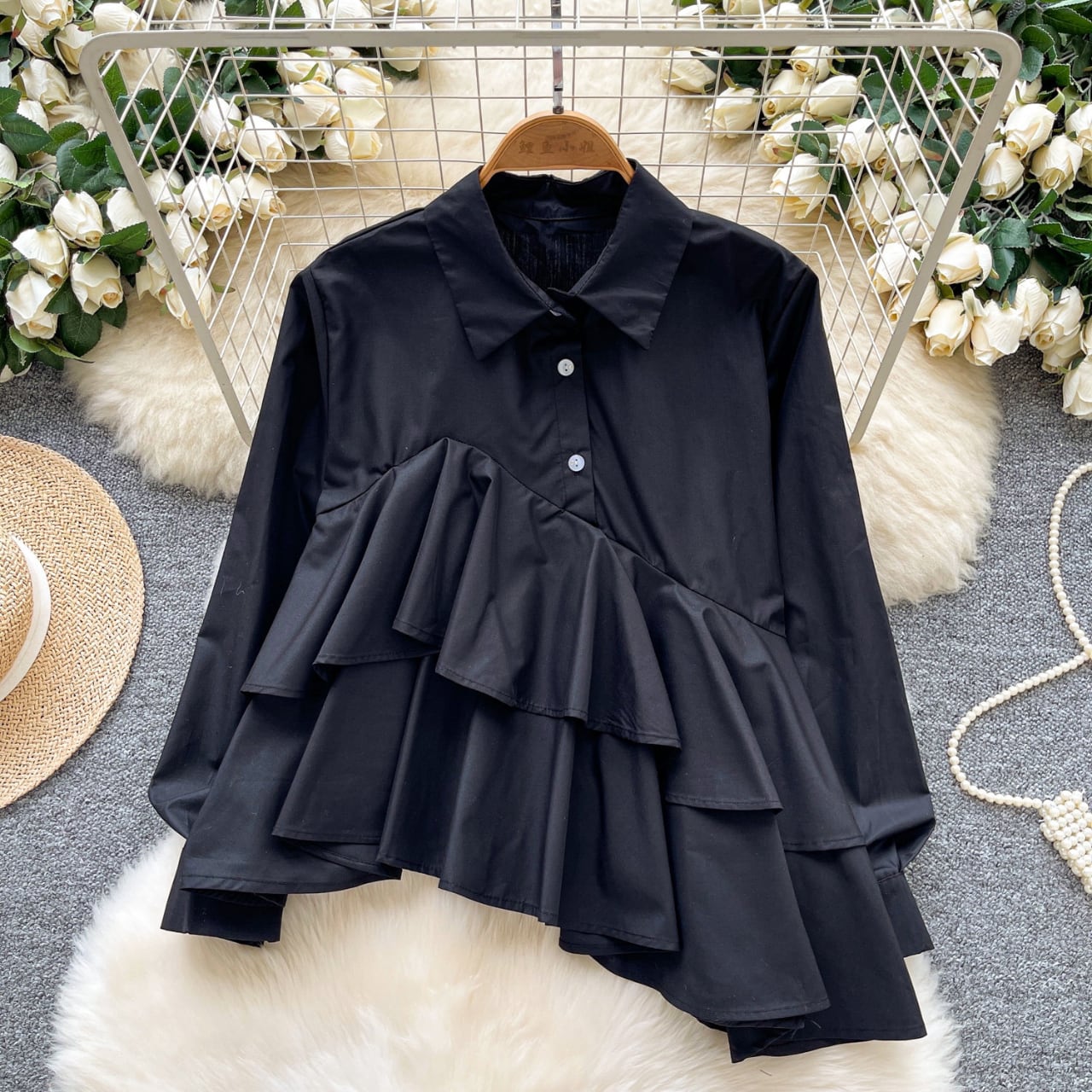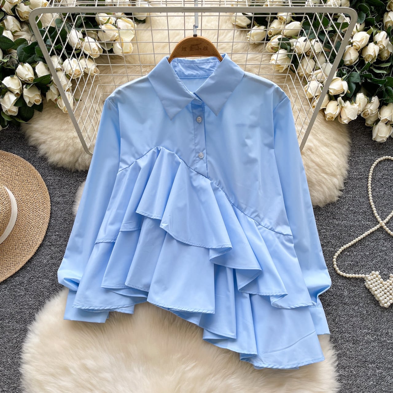 大胆なアシンメトリーデザインと幾重にも重なる立体的なフリルが、シンプルなシャツの概念を覆す革新的な一枚。