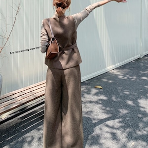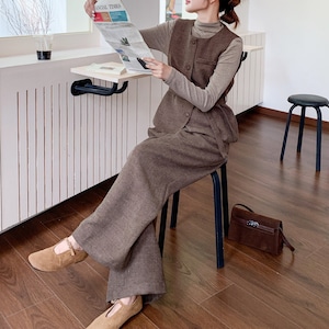 タートルネックシャツ、ウエストリボンベスト、ワイドレッグパンツの3点がセットになった、スタイリング要らずの優秀アイテム。