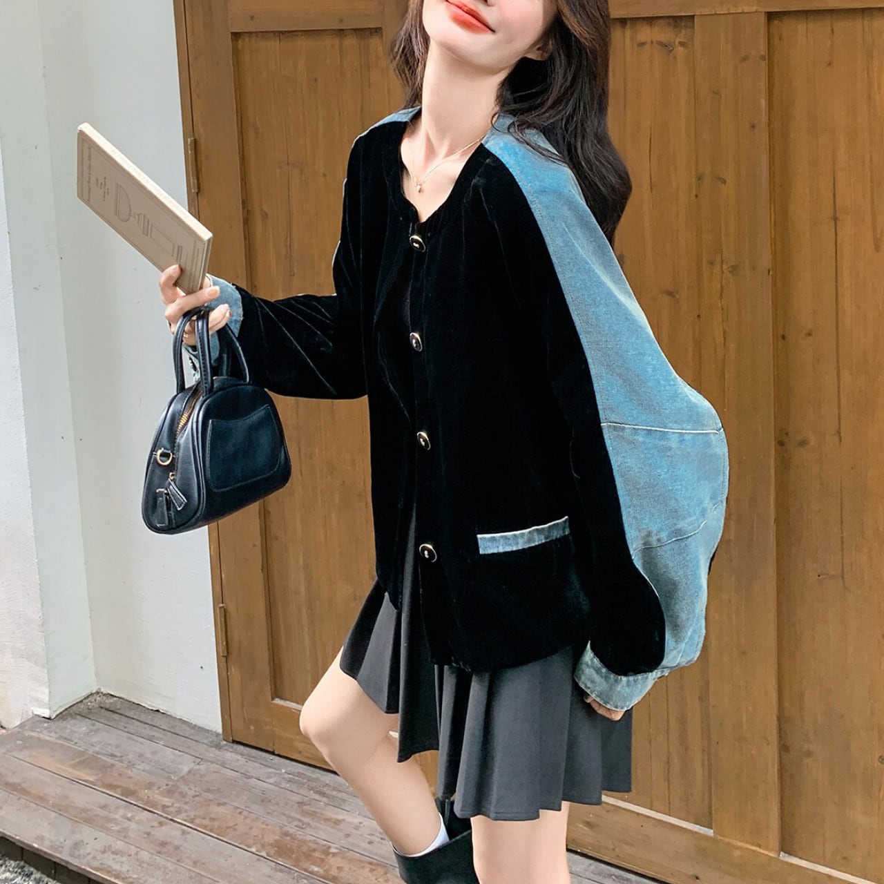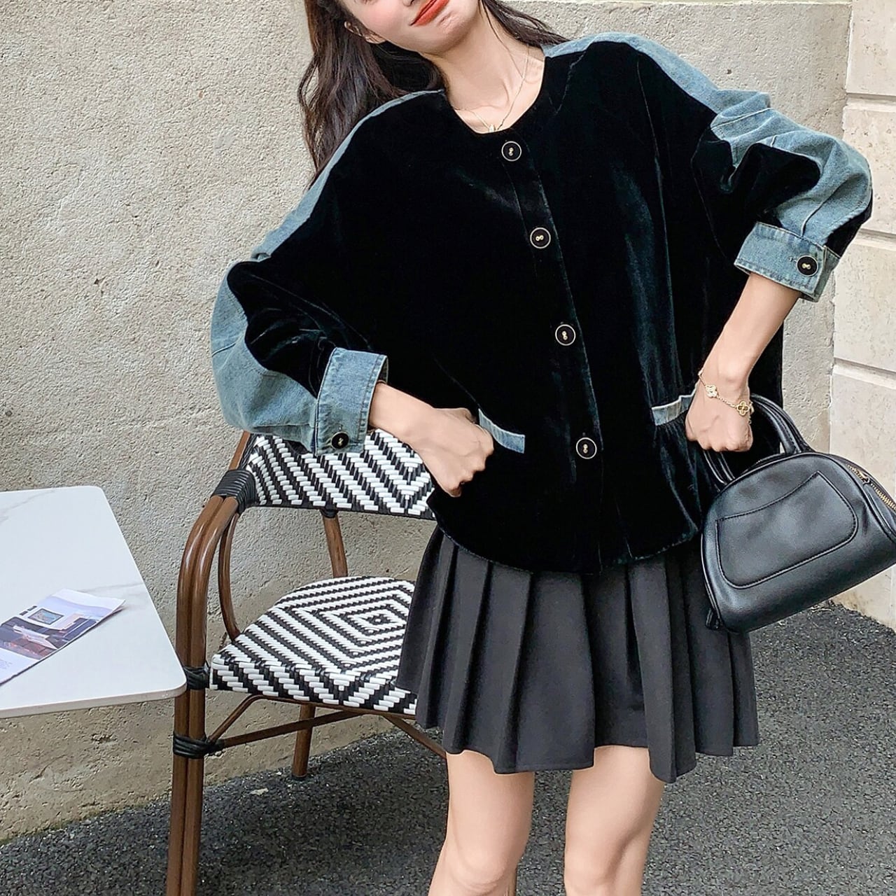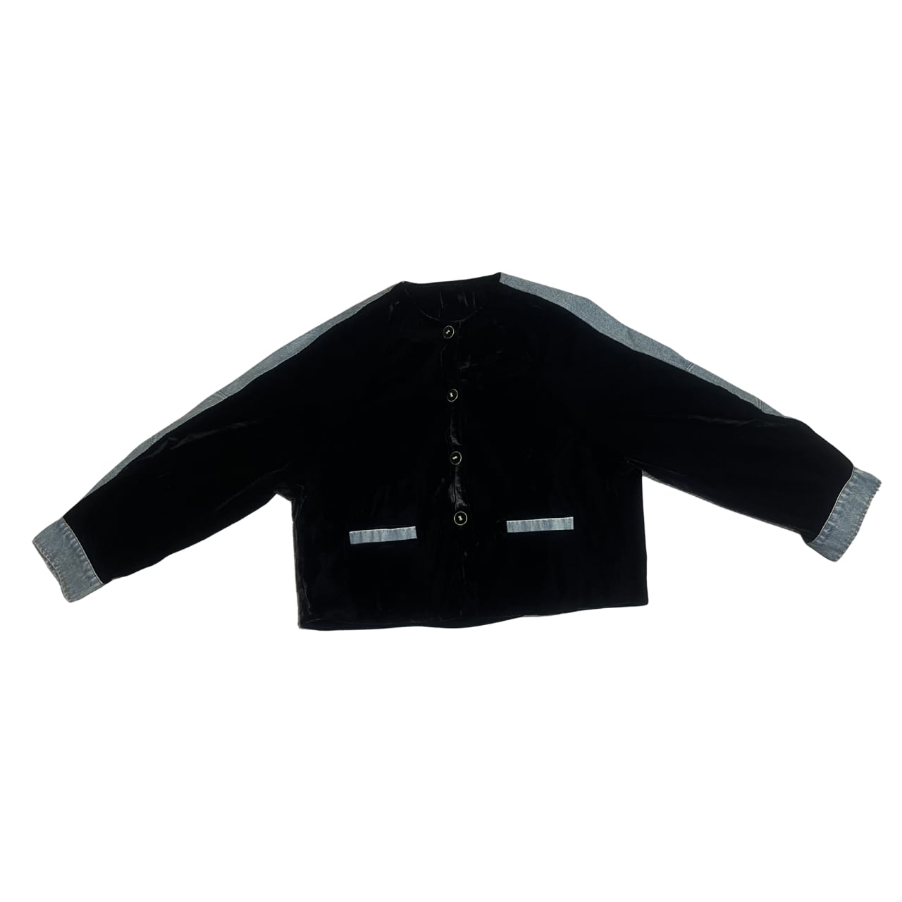 深みのあるブラックベルベットと、カジュアルなライトブルーデニムを組み合わせた、まさに今の気分を表現するパッチワークジャケット。
