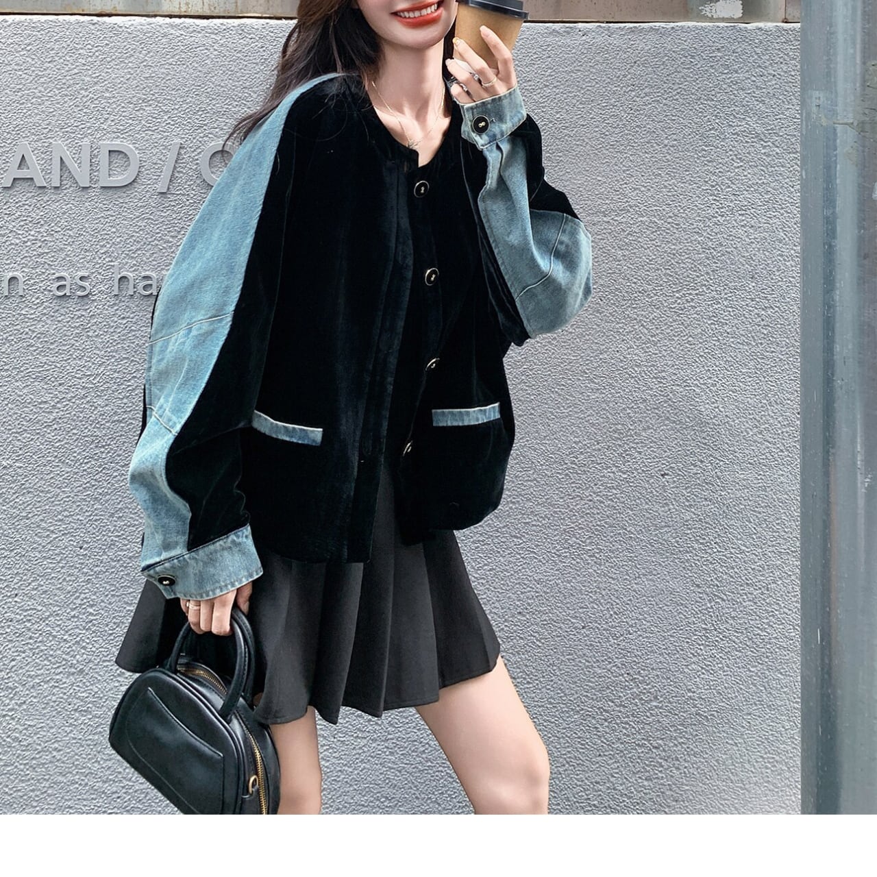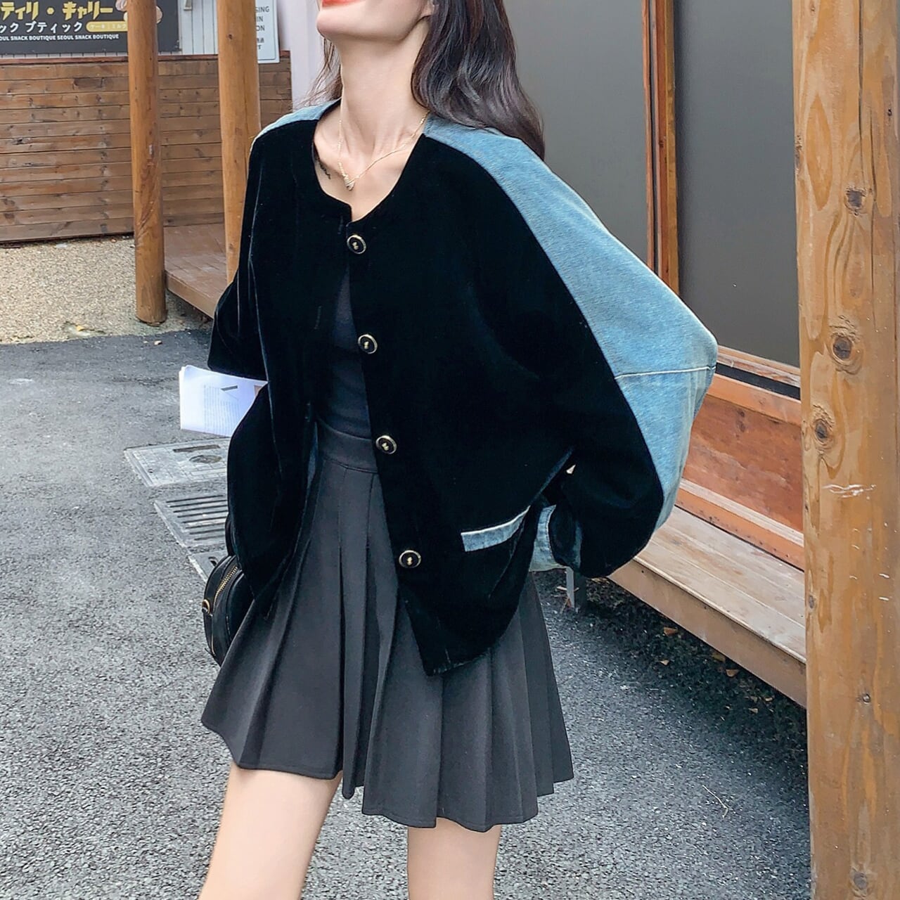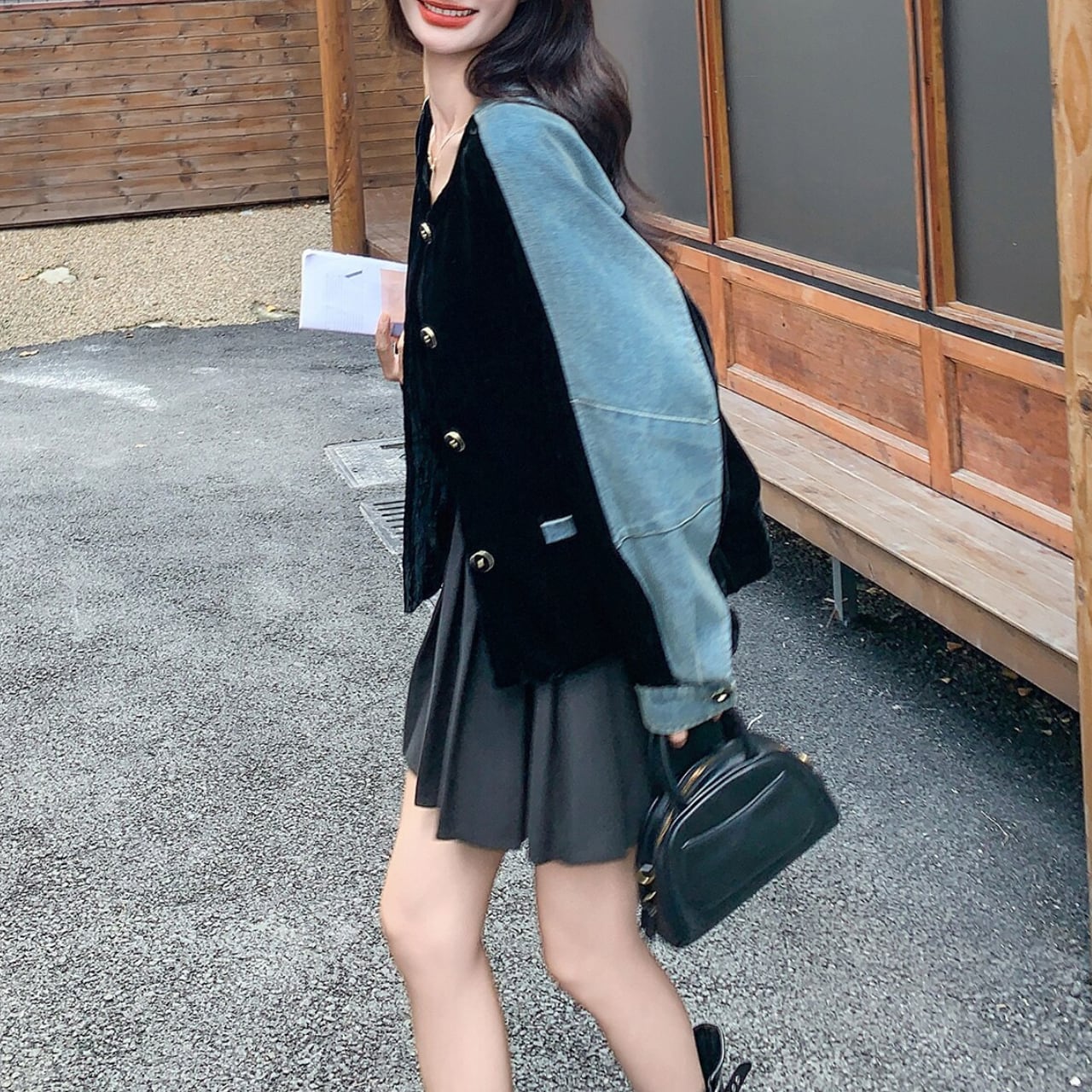 深みのあるブラックベルベットと、カジュアルなライトブルーデニムを組み合わせた、まさに今の気分を表現するパッチワークジャケット。