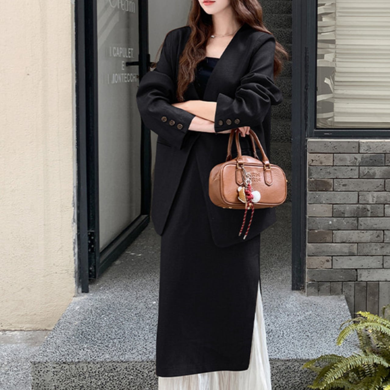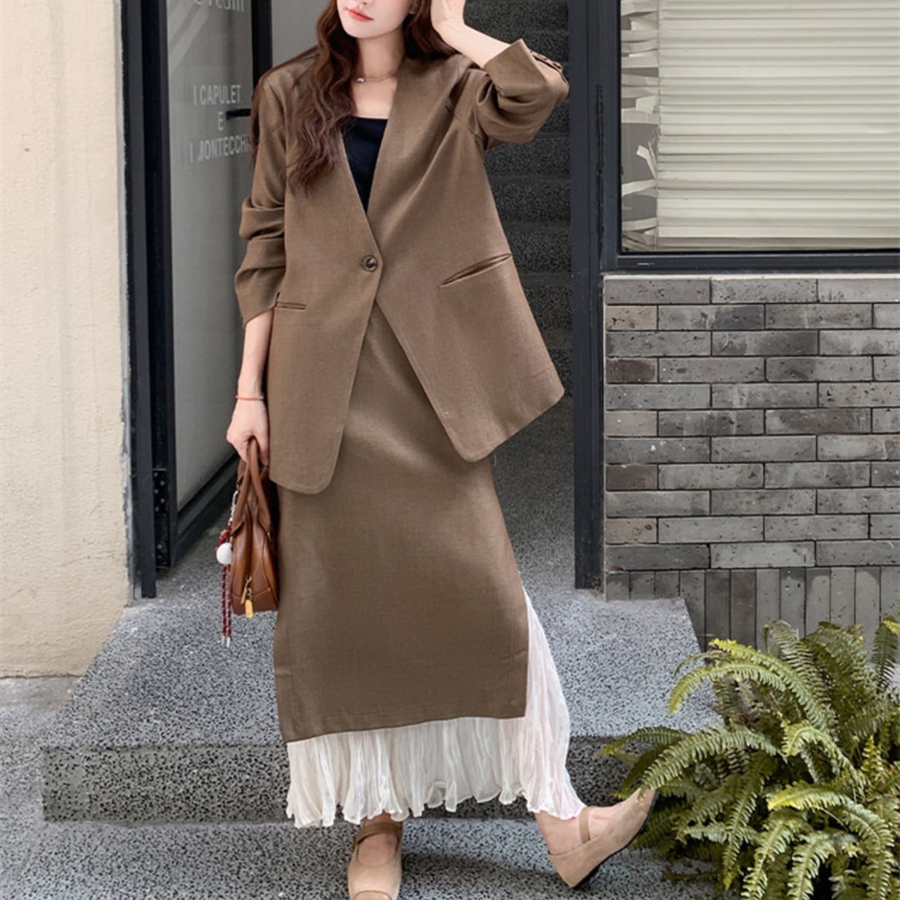 ・シンプルなアクセサリーと合わせて、クラス感のあるスタイルを演出。
