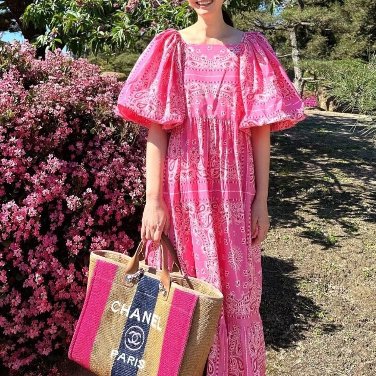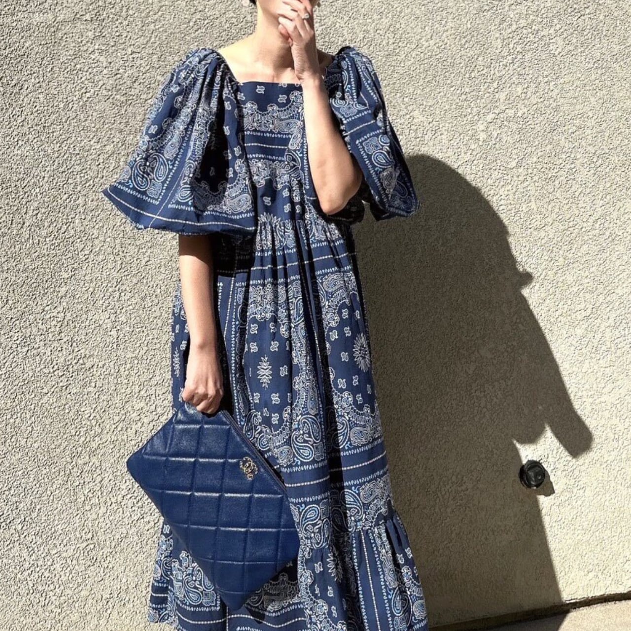 バンダナ柄からインスパイアされたペイズリープリントを全身に纏い、大きく膨らんだパフスリーブが肩まわりに華やかなボリュームを演出。