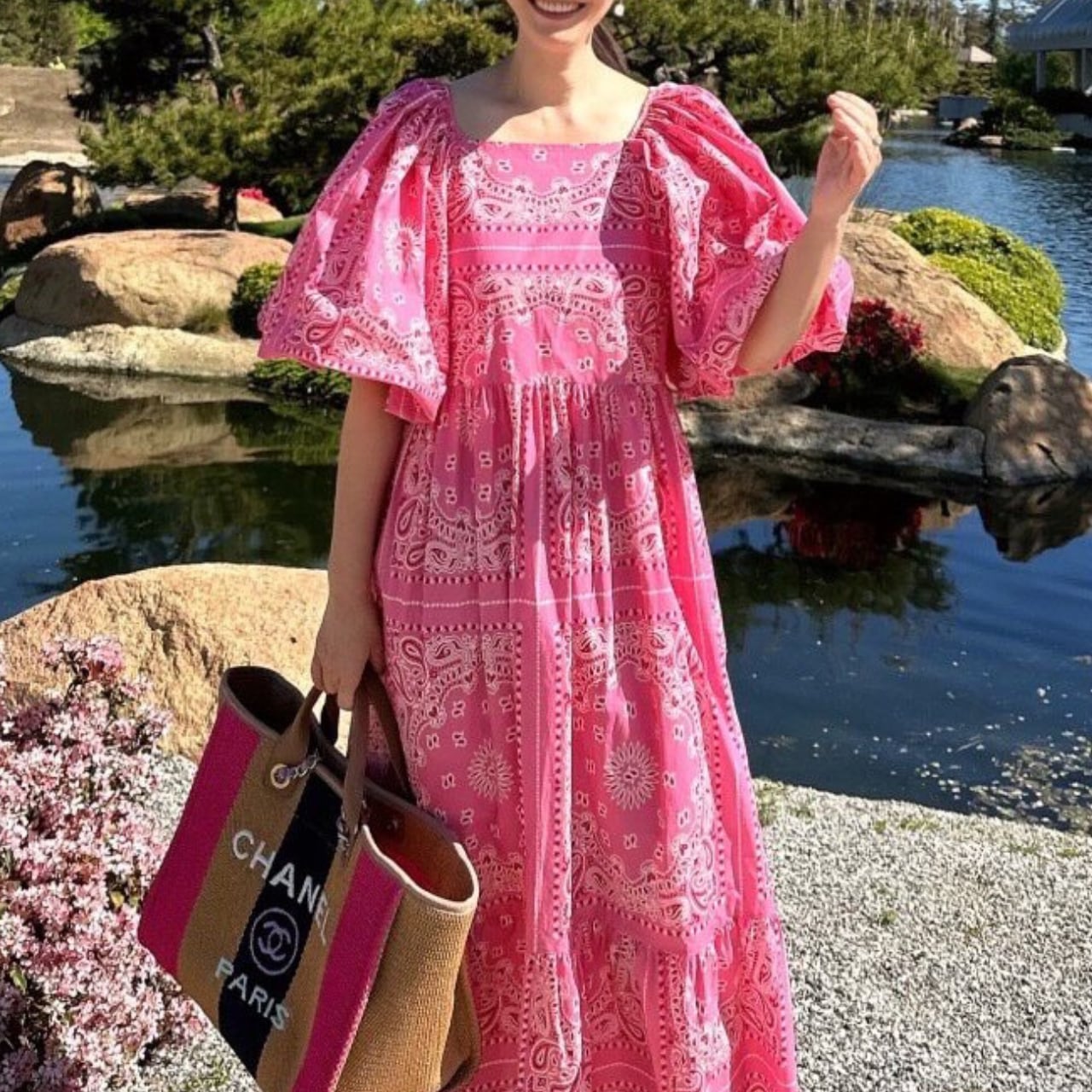 スクエアネックが鎖骨をすっきり見せながら、ふんわりと広がるAラインのマキシ丈シルエットが、風を孕むように揺れ動く。