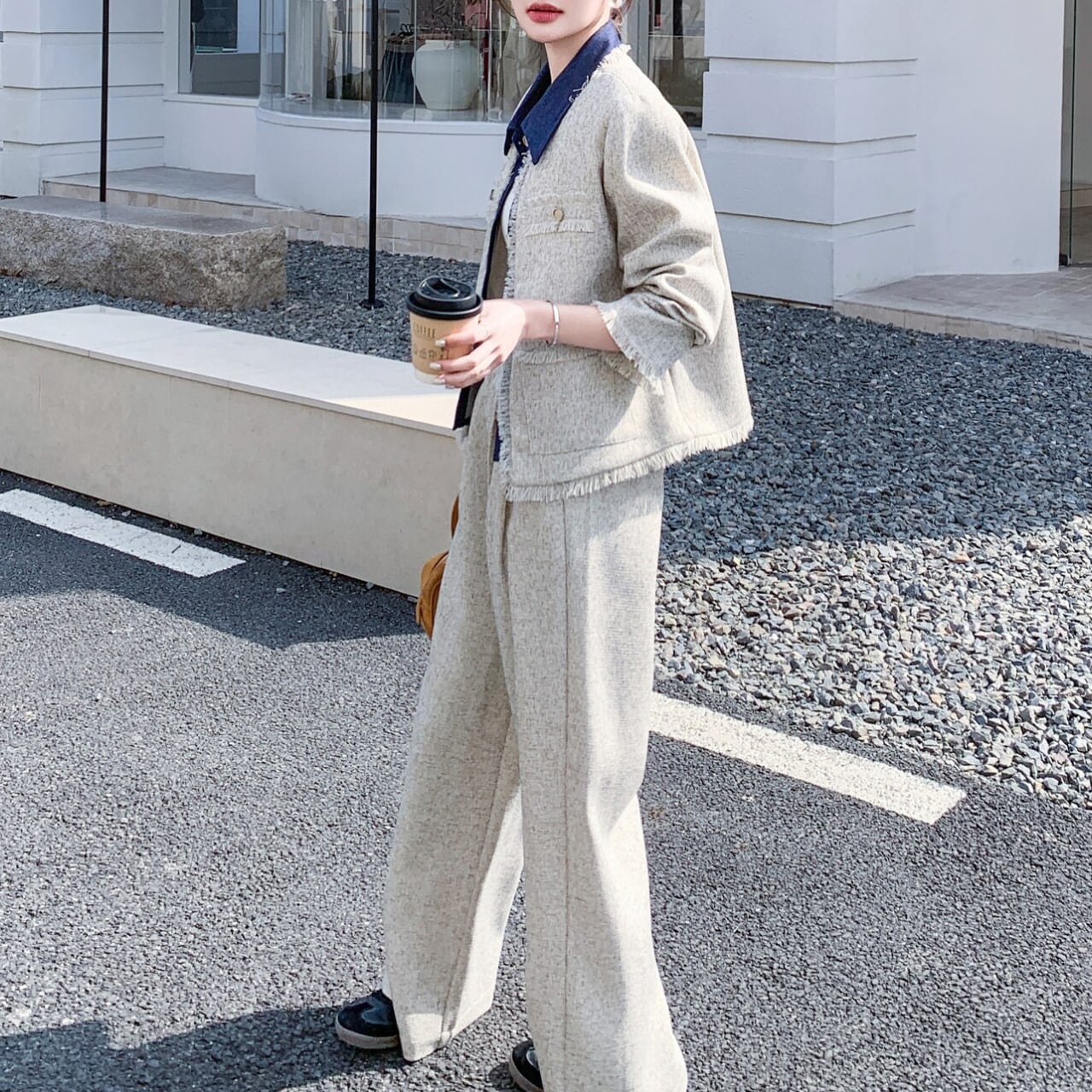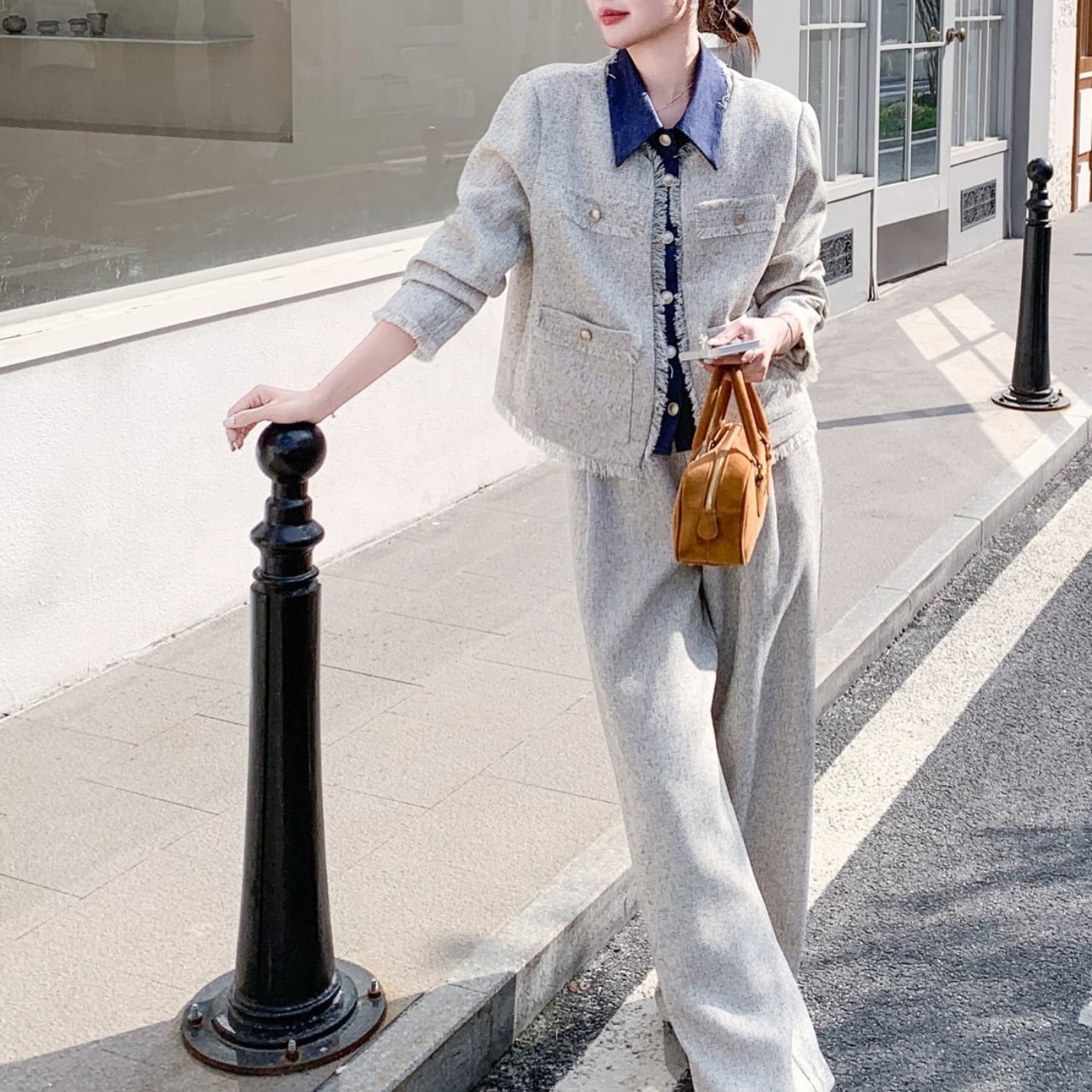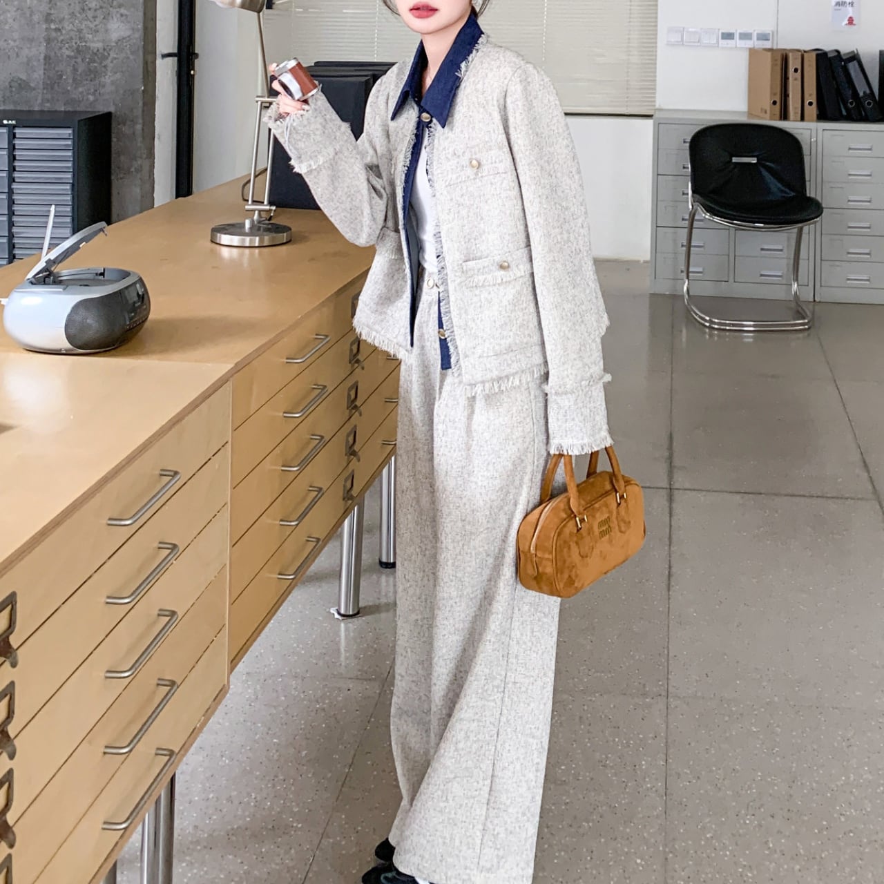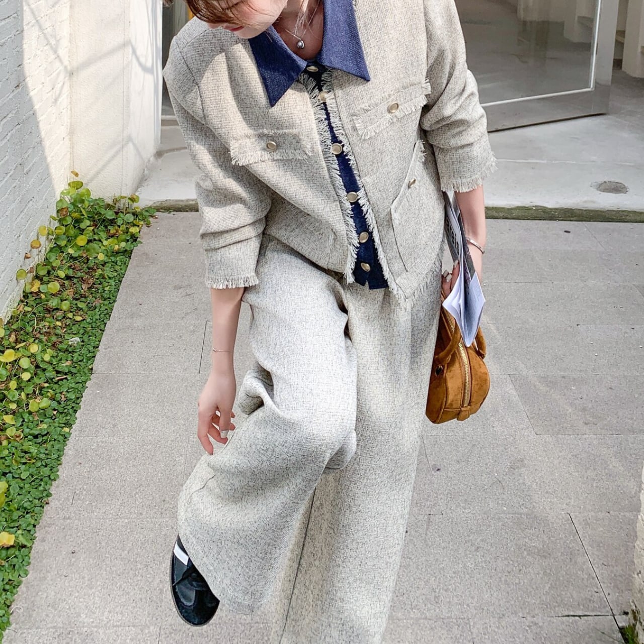 グレーのツイード素材にデニムを掛け合わせた、異素材ミックスのセットアップ。