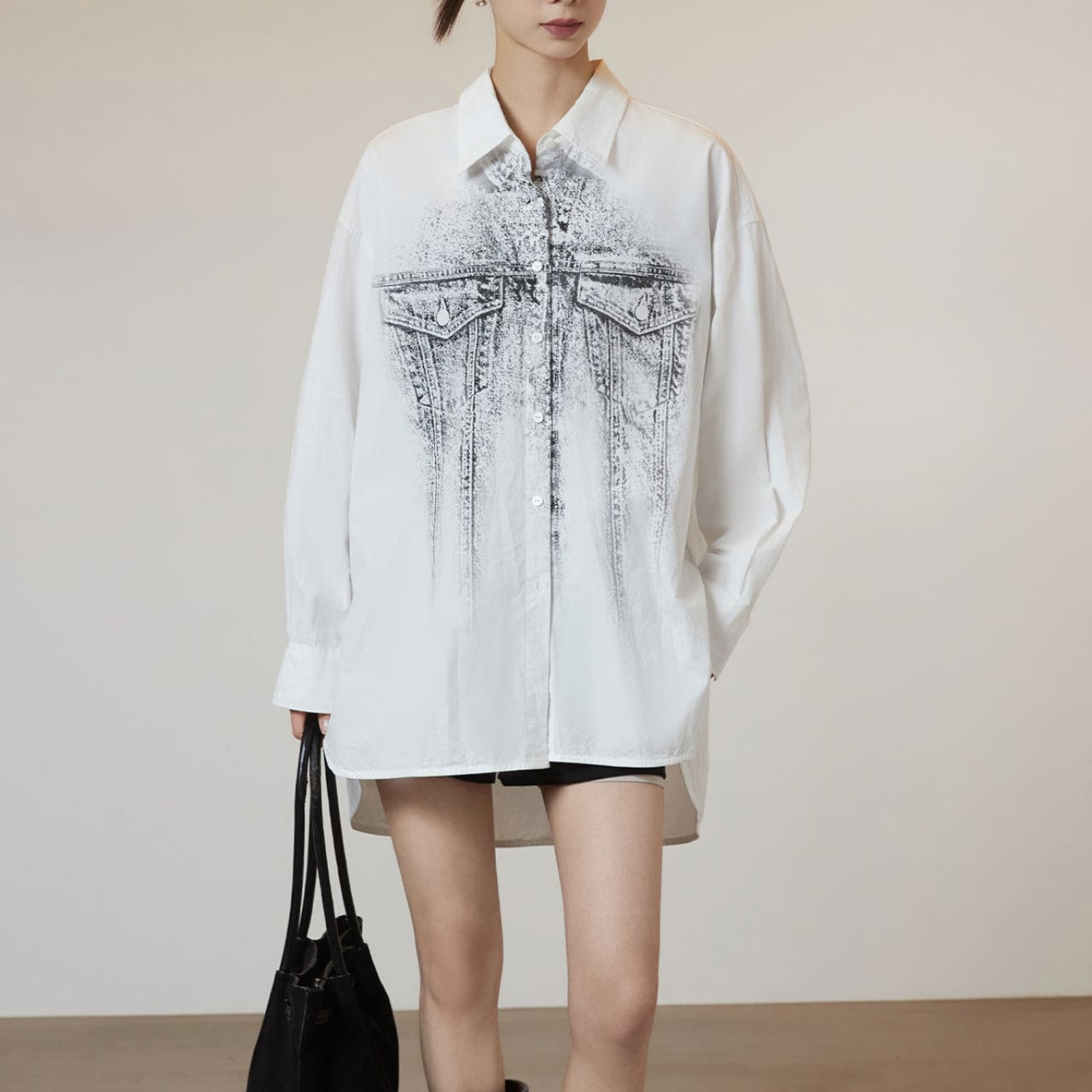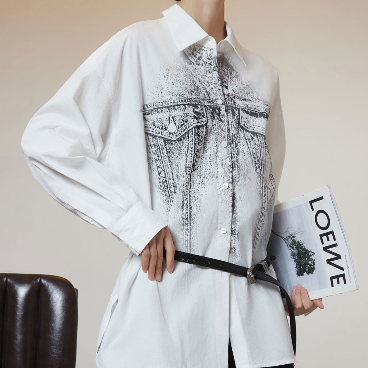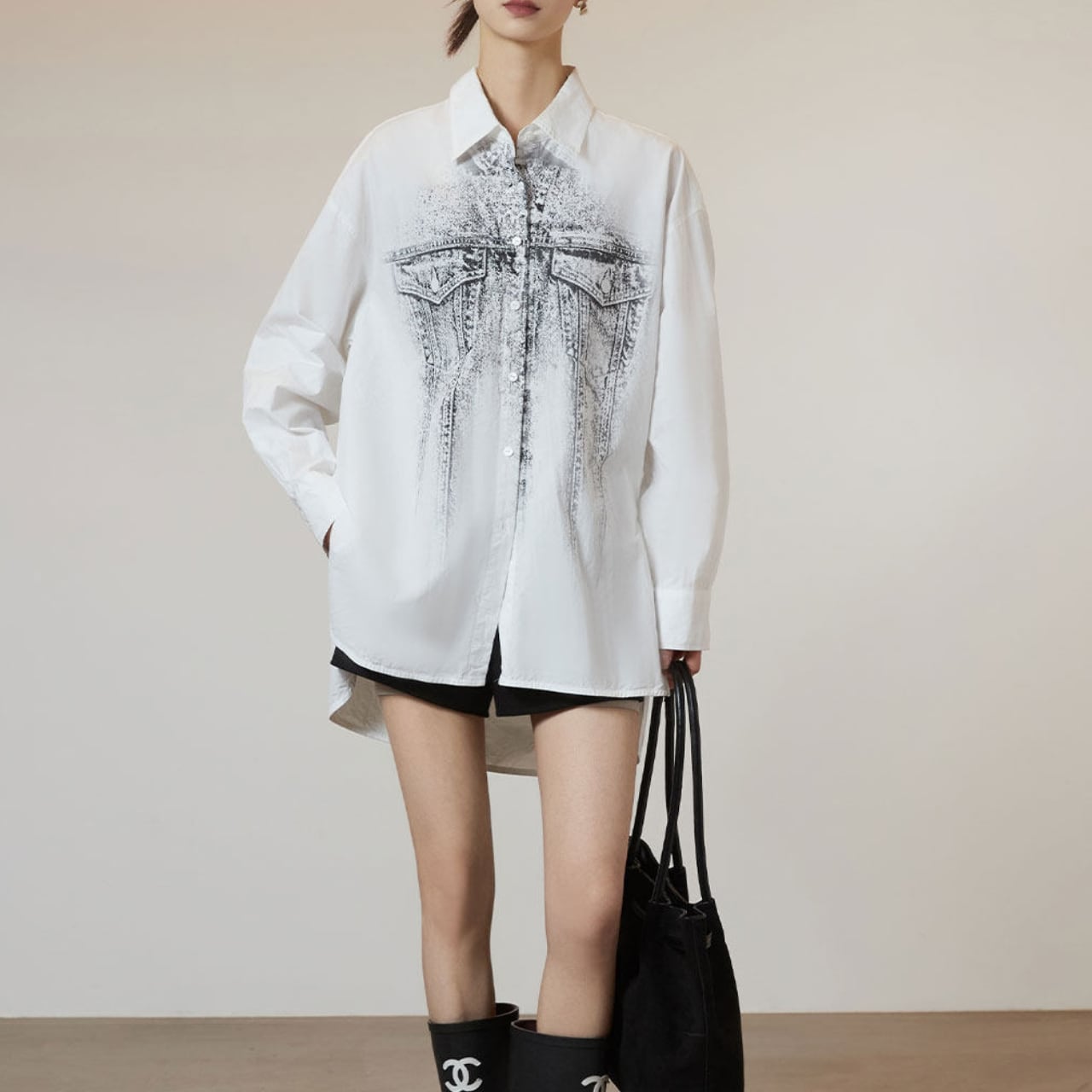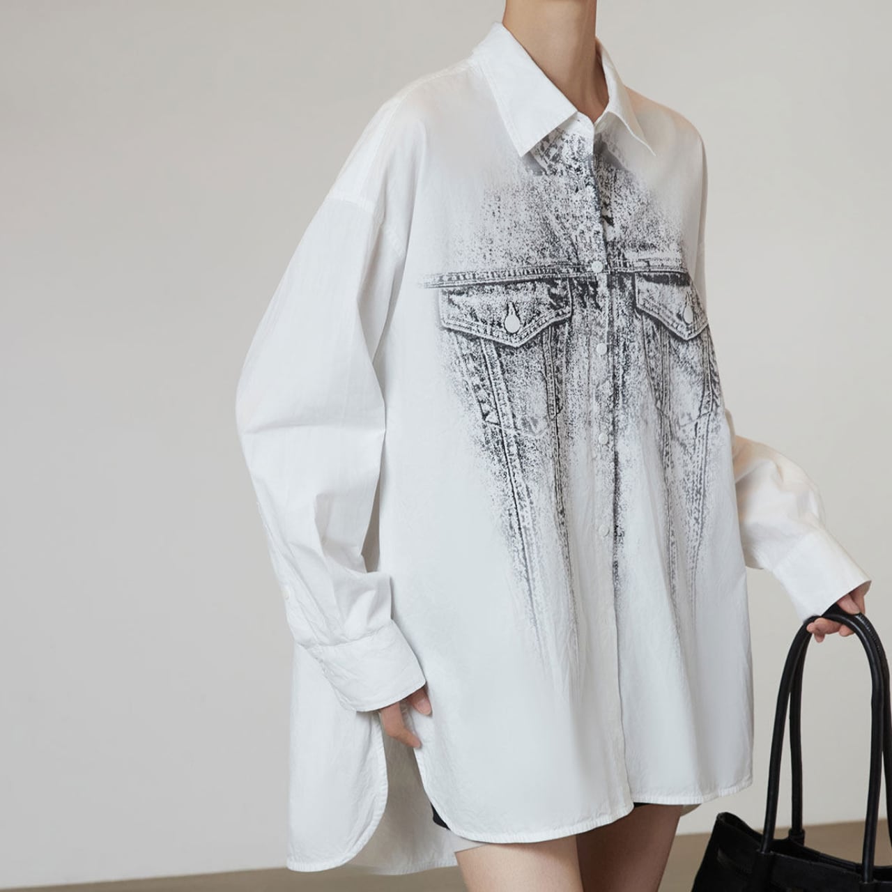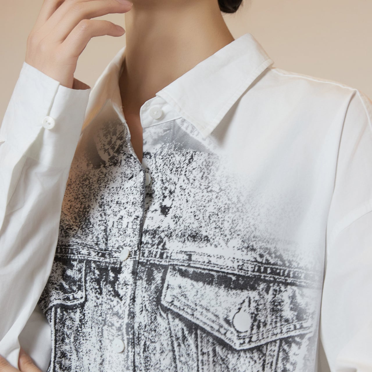 クリーンなホワイトシャツの上に、まるでデニムジャケットを重ねたかのようなトロンプルイユ(だまし絵)グラフィックをプリント。