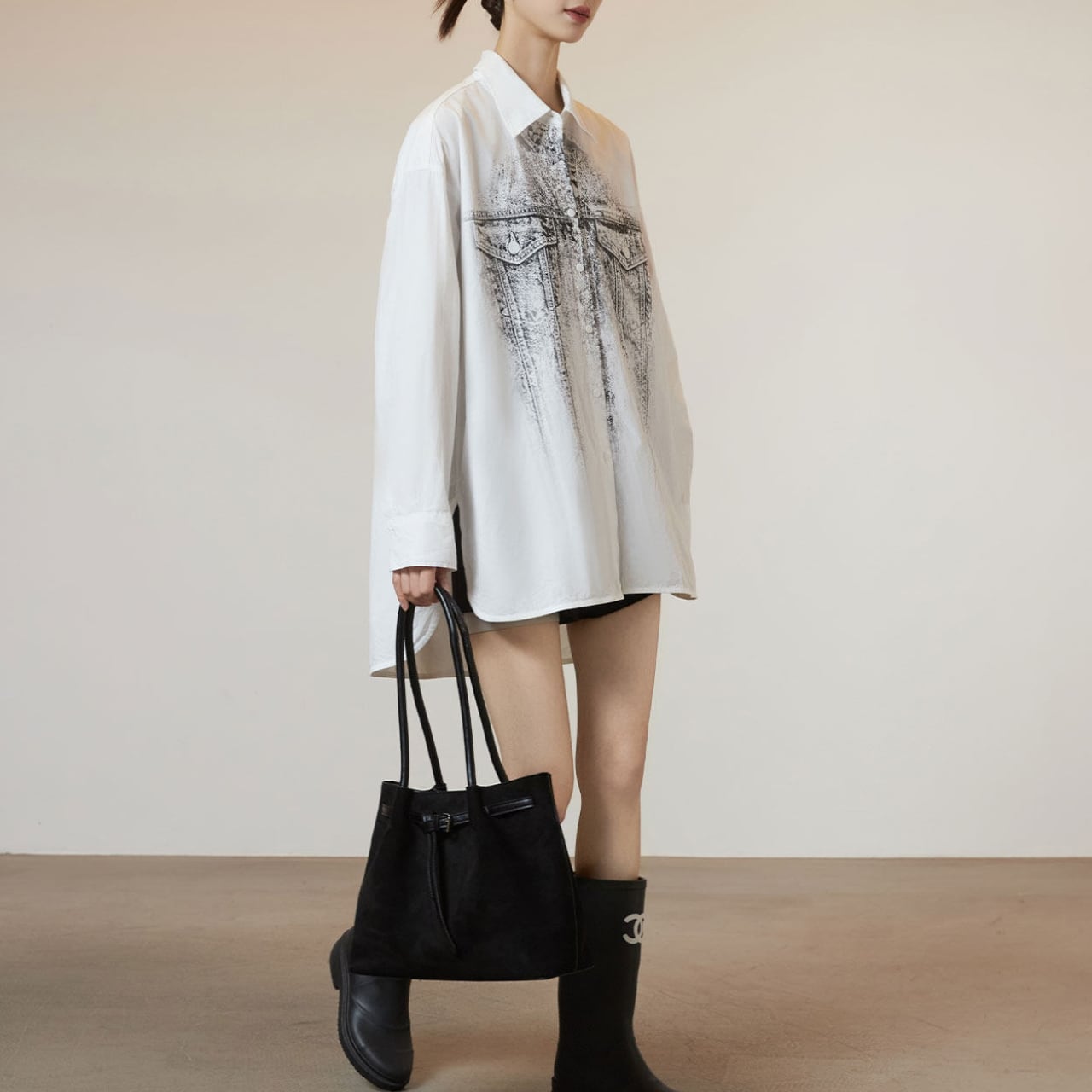 インナーにブラックショートパンツやタイトミニを合わせるだけで、グラフィックを最大限に見せる今っぽいシルエットが完成します。