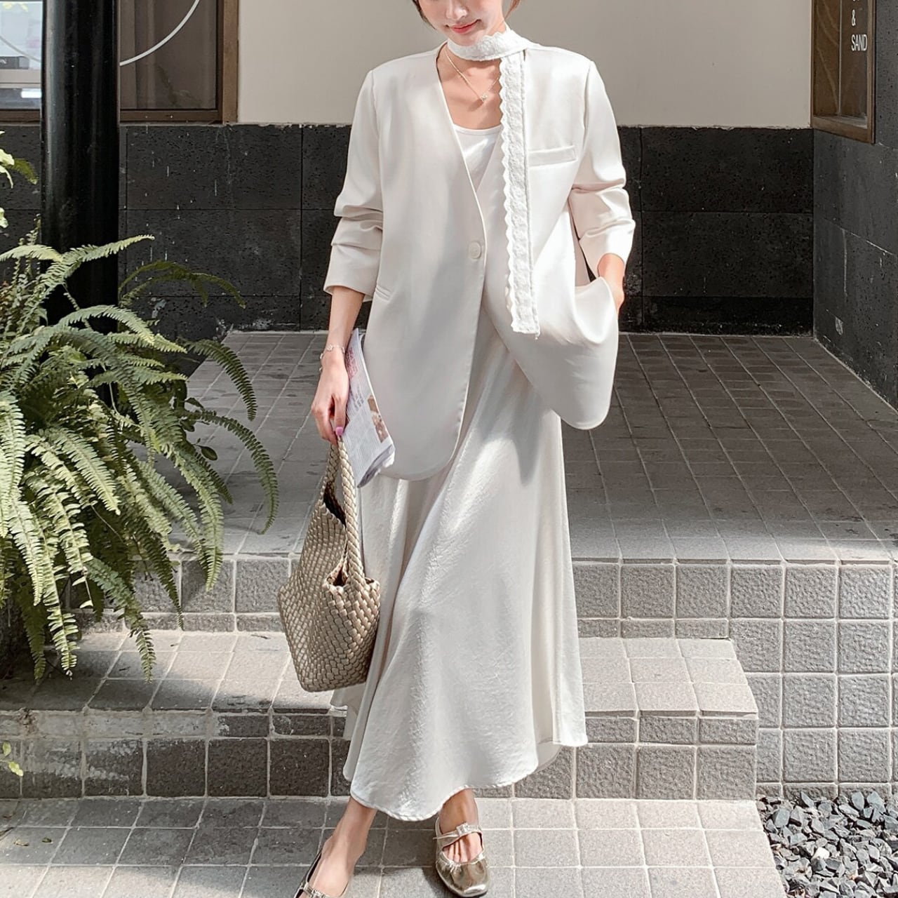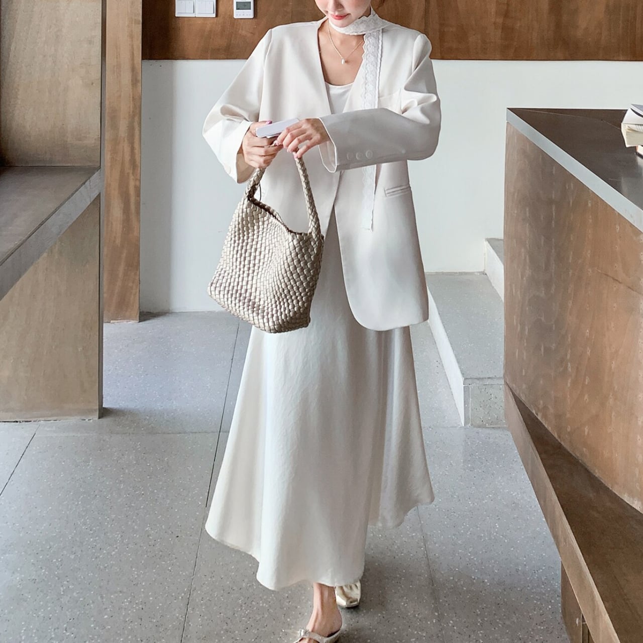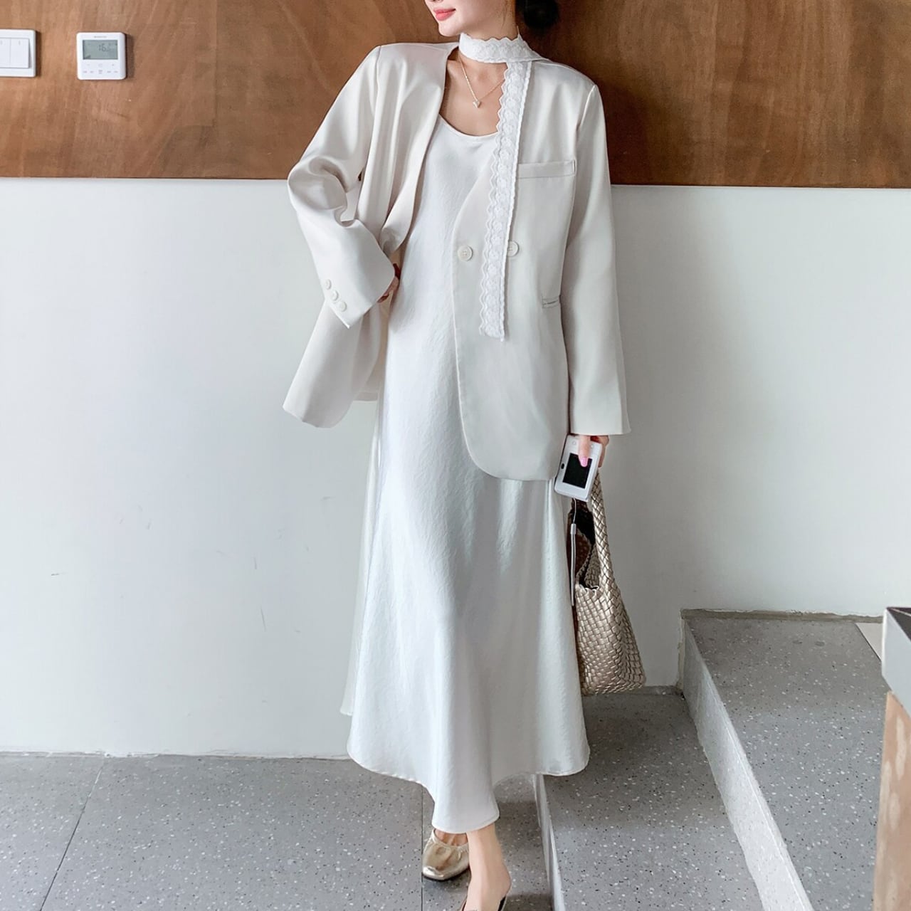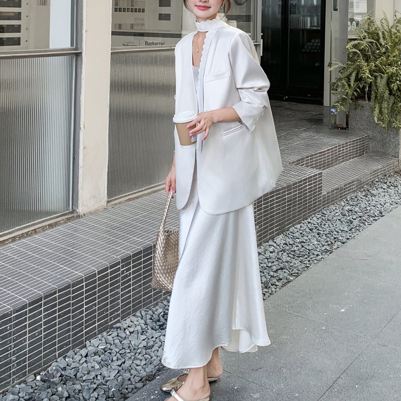 マットなオフホワイトジャケットと、光を纏うサテンマキシワンピース。