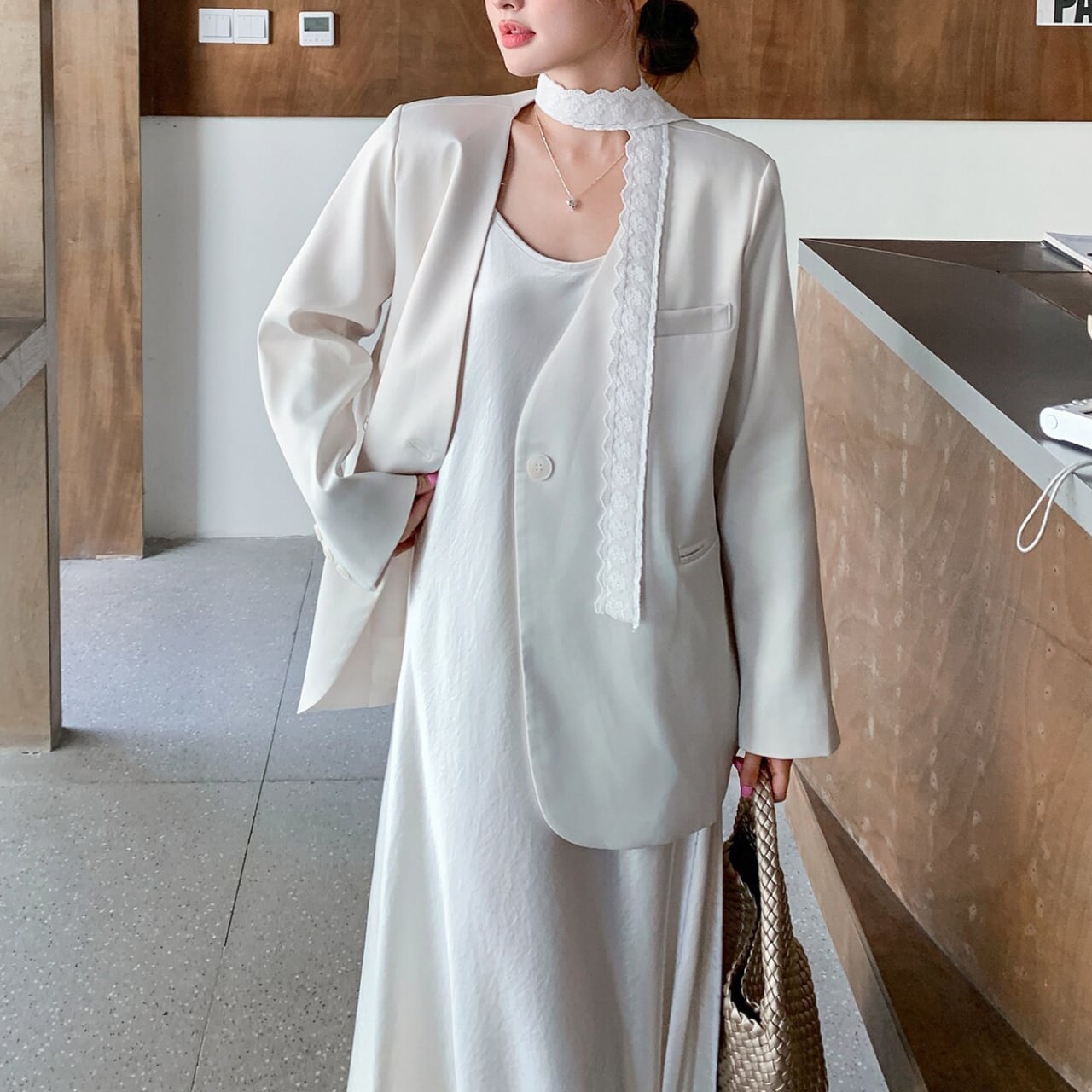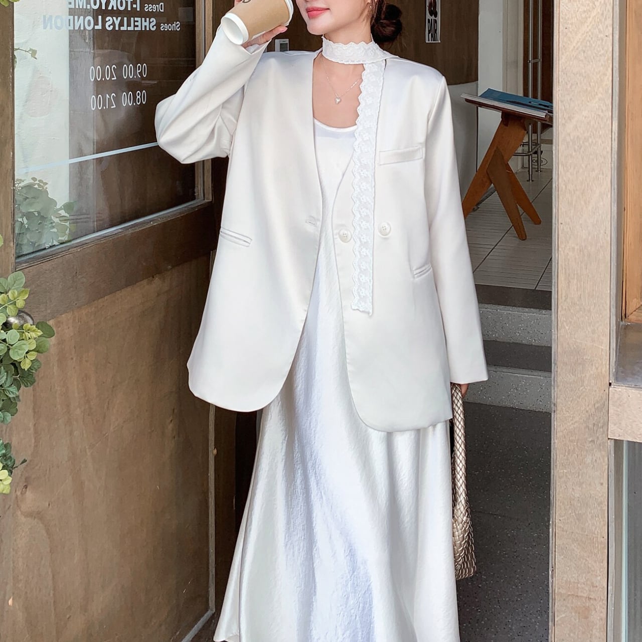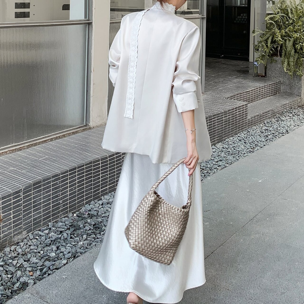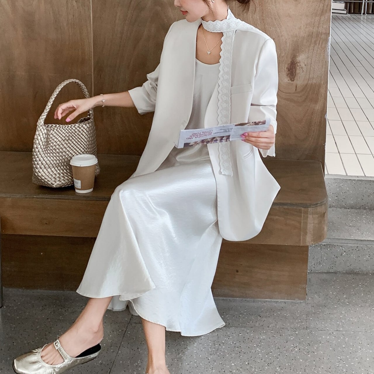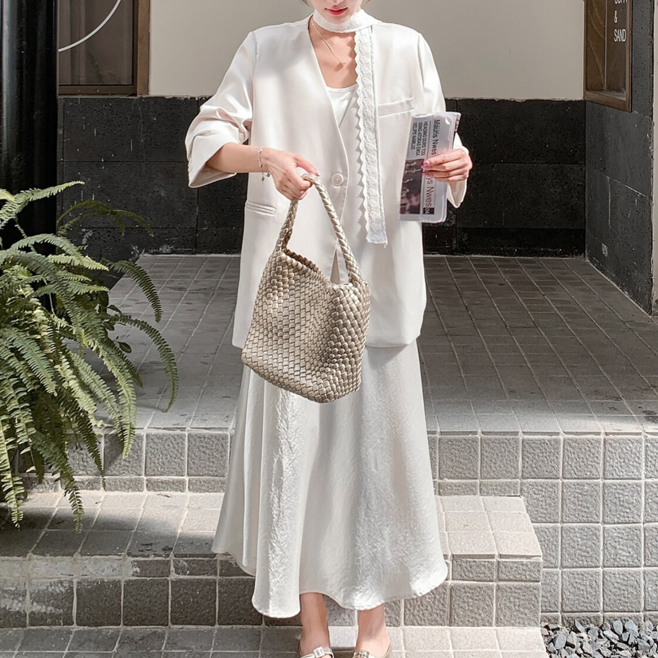 マットなオフホワイトジャケットと、光を纏うサテンマキシワンピース。