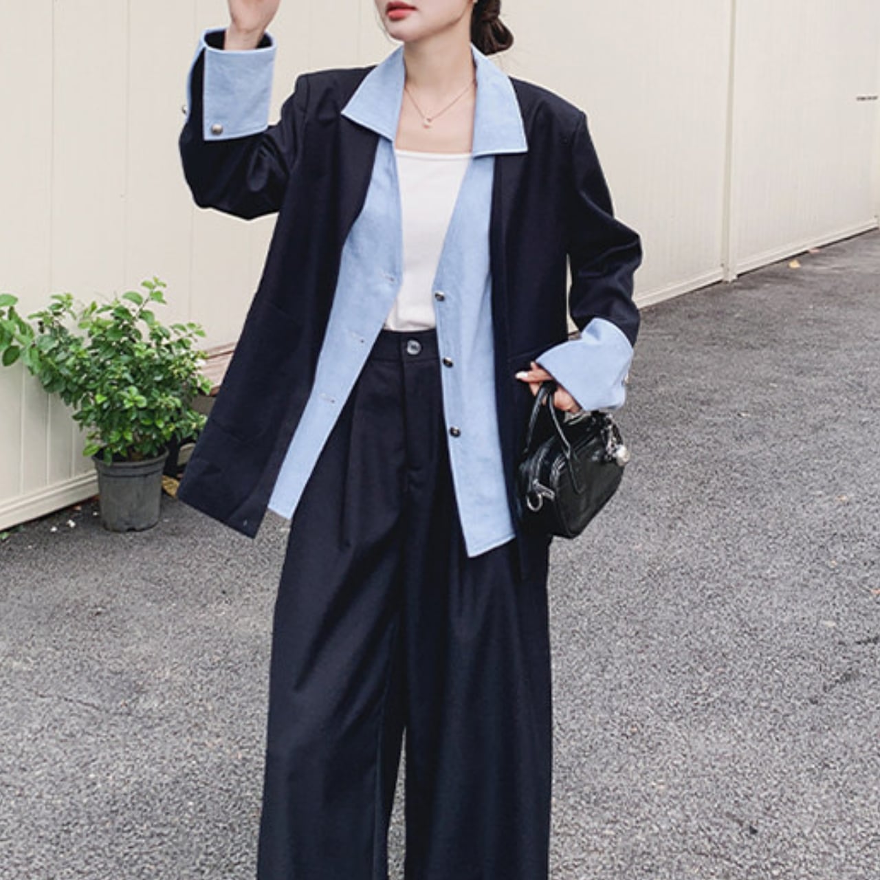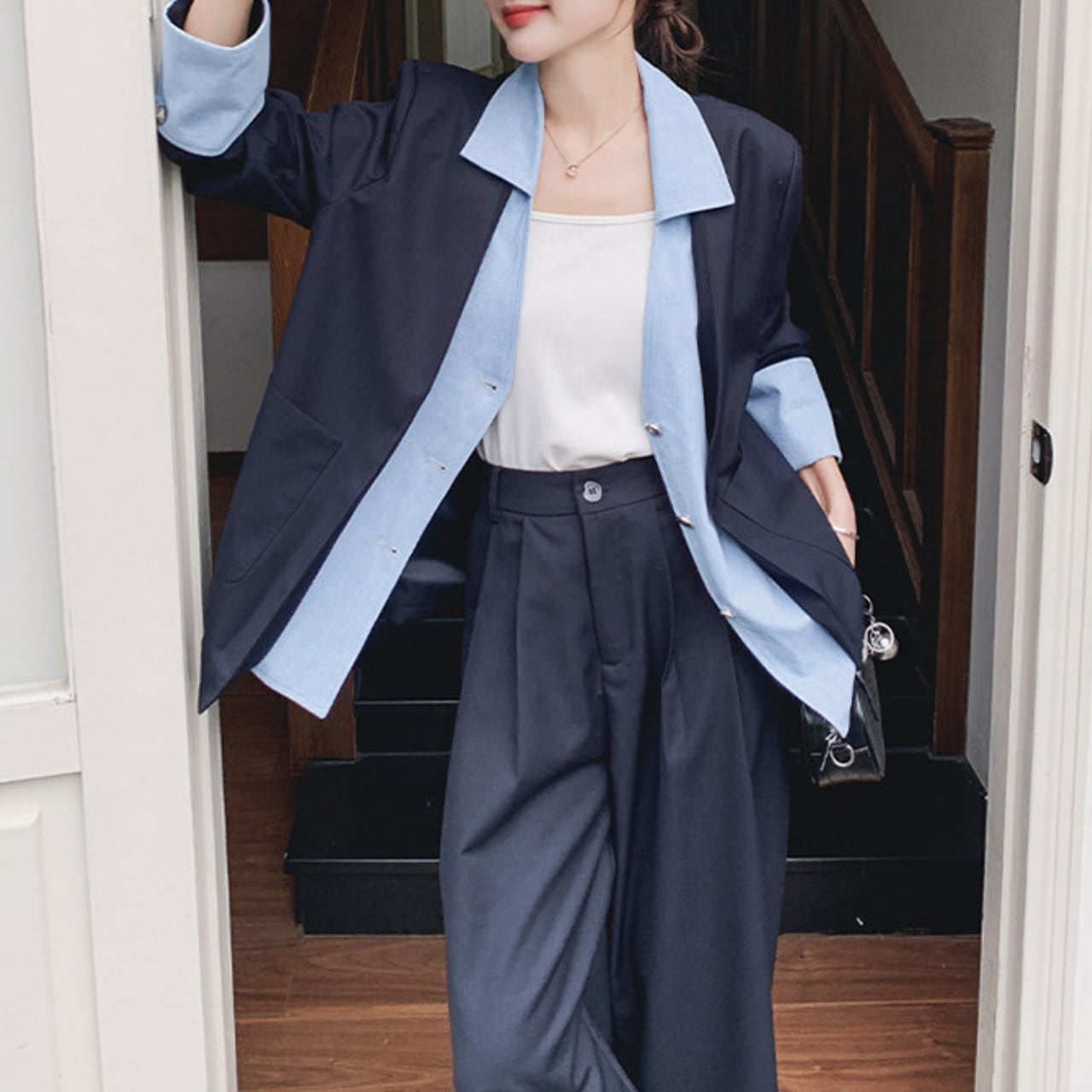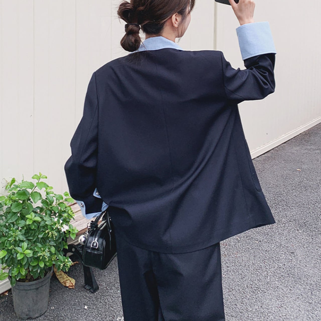 ダークネイビーのオーバーサイズジャケットの内側から、スカイブルーの襟とカフスが顔を覗かせるバイカラーレイヤードデザイン。