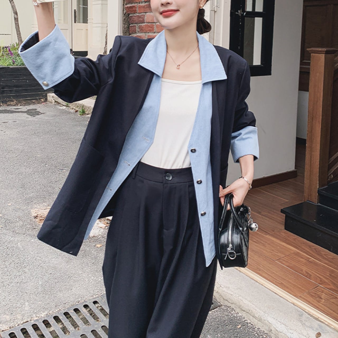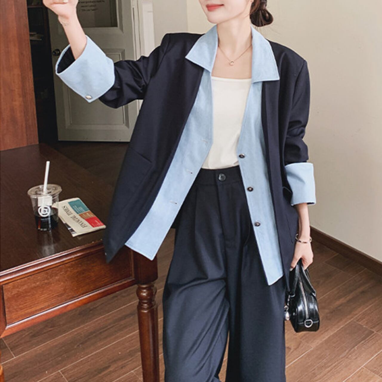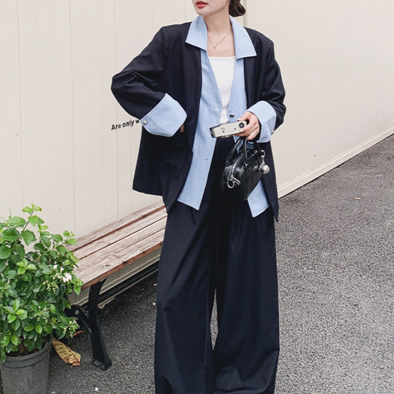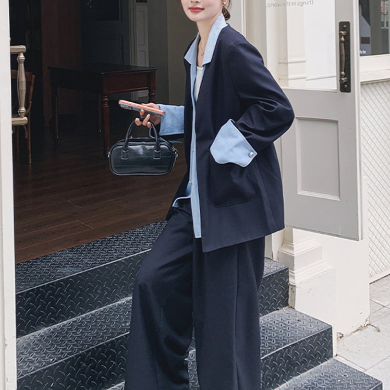 ダークネイビーのオーバーサイズジャケットの内側から、スカイブルーの襟とカフスが顔を覗かせるバイカラーレイヤードデザイン。