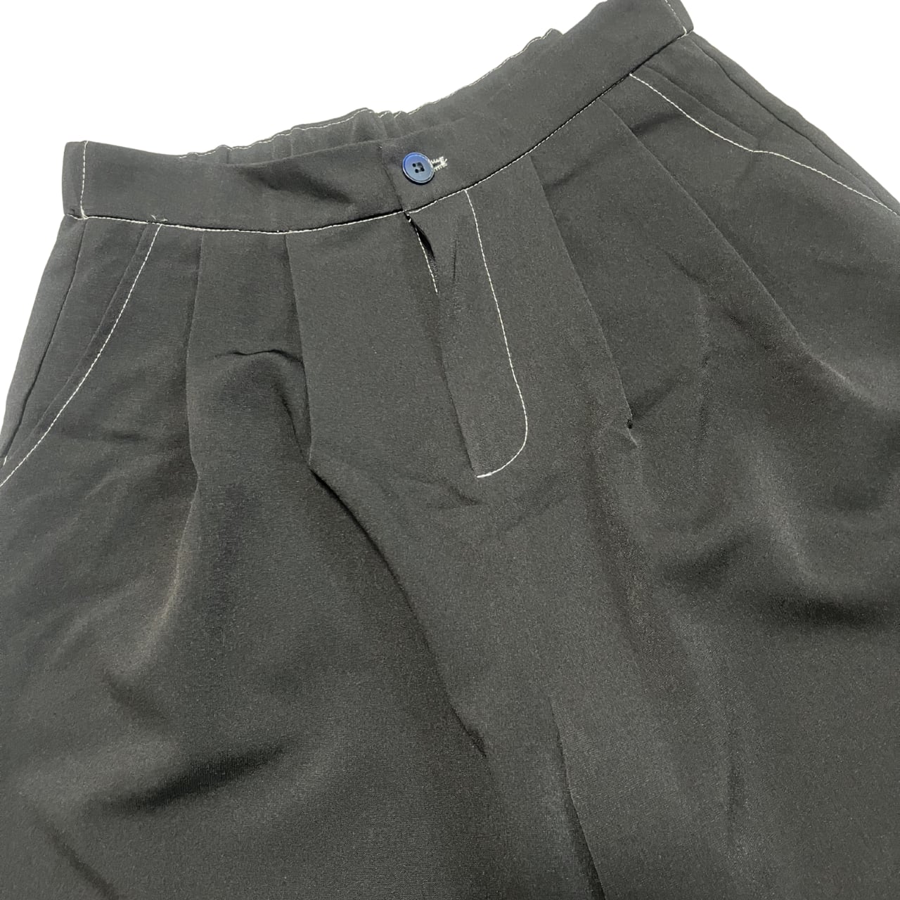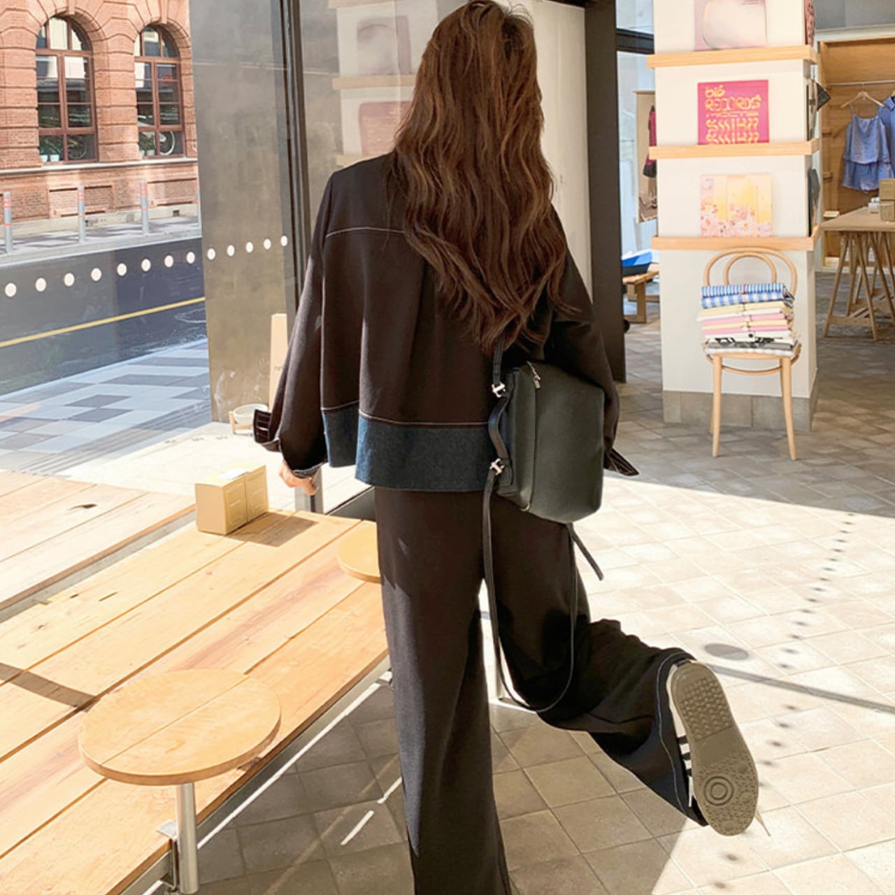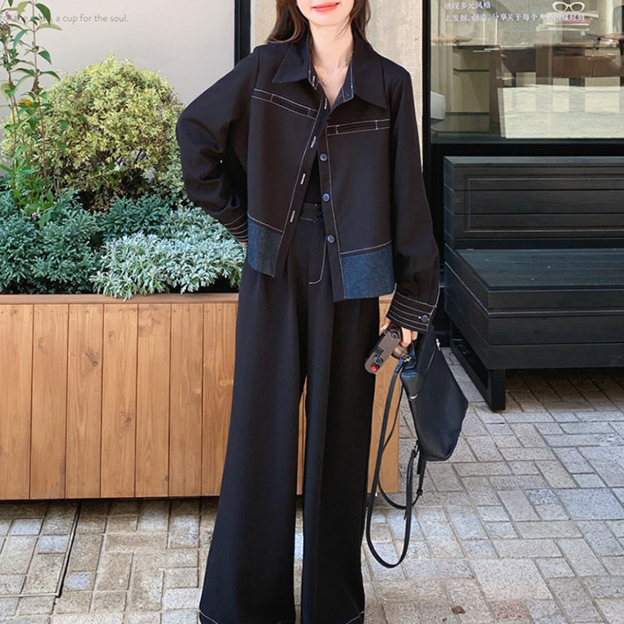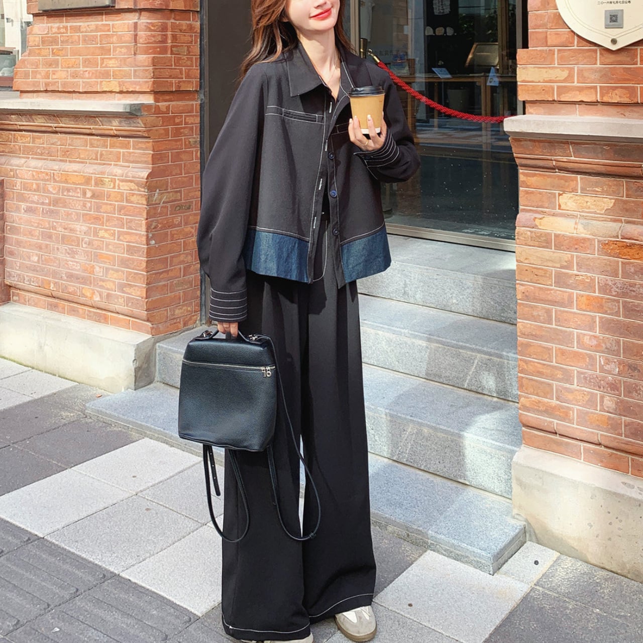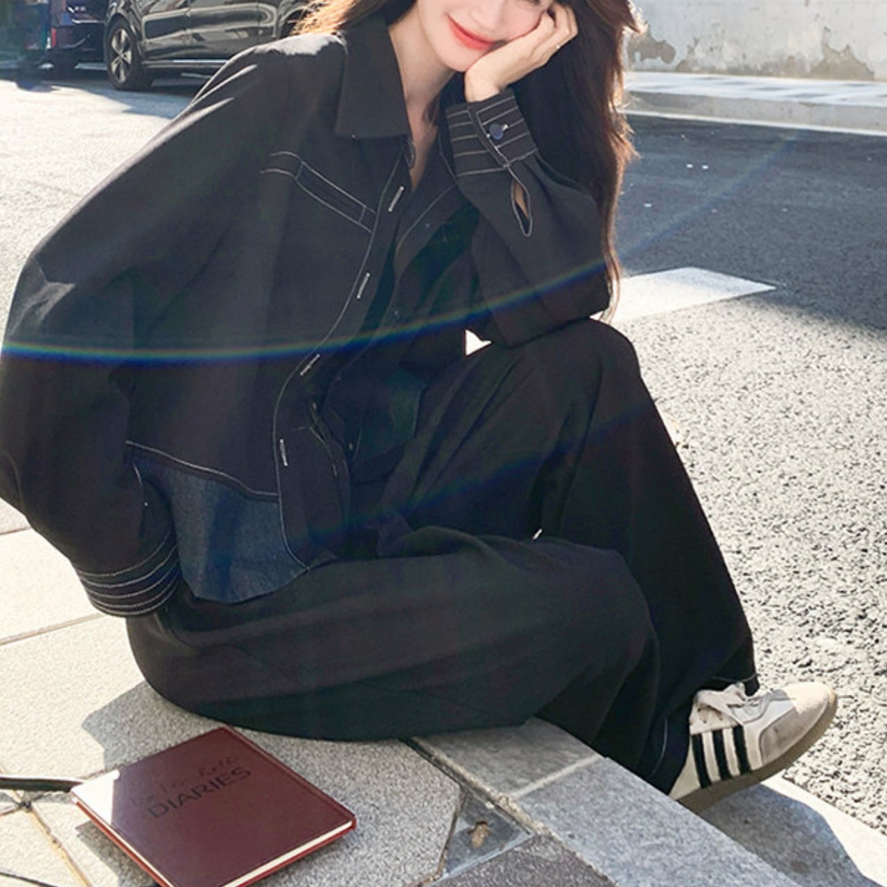 ミニマルなオールブラックのシルエットの中に、異素材の切り替えと縫い目の表情が静かに主張し、「ただの黒」では終わらない奥行きと個性を生み出します。
