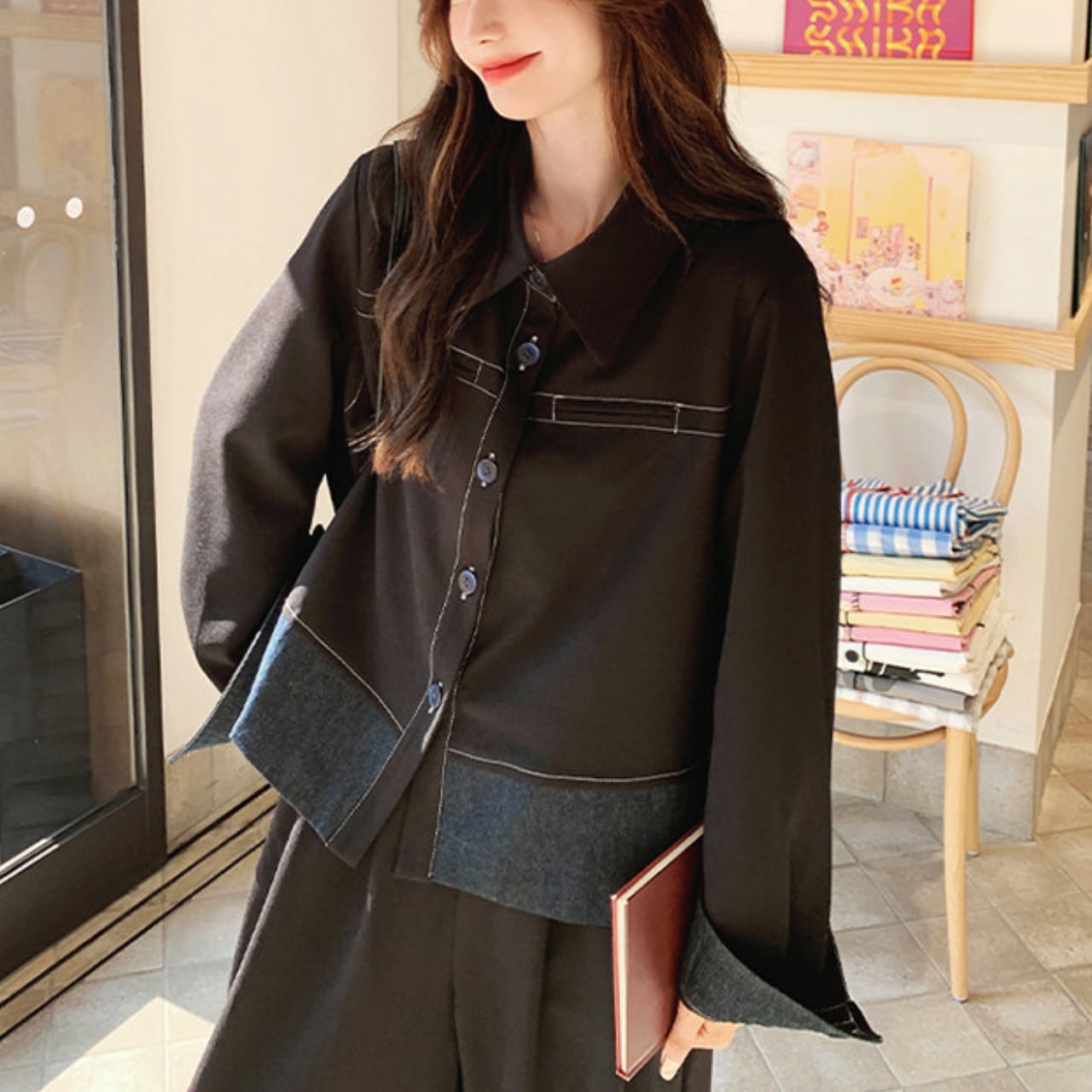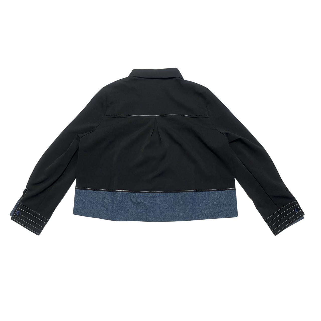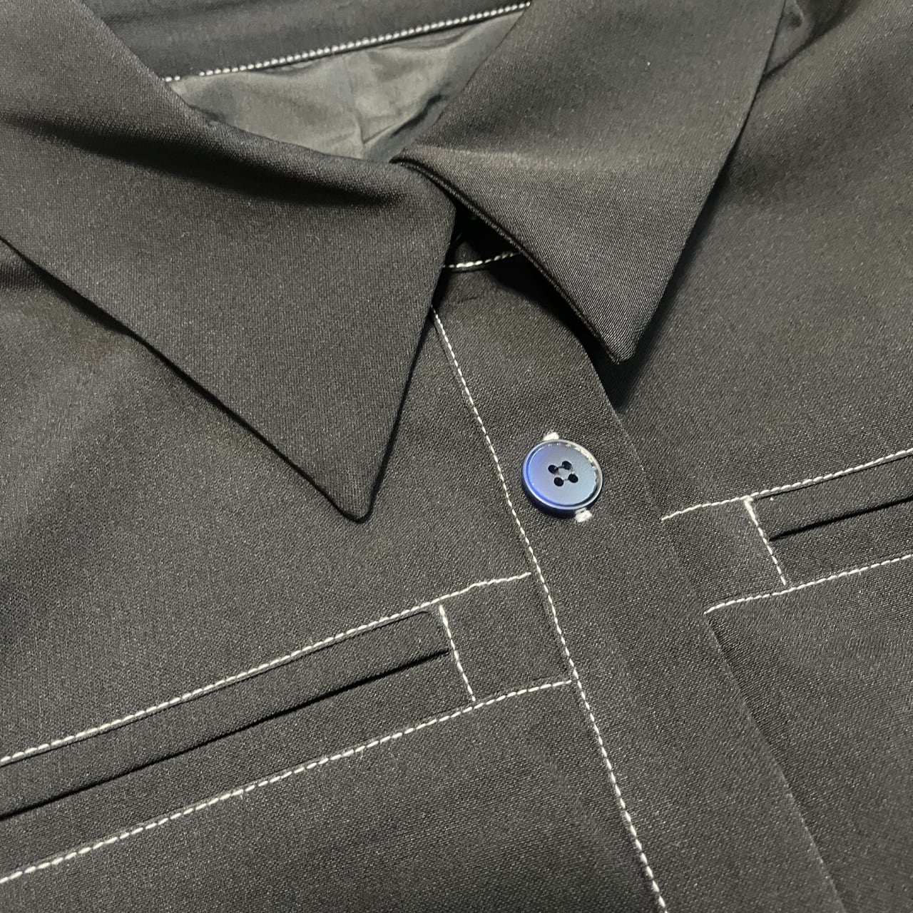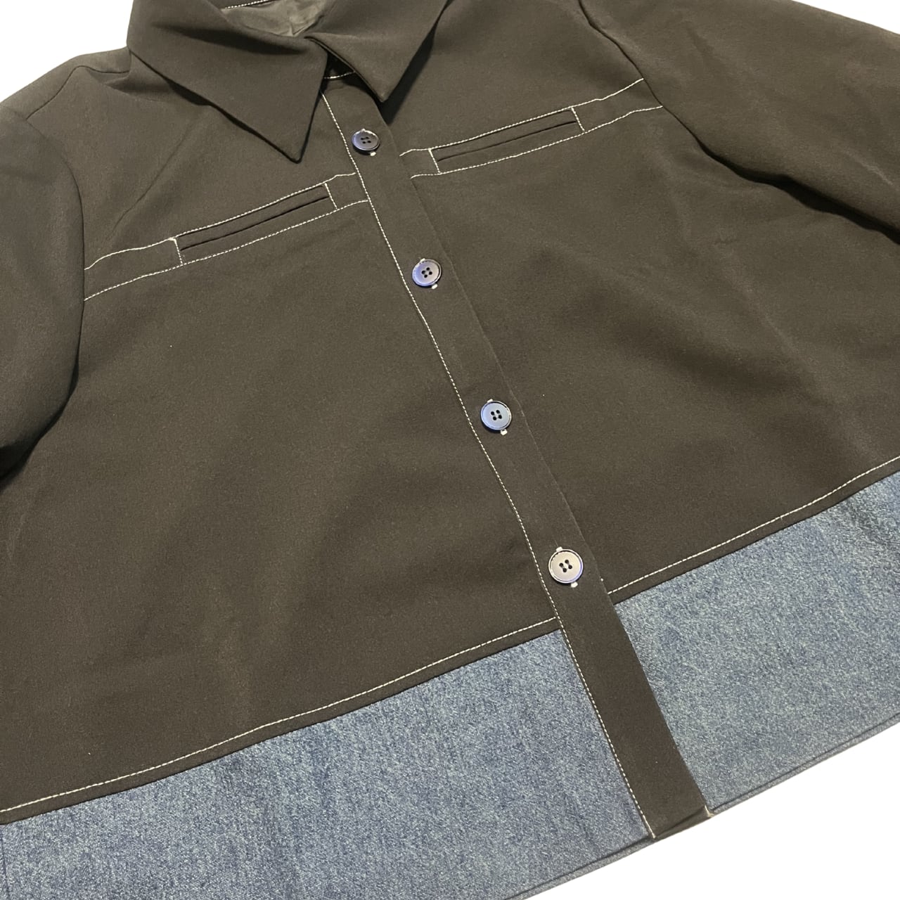 ブラックのシャツに施されたホワイトステッチと、裾・カフスに配置されたインディゴデニムのパッチワーク。