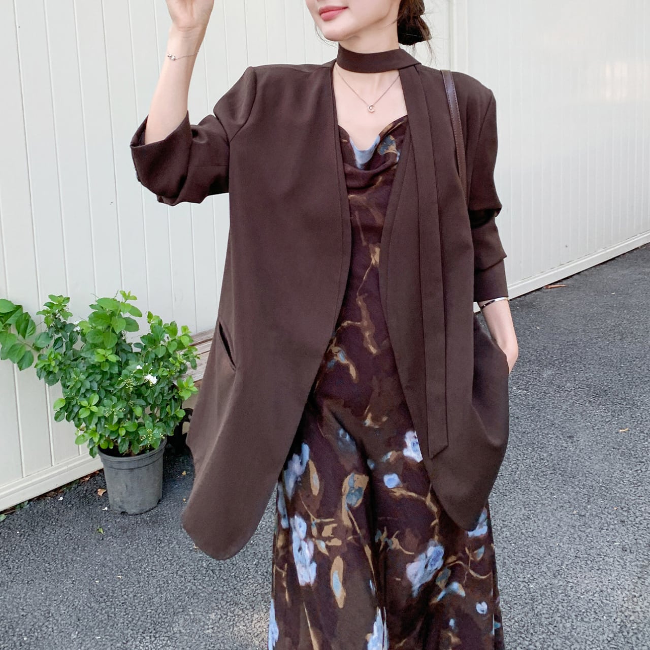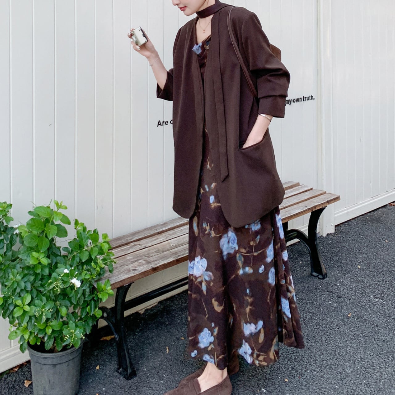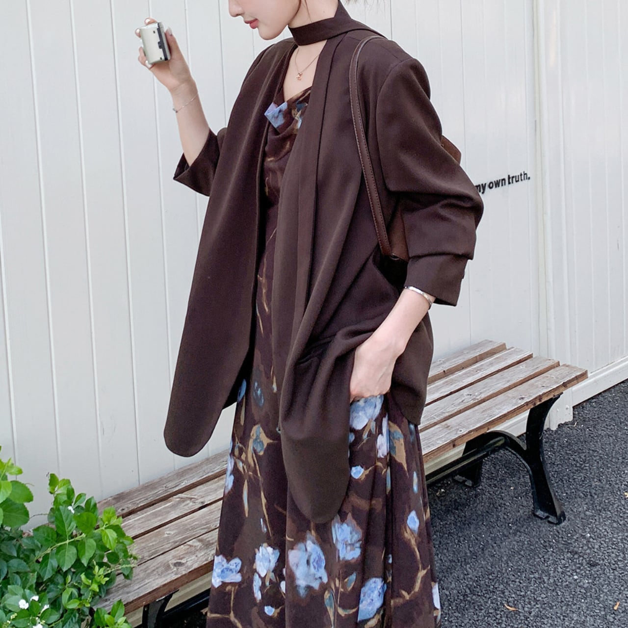 ワンピースと同トーンのブラウンが統一感を生み、こなれたレイヤードスタイルを完成させます。