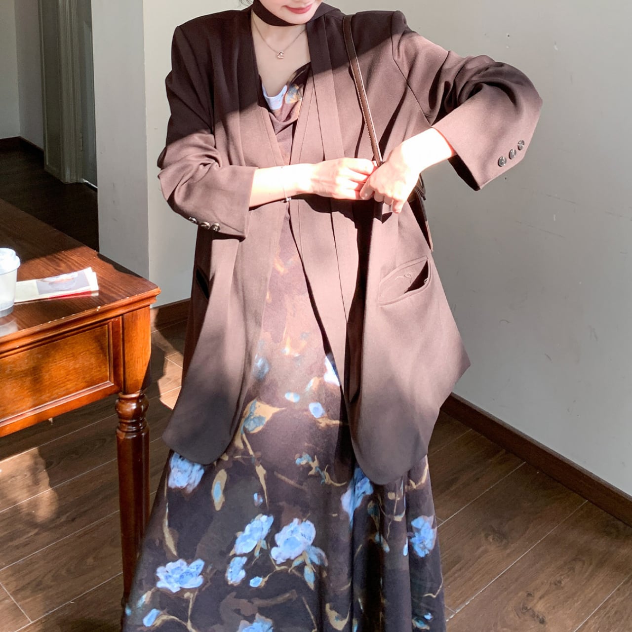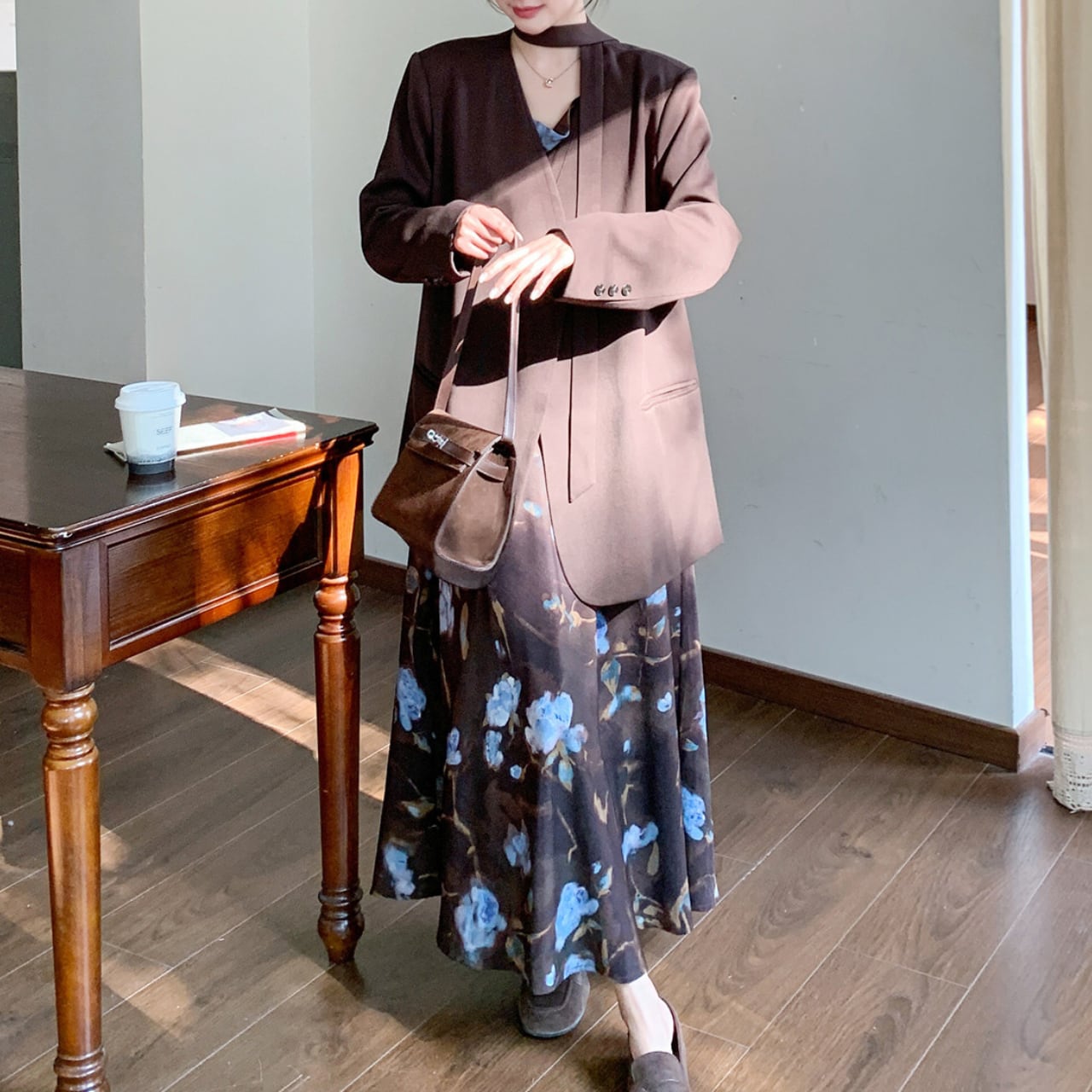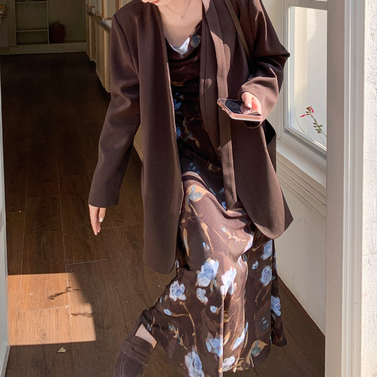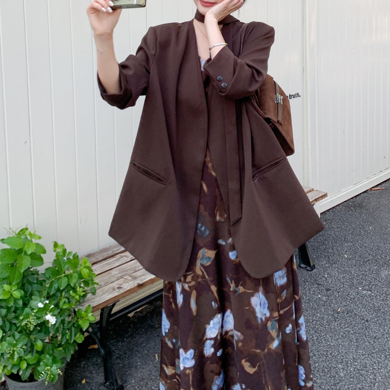 ワンピースと同トーンのブラウンが統一感を生み、こなれたレイヤードスタイルを完成させます。