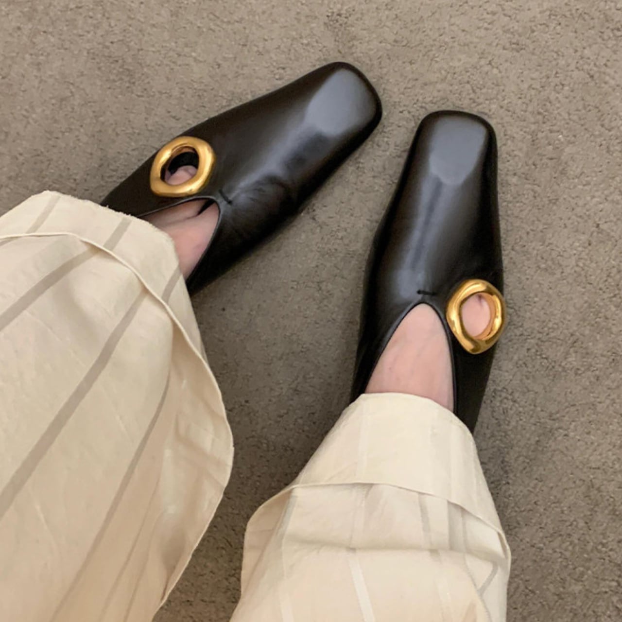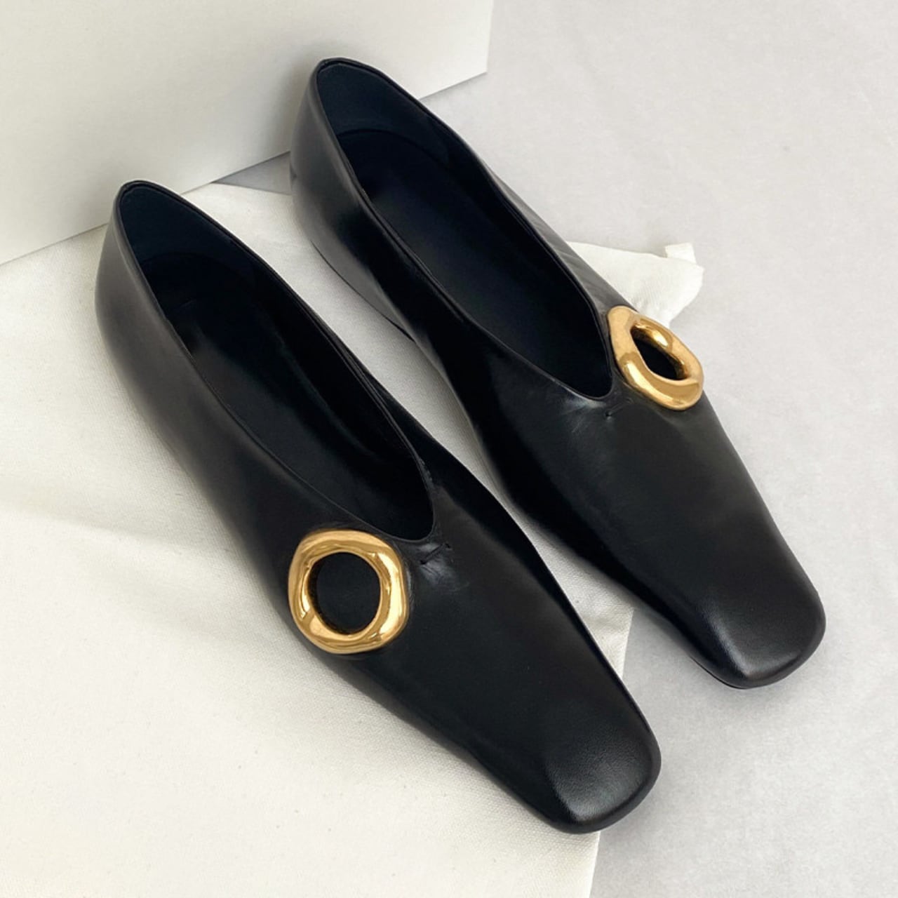 黒とゴールド。永遠に飽きない、最強の組み合わせのスクエアトゥパンプス。