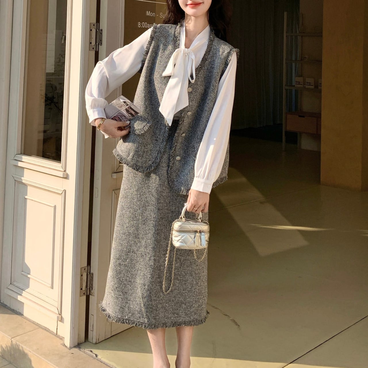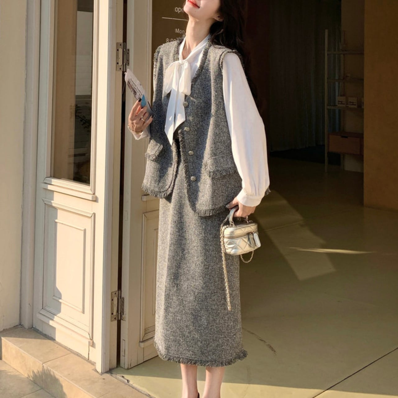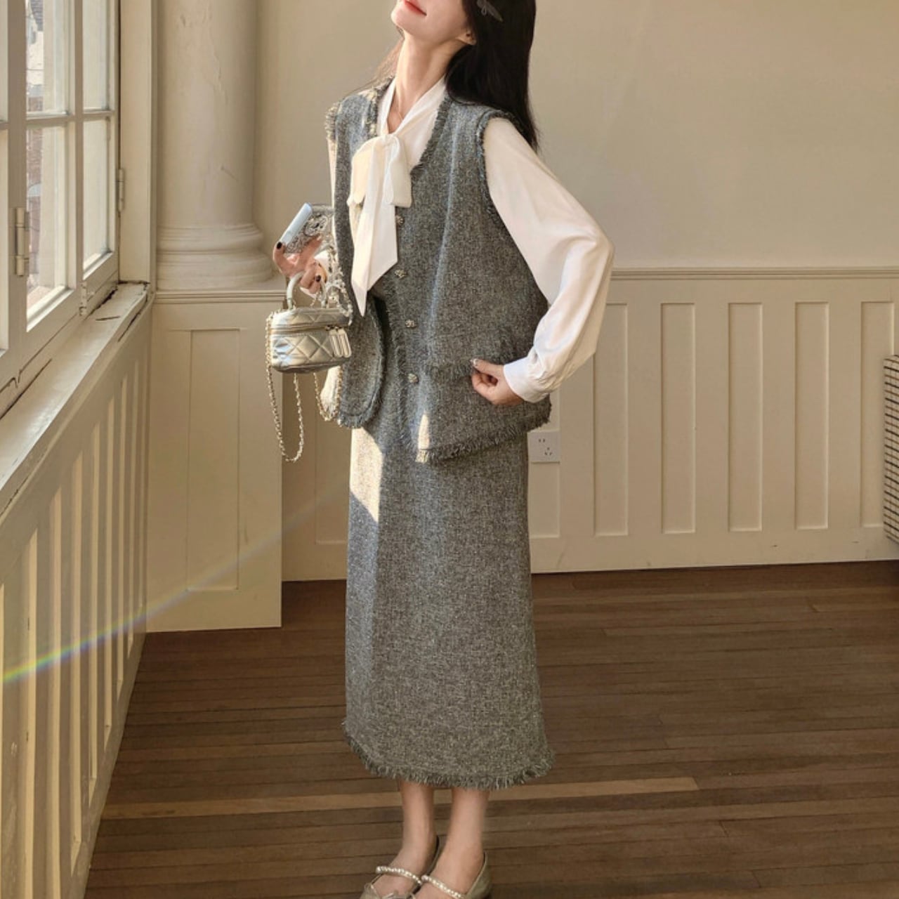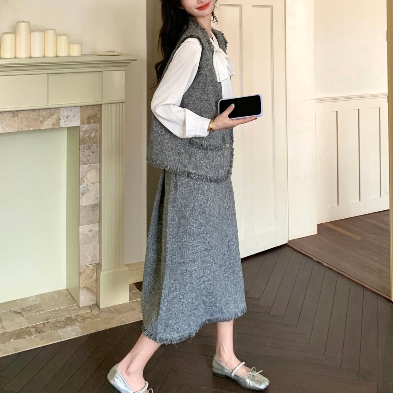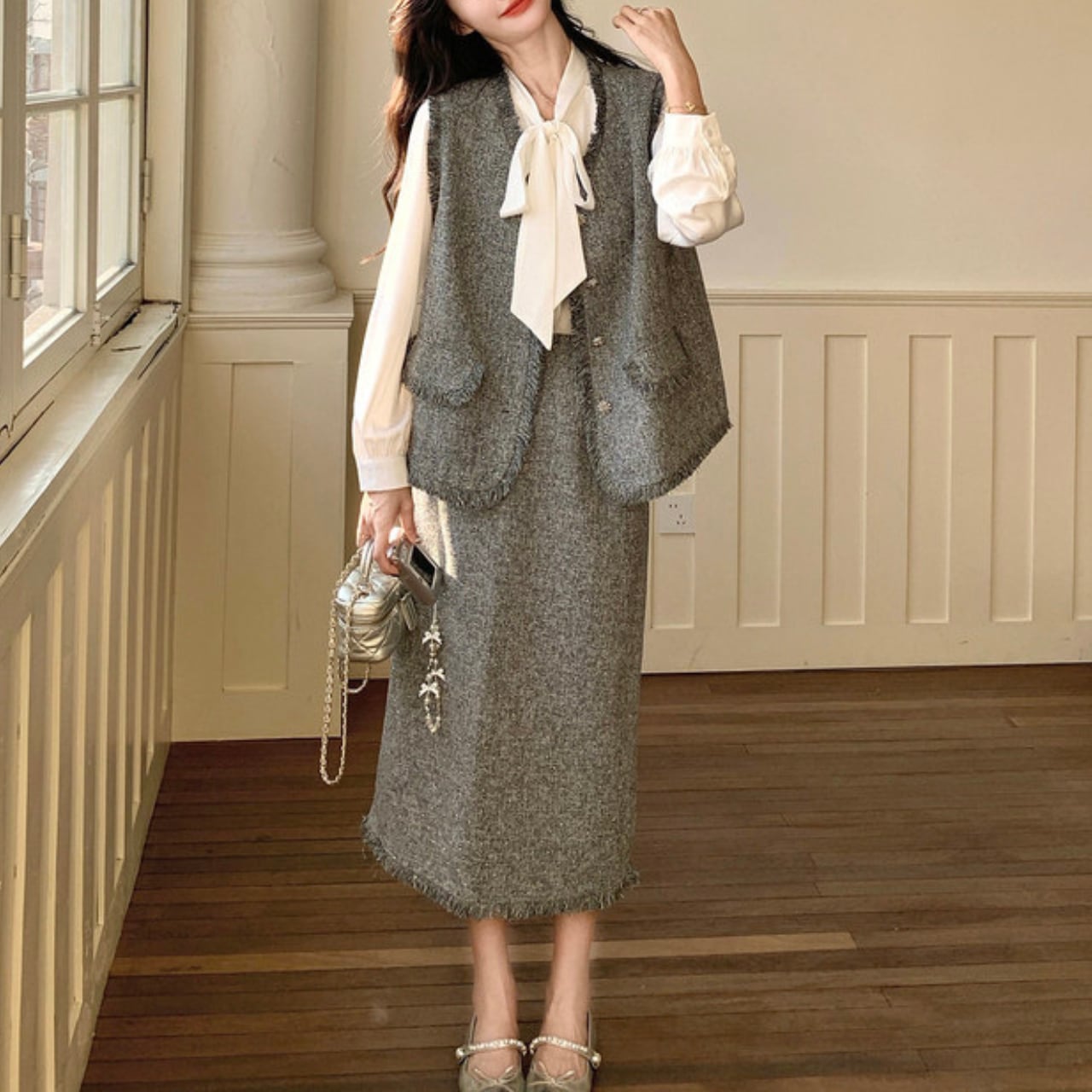 白のリボンタイシャツ、グレーツイードのベスト、そして揺れるフリンジスカートが織り成すハーモニーは、着るだけで凛とした大人の女性を演出します。
