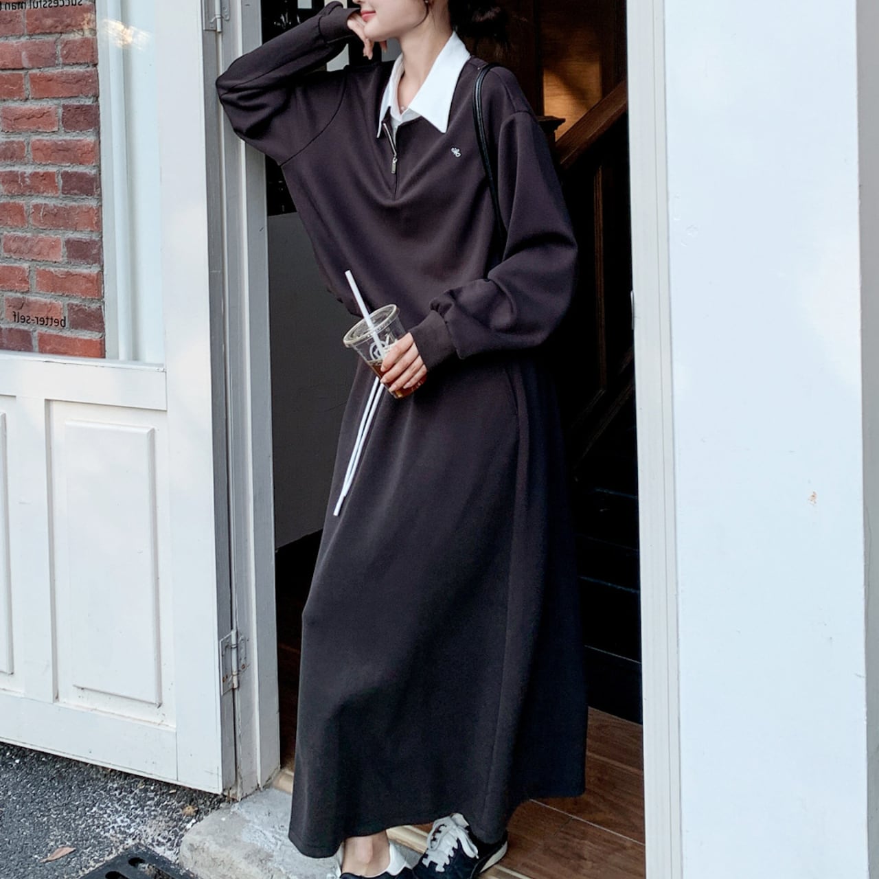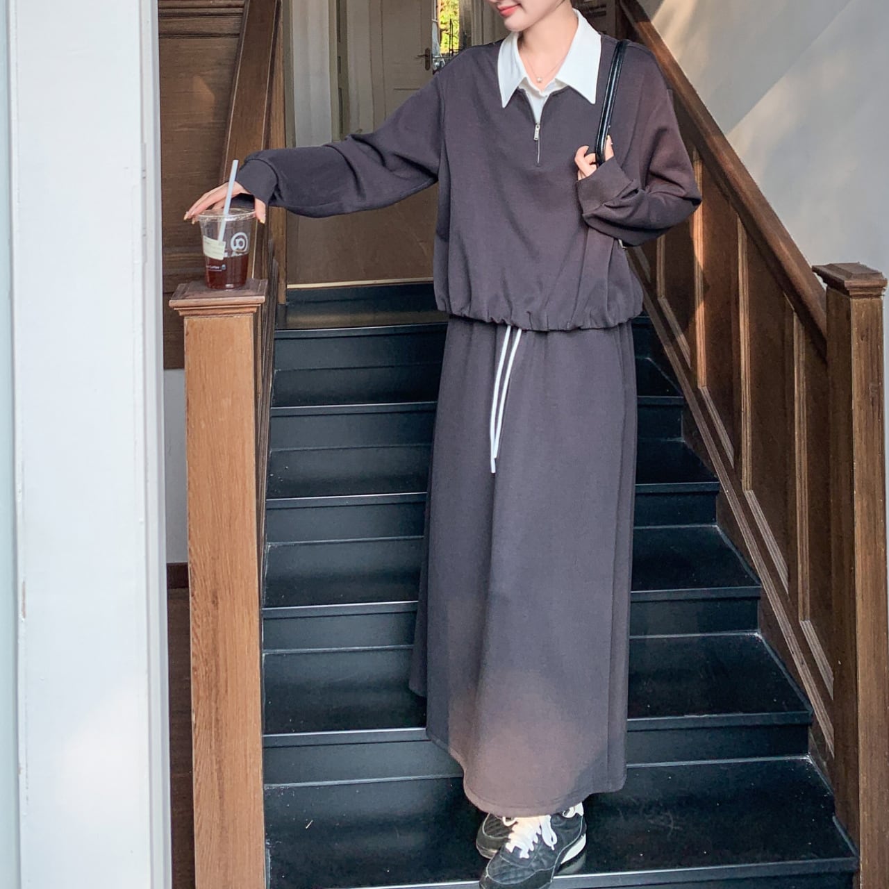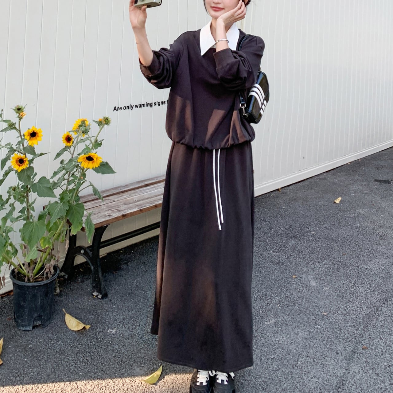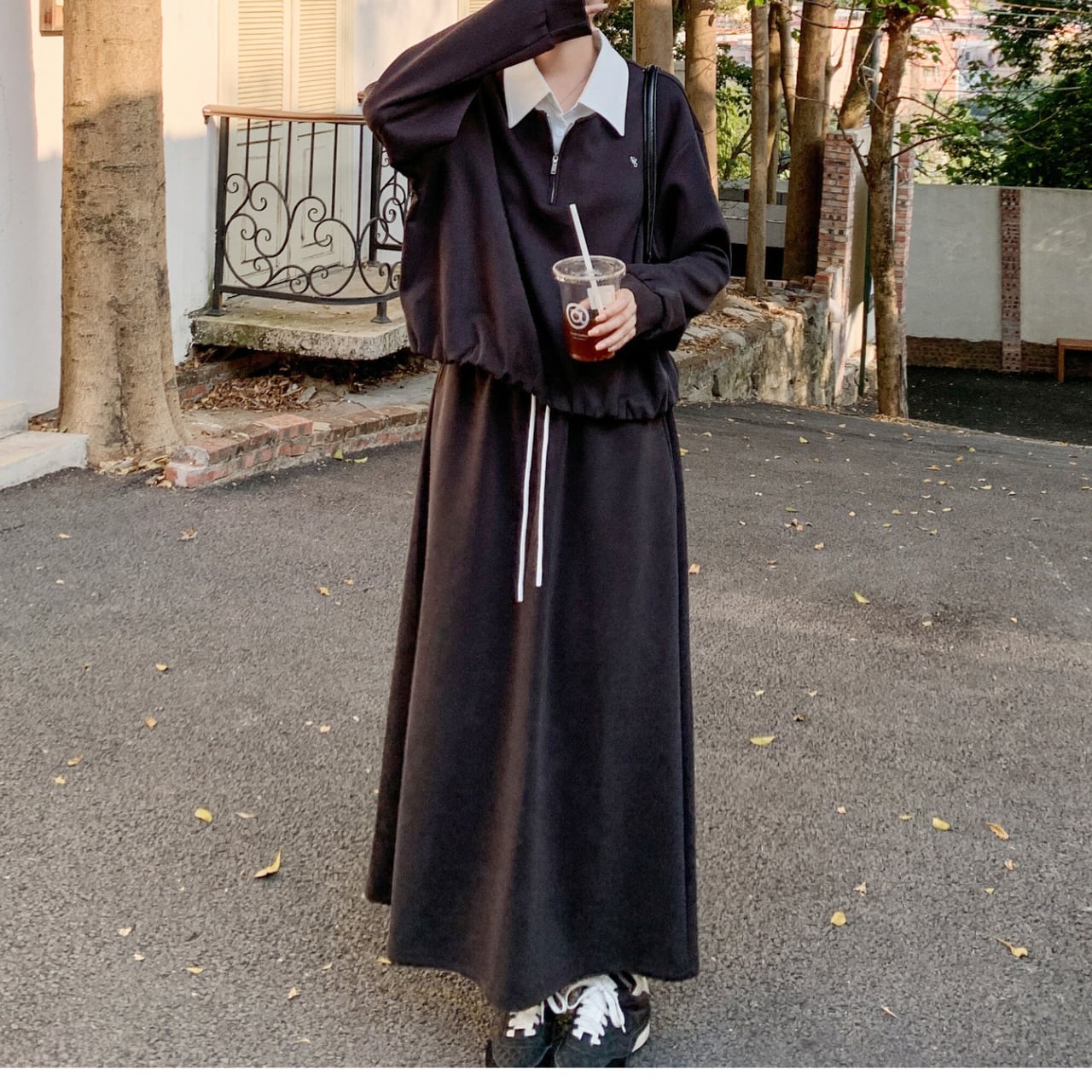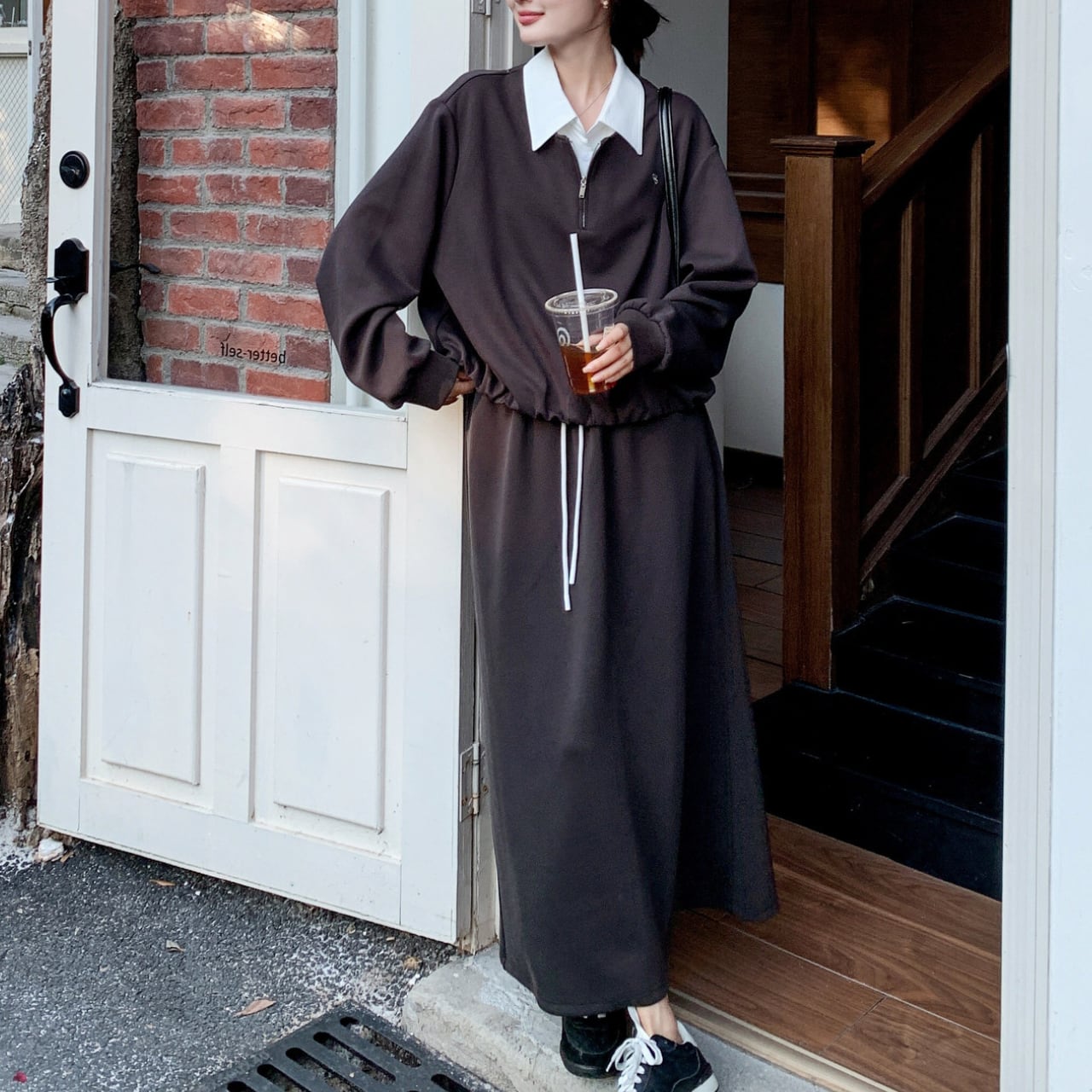 一枚でレイヤードコーデが完成するブラウンレイヤード風スウェットセット。