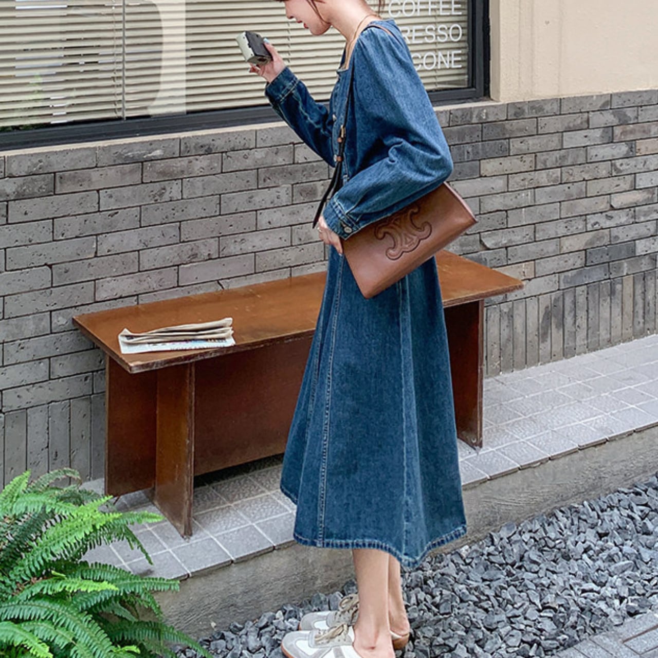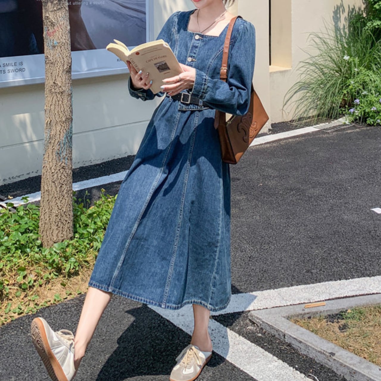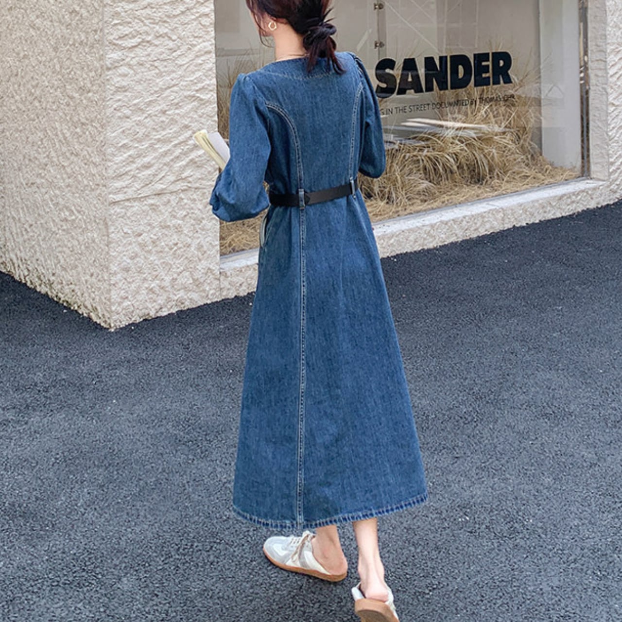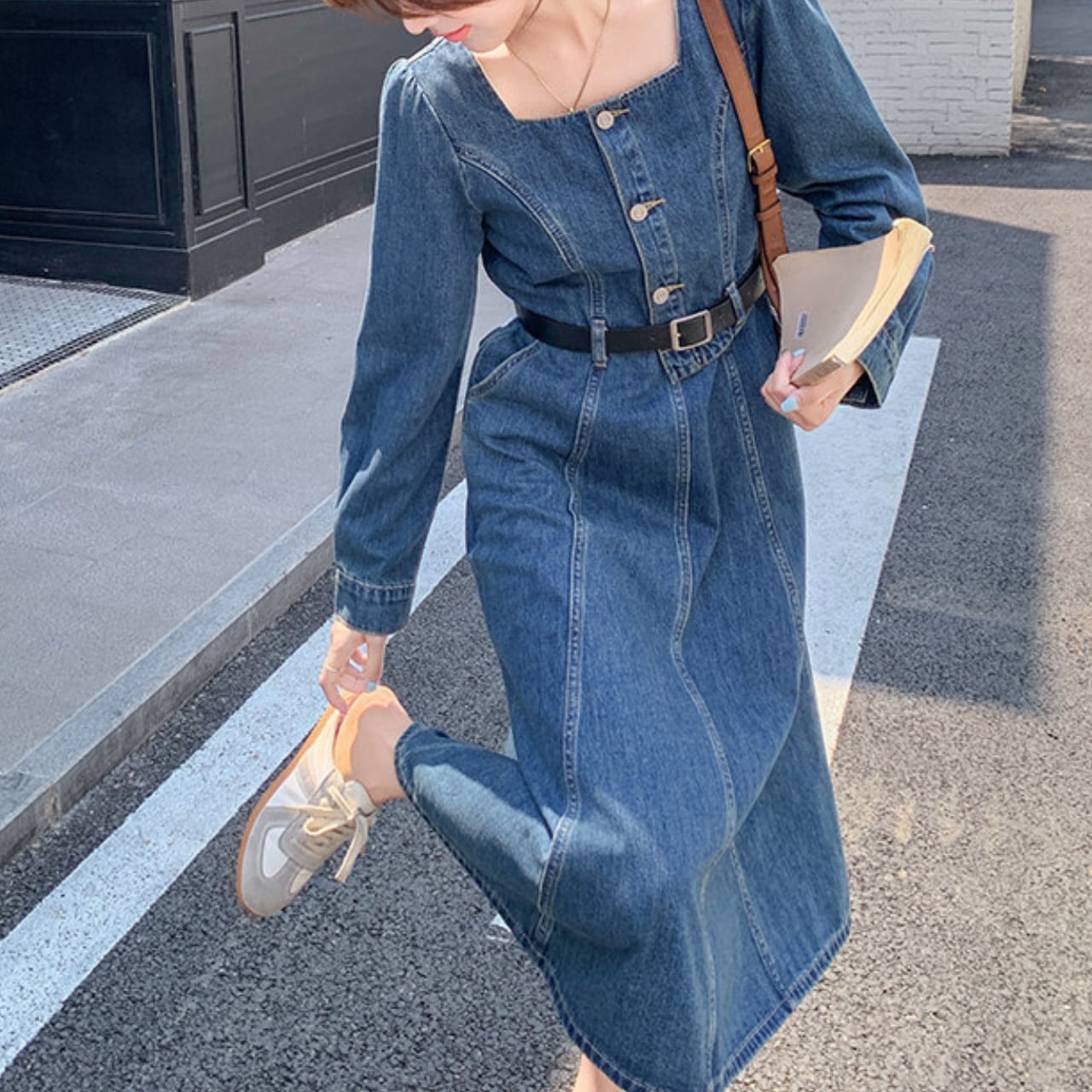 デイリーに着やすく、それでいてしっかりおしゃれに見える長袖デニムワンピース。