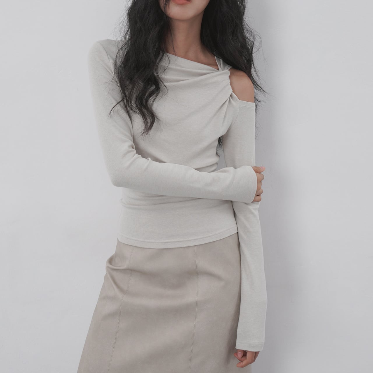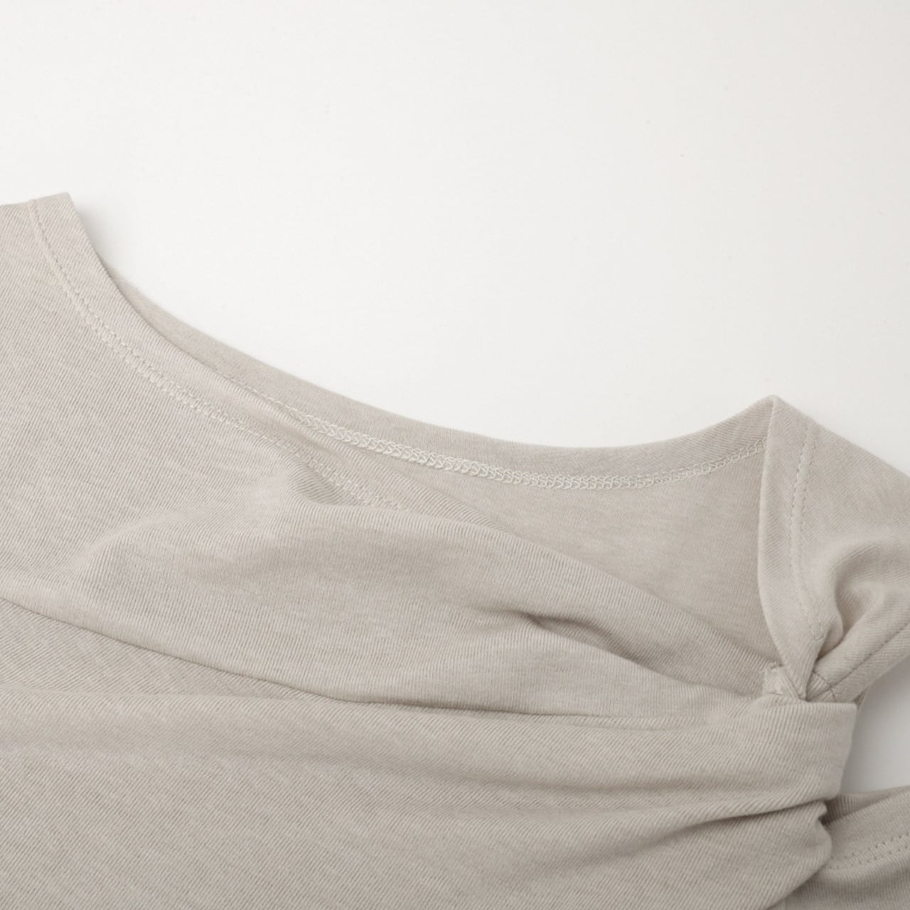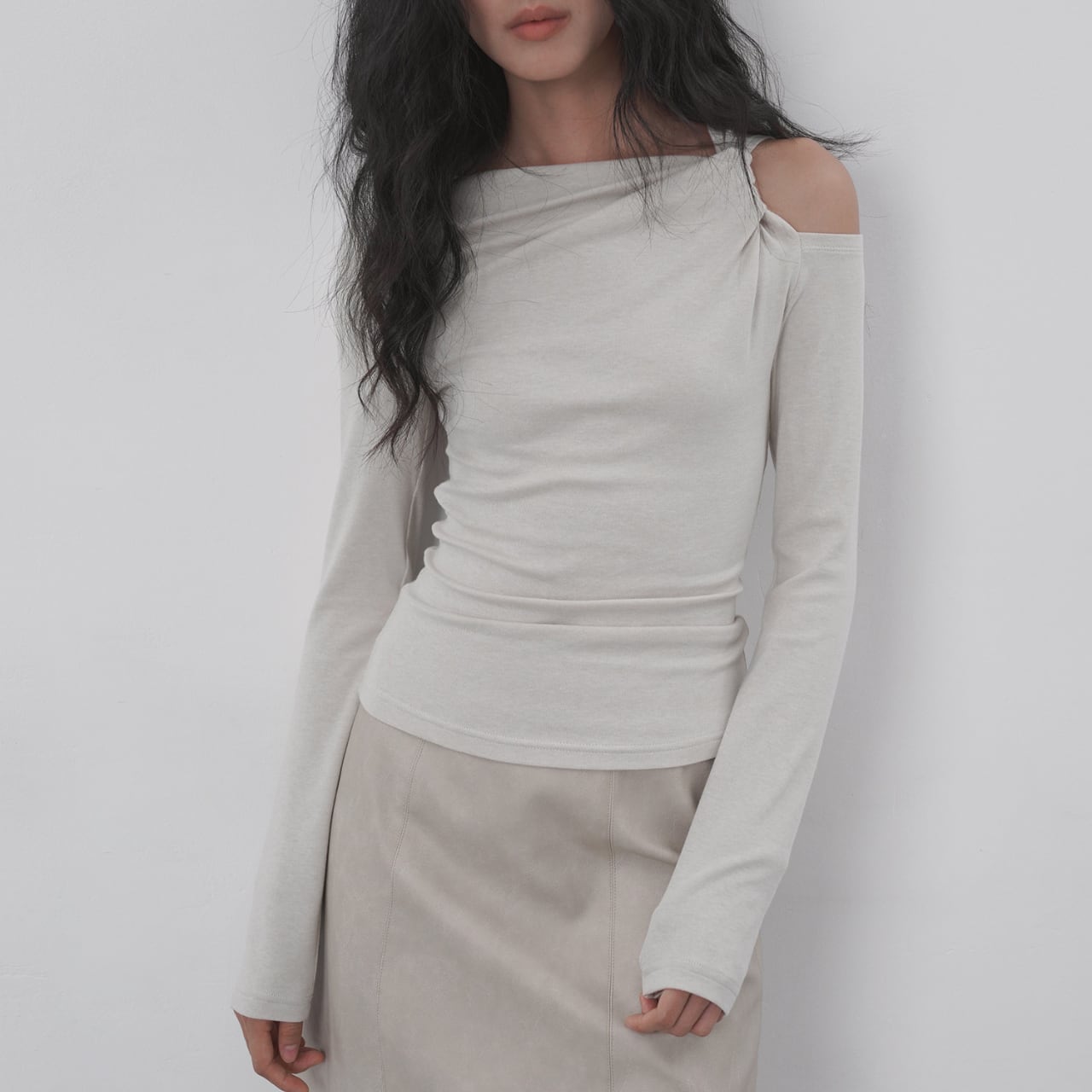 鎖骨の先、左肩をさりげなく解き放つ非対称デザイン。ただそれだけで、どんなボトムスも"コーディネート"になります。