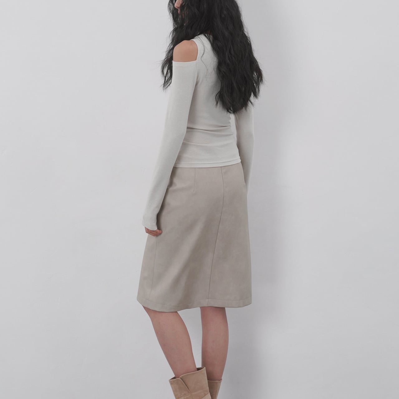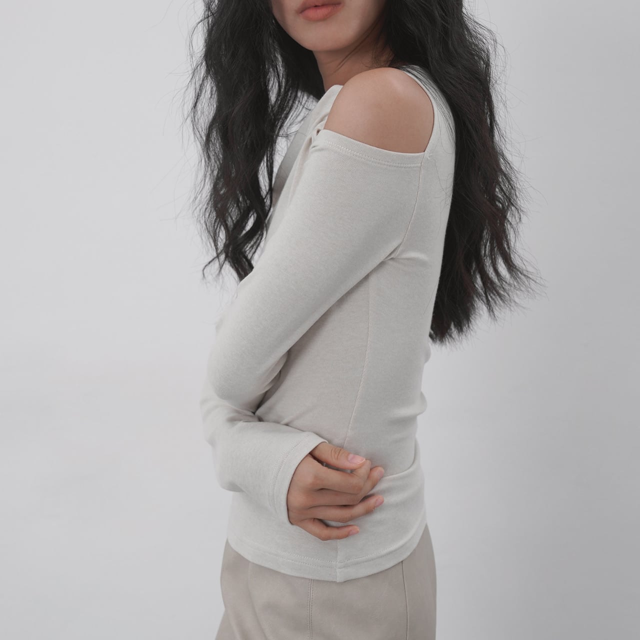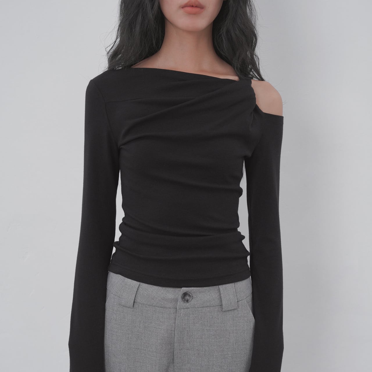 鎖骨の先、左肩をさりげなく解き放つ非対称デザイン。ただそれだけで、どんなボトムスも"コーディネート"になります。