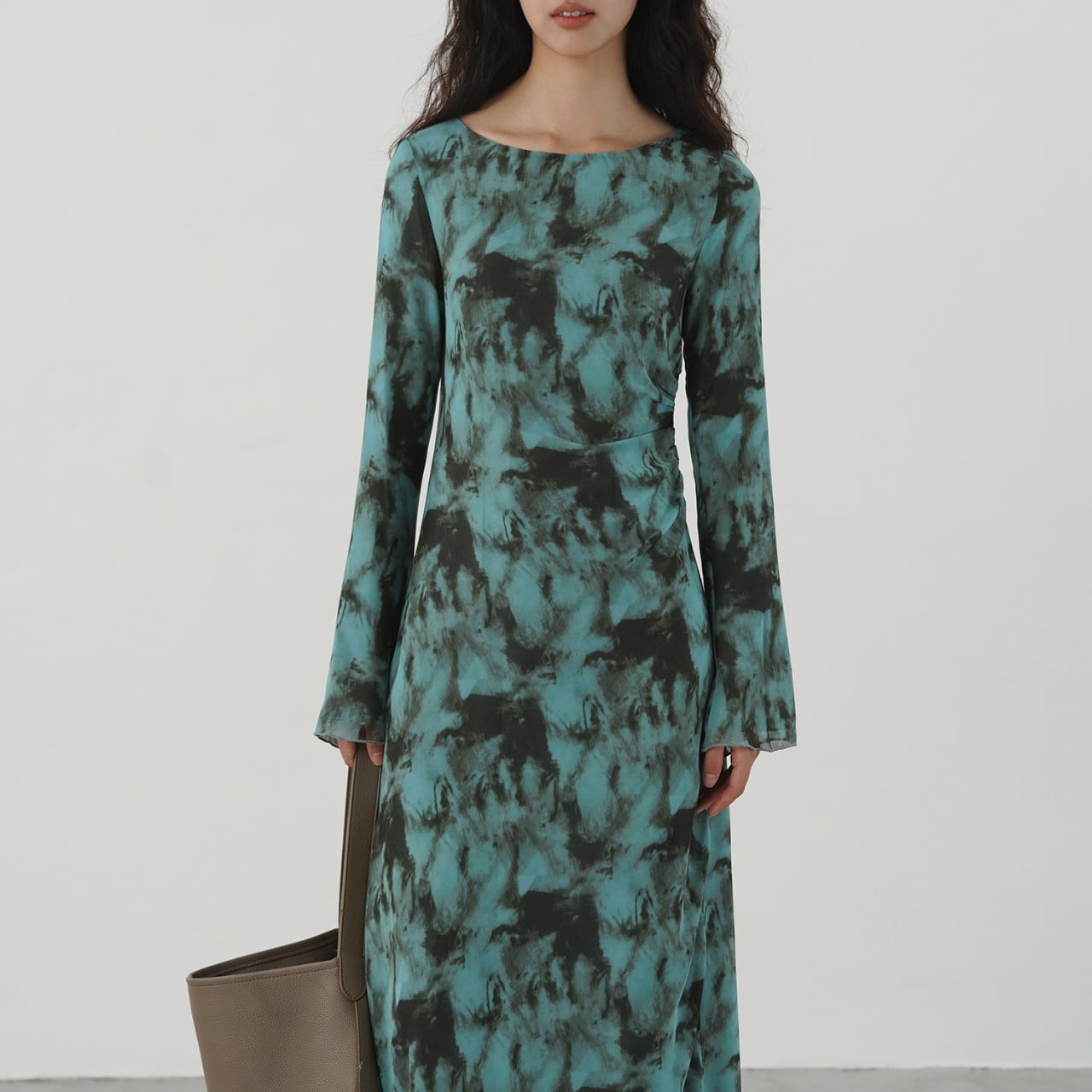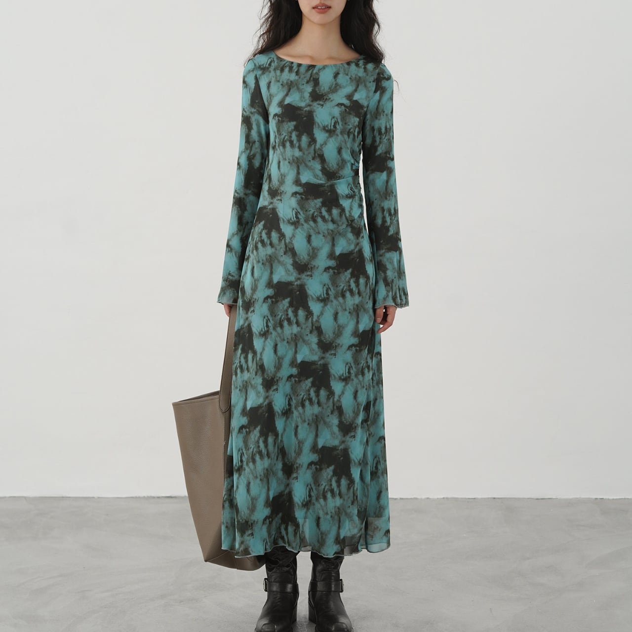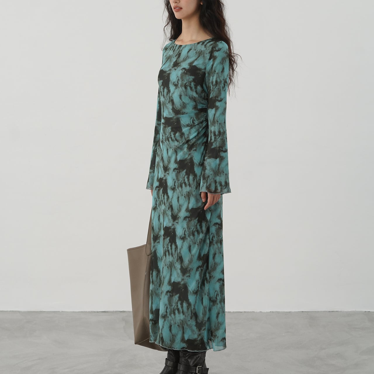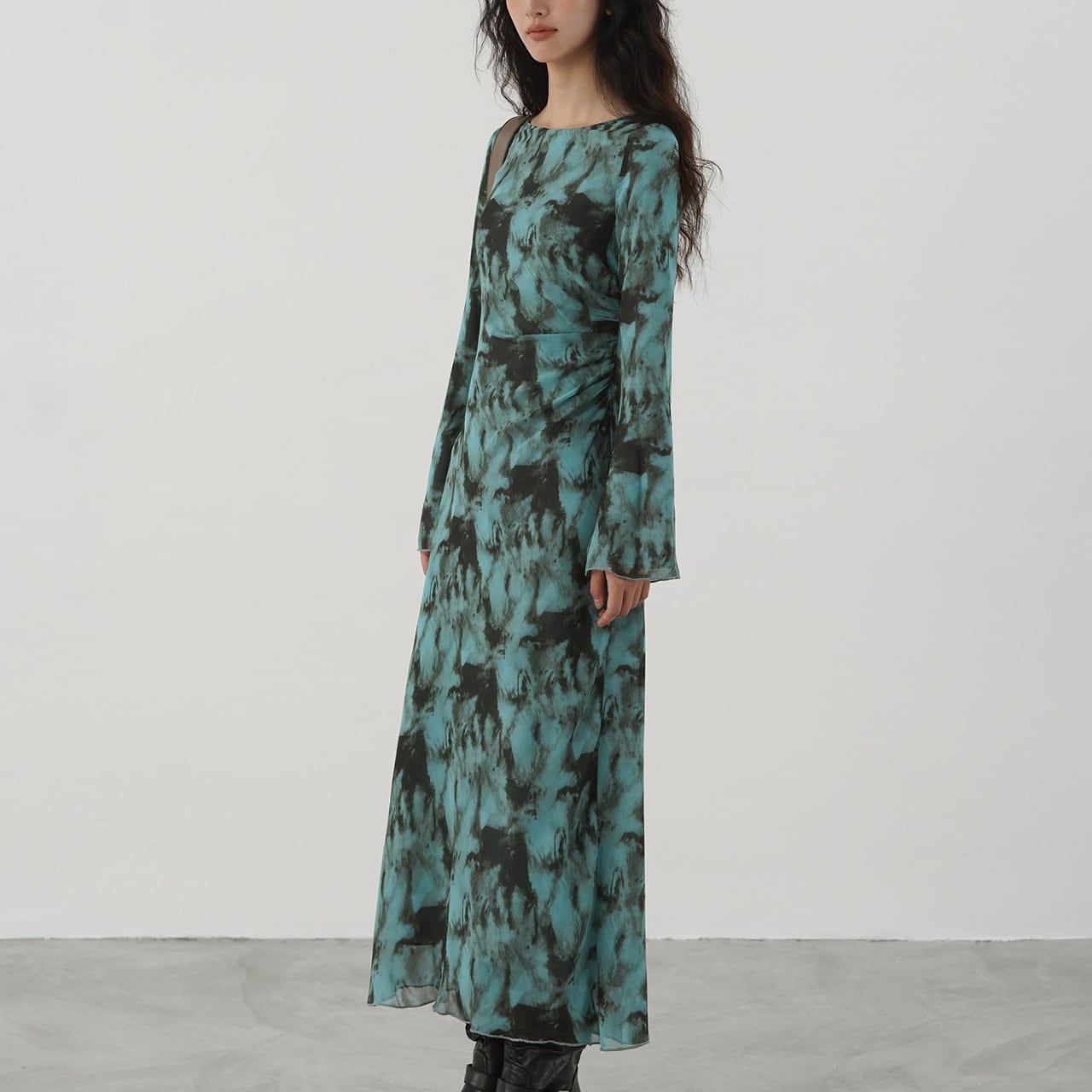 深みのあるブルーグリーンに滲むような抽象プリントが印象的なロングワンピース。