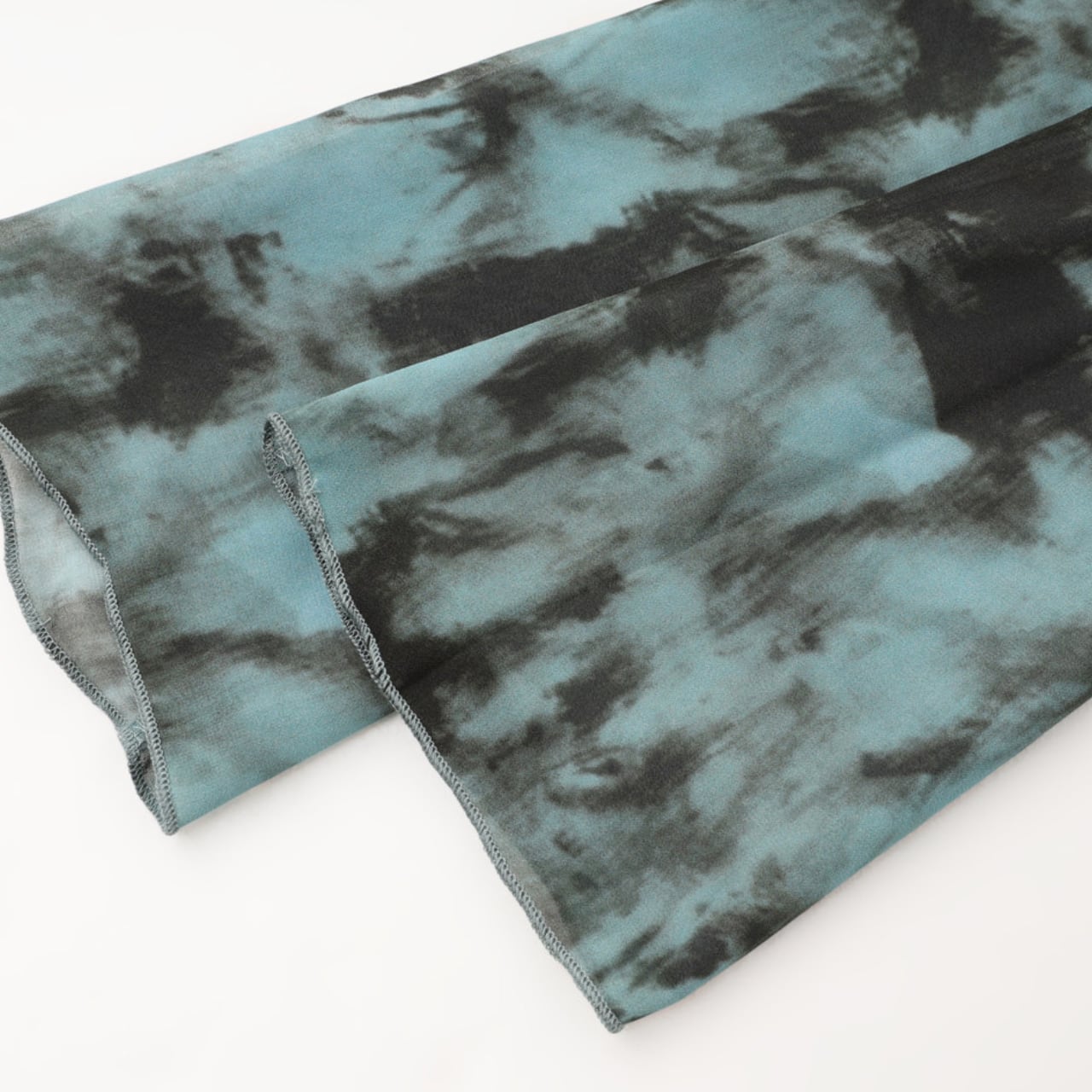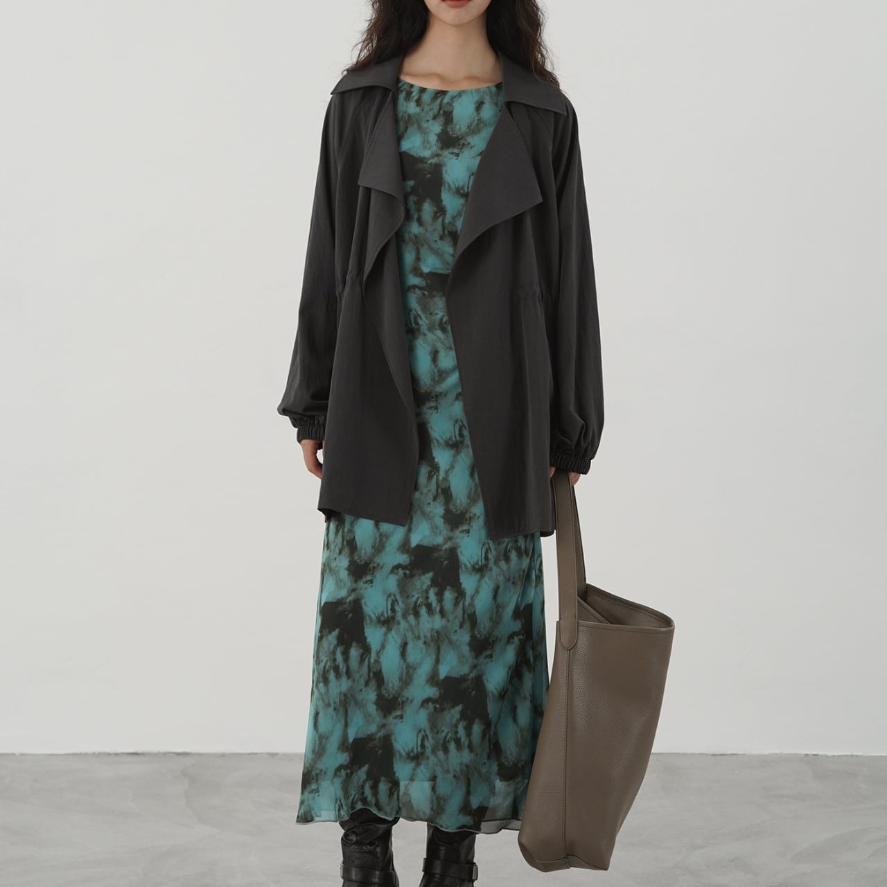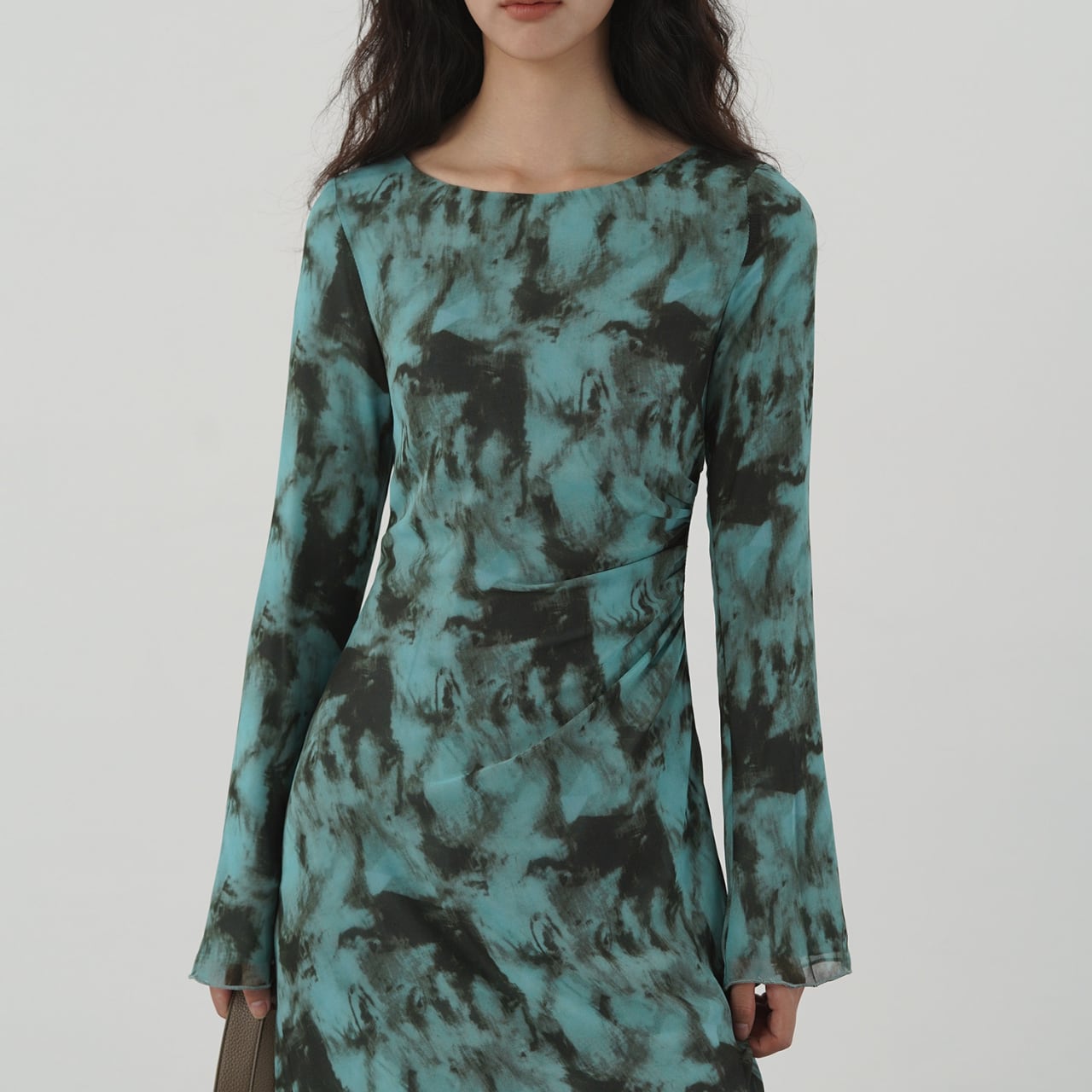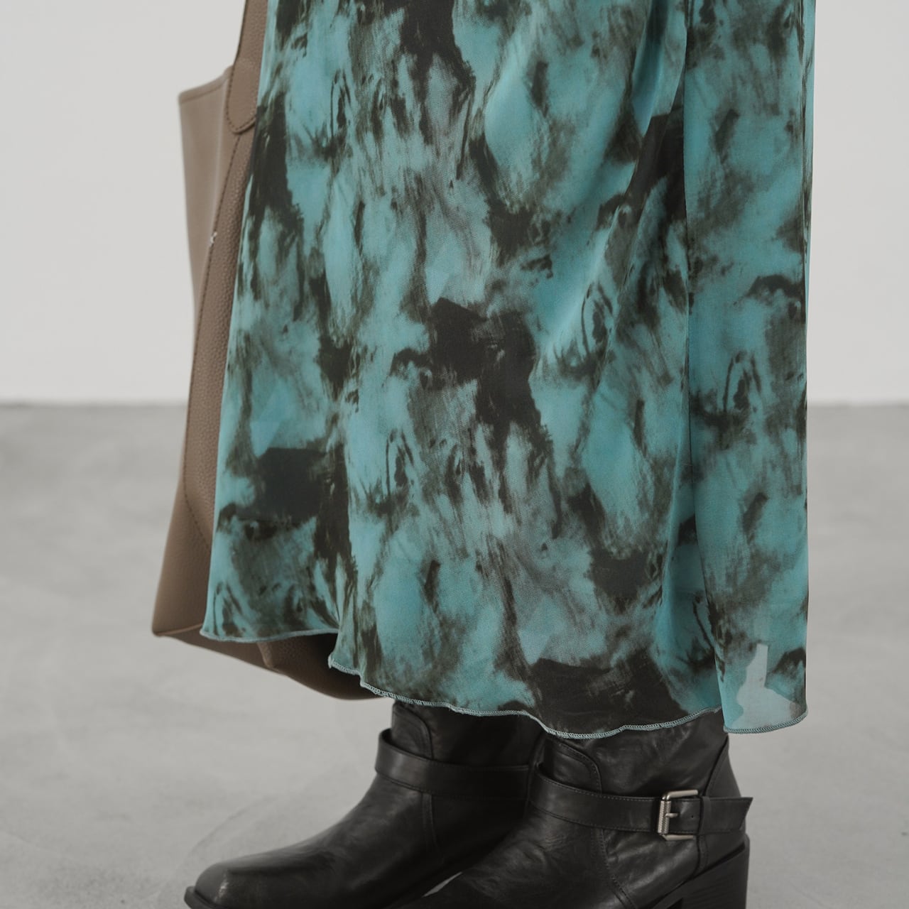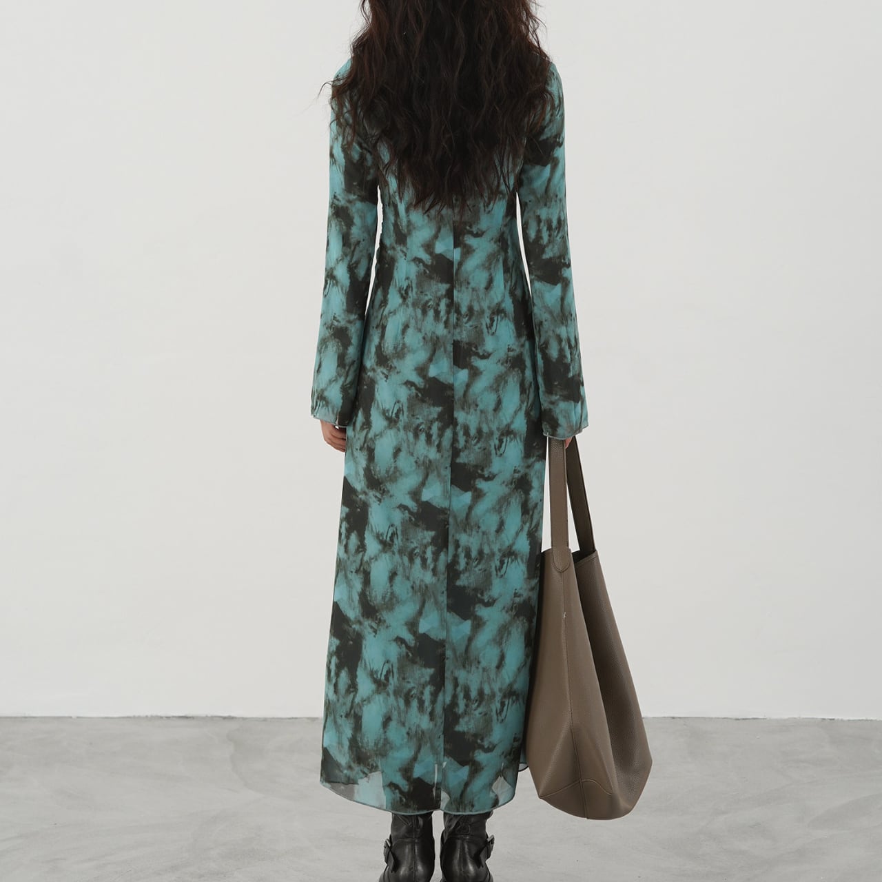 深みのあるブルーグリーンに滲むような抽象プリントが印象的なロングワンピース。