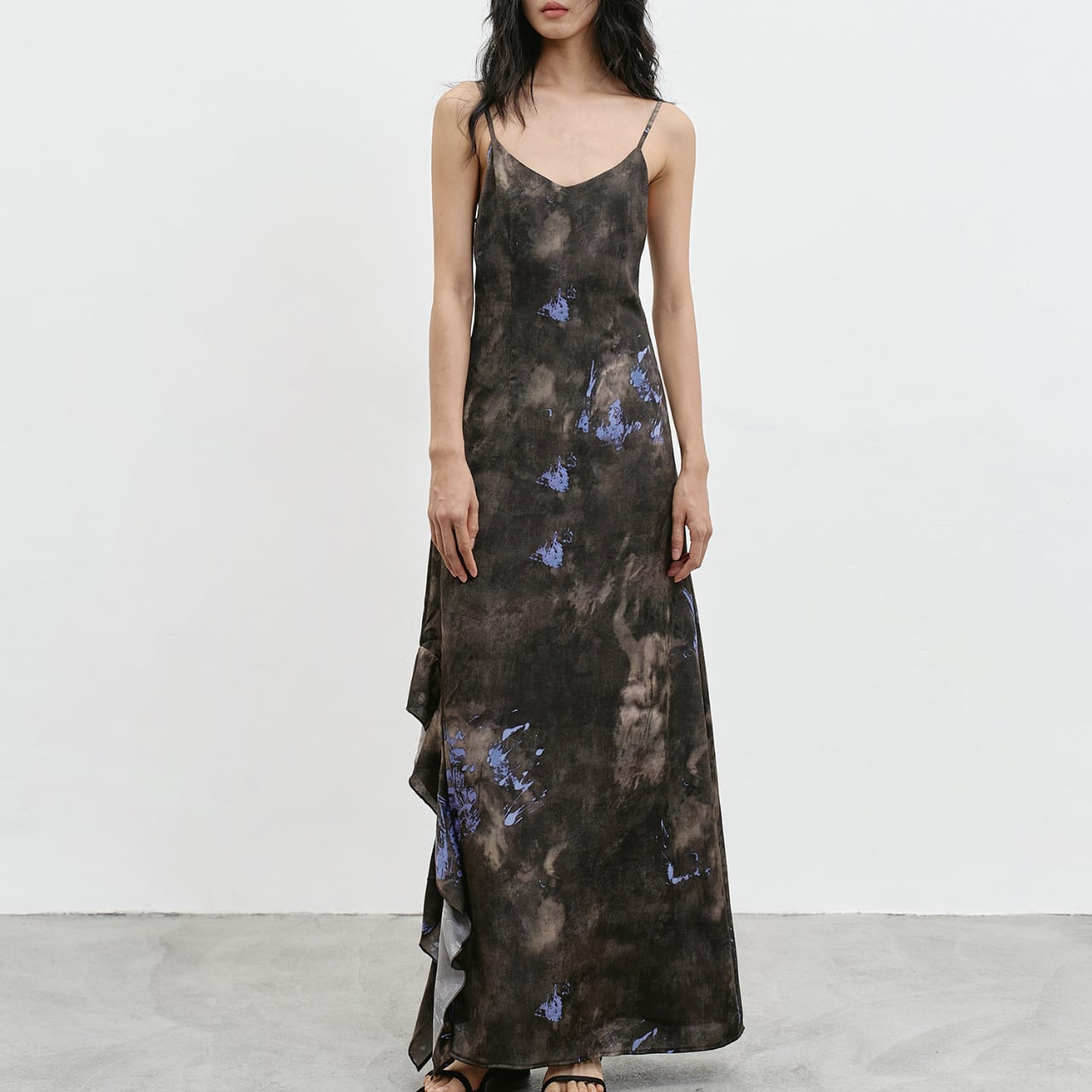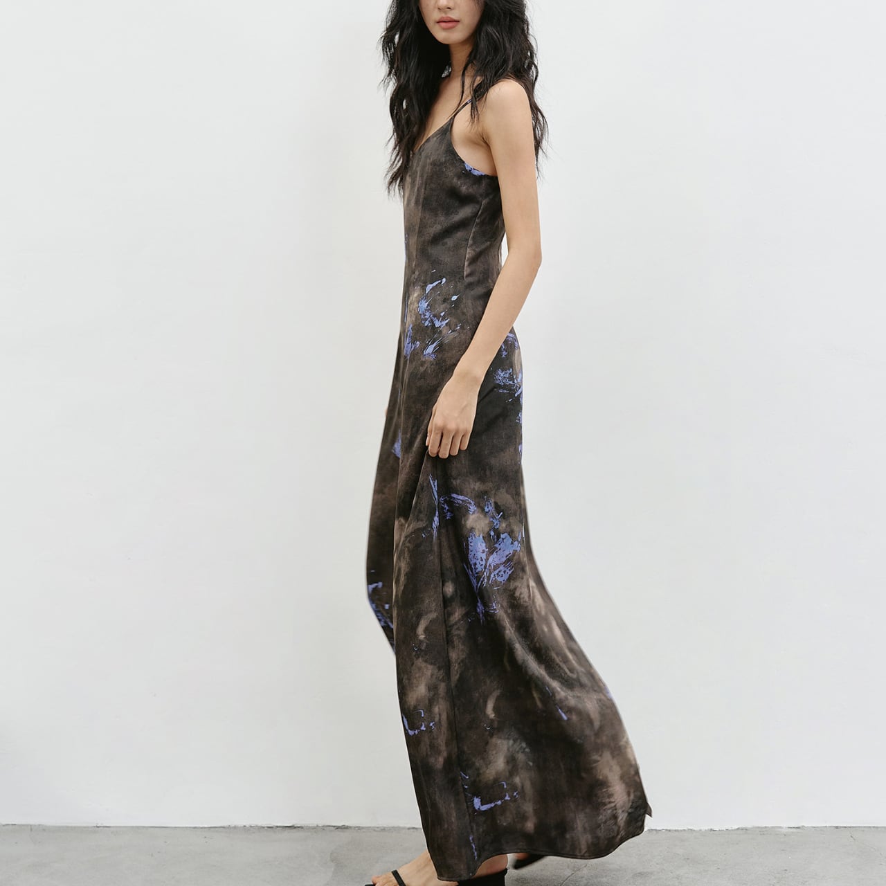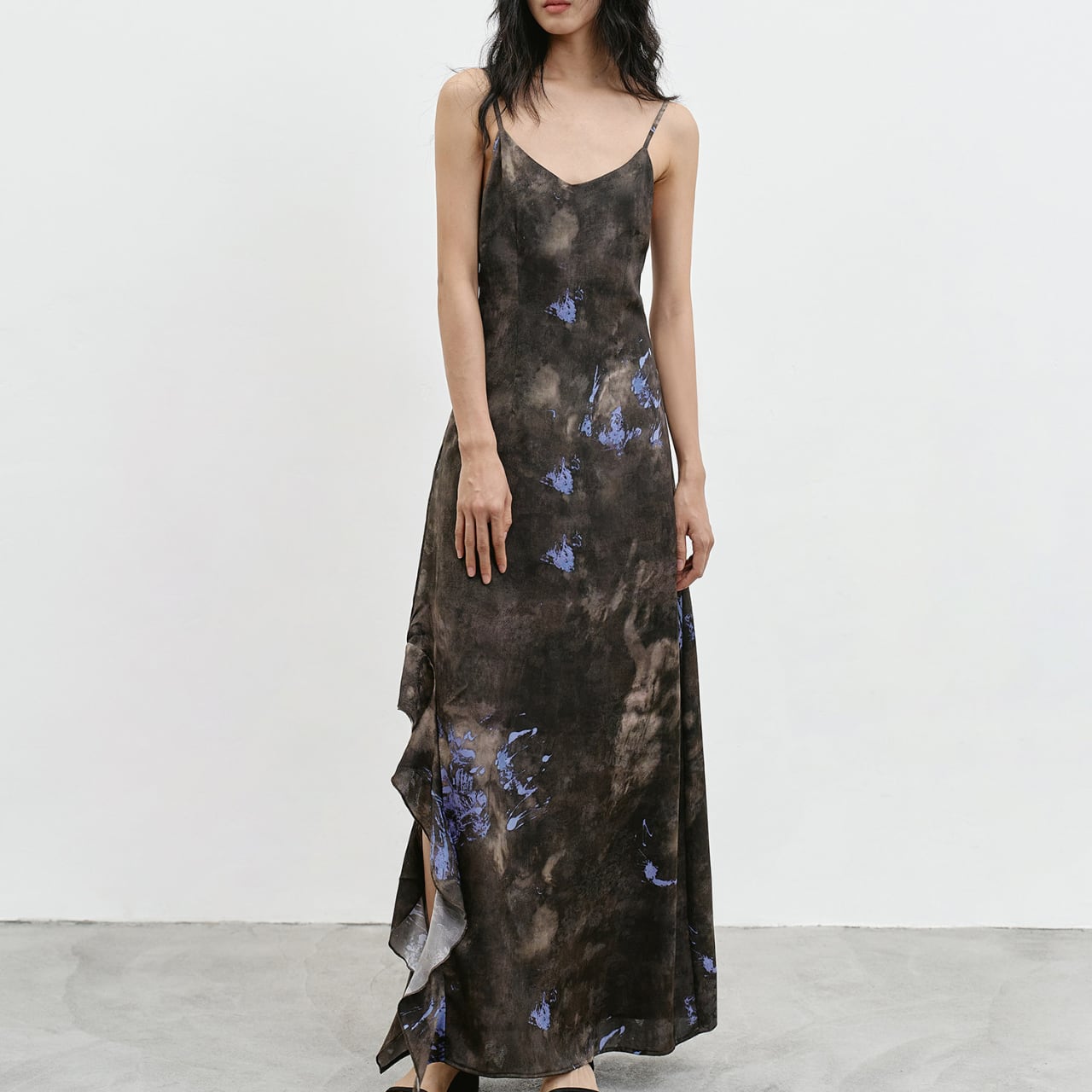 滲むような墨色のベースに、青紫の花々が溶け込む——まるでキャンバスに落とした絵の具が布の上で息づくような、唯一無二のアートプリントが印象的なサスペンダーマキシワンピースです。