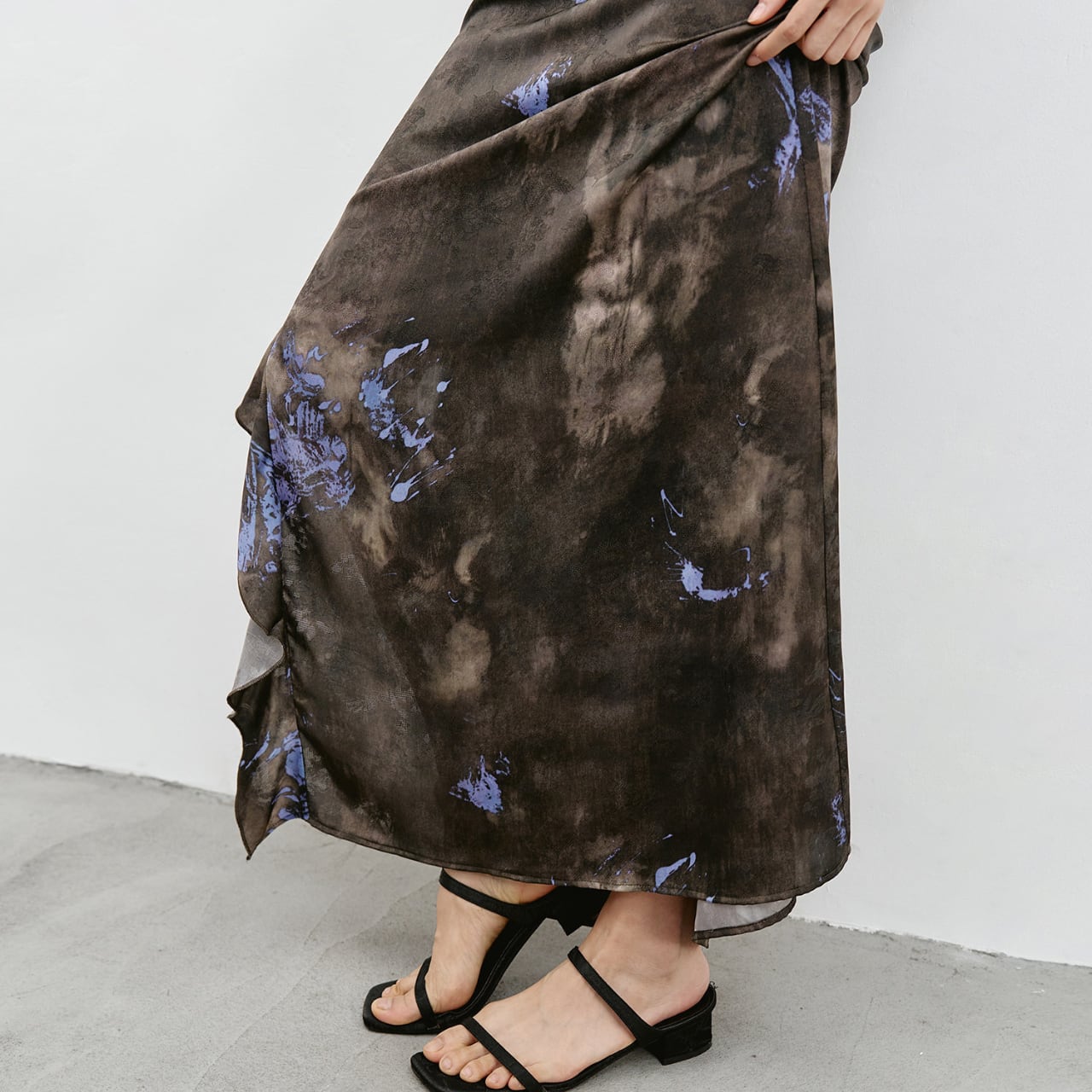 裾に向かって広がるフレアと、アシンメトリーに揺れるフリルが、歩くたびに表情を変え、動きに詩情を添えます。