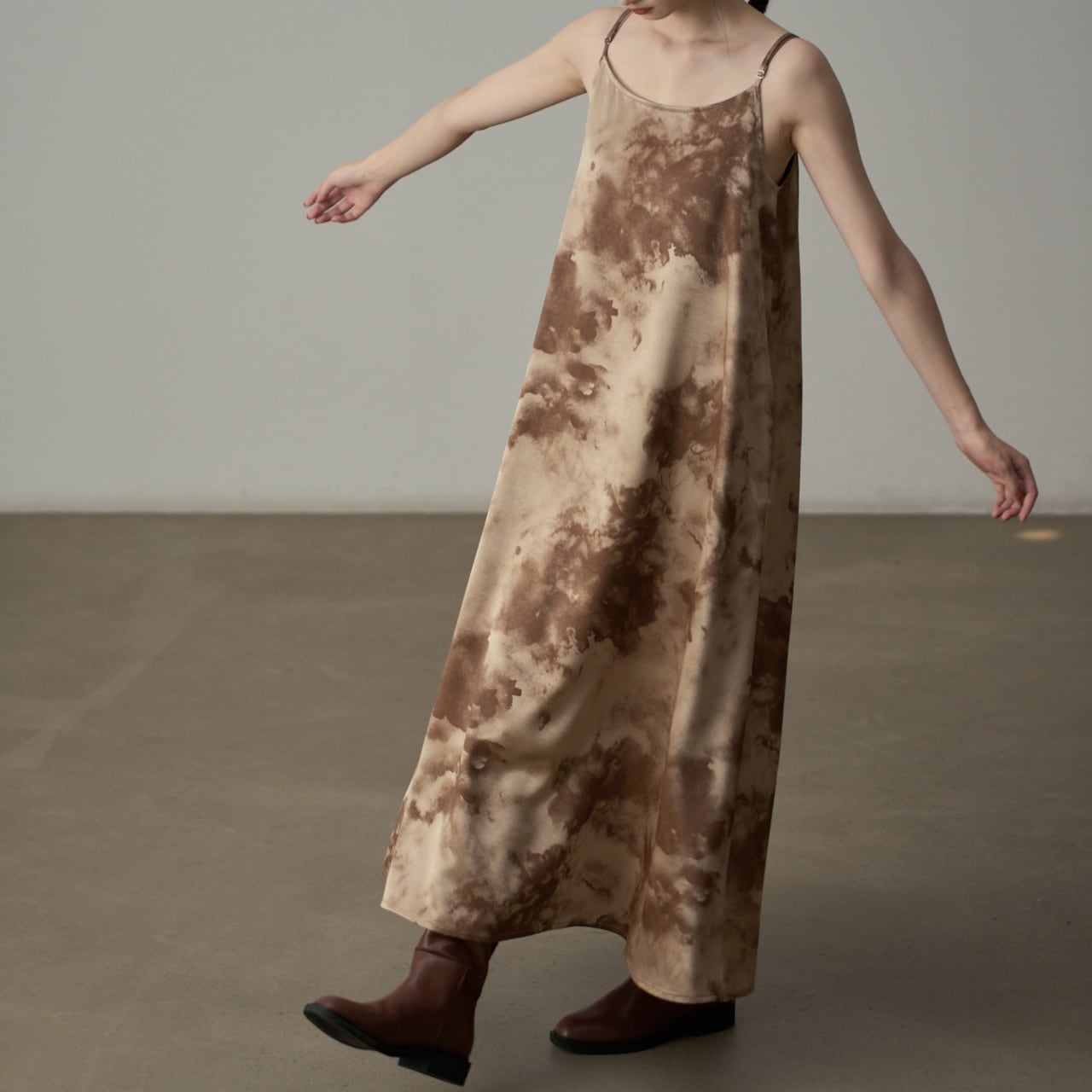 アートのように滲むインク調プリントが印象的な、サテン素材のサスペンダードレス。